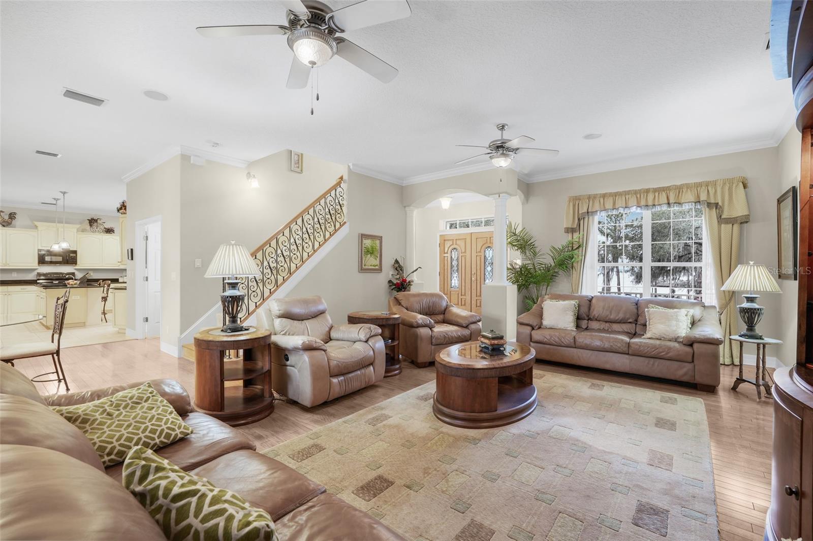 LAKEFRONT CUSTOM HOME ON LAKE LOUISA WITH 100 FT ON THE CLERMONT CHAIN OF LAKES. THE PROPERTY HAS A DOCK AND ELECTRIC BOAT HOIST. Beautiful screened 20X32 in ground pool. FULLY FURNISHED INCLUDES ALL KITCHEN ITEMS, LINENS, ECT. TRULY A TURN KEY HOME. ONLY ONE OWNER!!!! EXQUISITE SUNSETS. PEACE AND TRANQUILITY. As you walk in the beautiful front double doors with etched glass you will see archways throughout and the living room is very open and airy with two ceiling fans, real hard wood floors, crown molding and a pocket slider opening up to the covered, screened lanai over looking the pool. The breakfast nook is off to the right with a beautiful bay window. The kitchen has beautiful custom built cabinets with crown molding, an island, granite counter tops, crown molding around the ceiling, can lighting, pendant lighting, under the counter lighting and an advantium microwave. The formal dining room has a tray ceiling and windows facing the lake. The Master Suite has a ceiling fan, a huge walk-in closet, Tray ceiling and French doors that open to the lanai and pool. The Master Bath has a tiled walk in shower and a huge soaker tub and dual cultured marble sinks. The second bathroom is near the kitchen and has a door to the pool area, tiled shower and a cultured marble sink. The utility room is inside and has a washer and dryer. As you walk up the stairs there is a bonus room with a ceiling fan and has lots of windows, a niche and sitting area. Bedroom two has a ceiling fan, carpet and a walk-in closet. Bedroom three has a ceiling fan, carpet and a walk-in closet. Bathroom three is a tub shower combo, tile and a cultured marble sink. The front exterior has beautiful landscaping, huge 1/2 wrap around porch to watch the lake life and beautiful views of Lake Louisa. The house exterior is brick and Hardie Plank Siding. The two car garage is a side entry and has a garage door opener. THE ROOF is 2022, POOL PUMP IS AROUND 3 YEARS OLD AND A/C IS 7 YEARS OLD. This property is close to shopping, schools and major highways and attractions