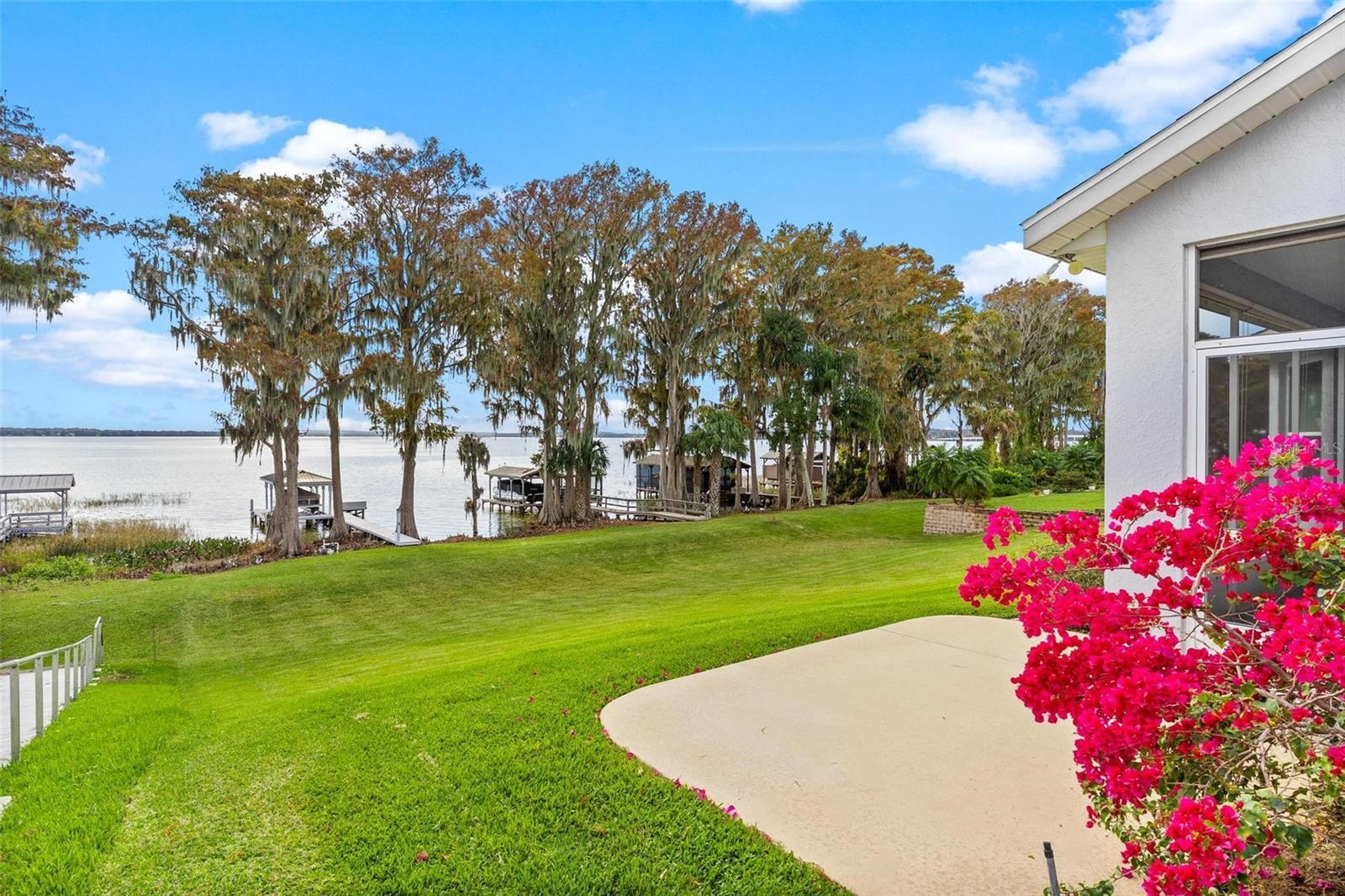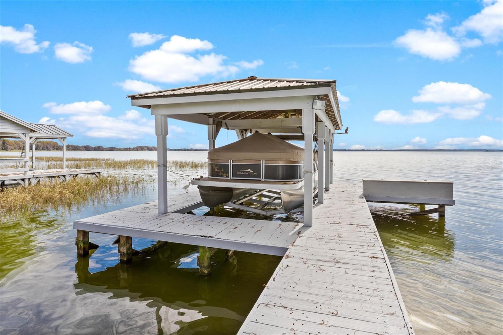 Under contract-accepting backup offers. Your dream lakefront lifestyle awaits on the Harris Chain of Lakes! Located in the gated 55+ community of Royal Harbor, this exceptional home sits directly on beautiful Little Lake Harris, offering breathtaking panoramic views, stunning sunsets, and easy access to the full chain of lakes for boating, fishing, sightseeing, and waterfront dining. Enjoy the convenience of your private covered boat house with lift and dock, making lake days effortless and enjoyable. From the moment you step inside, the beauty of the lake fills the home with light and tranquility. The Great Room opens to a wall of glass, leading to the covered and screened lanai where you’ll spend countless hours enjoying soft breezes, peaceful mornings, and breathtaking evenings. The spacious Kitchen is open to the Great Room and features granite counters, stainless appliances, solid wood cabinets, breakfast bar, and two pantries, while the breakfast nook offers more sweeping lake views. The Primary Suite is a private retreat with spectacular waterfront views, slider to the lanai, two walk-in closets, and spa-style bath with double vanity, soaking tub, large walk-in shower, and linen closet. The split bedroom design ensures comfort and privacy for guests. Additional upgrades include: solar panels (2020), double-pane storm-rated windows and sliders (2021), engineered hardwood flooring, tile in kitchen and baths, spacious laundry room, and lake-fed irrigation to maintain the beautiful park-like yard with cypress trees and abundant wildlife. Royal Harbor offers a welcoming, active adult lifestyle with clubhouse, pool & spa, fitness center, tennis & pickleball, walking trails, RV/boat storage, and numerous social activities. This move-in ready, beautifully maintained home offers everything you’ve been waiting for. Come home to lake life at Royal Harbor. Call today for your private showing!