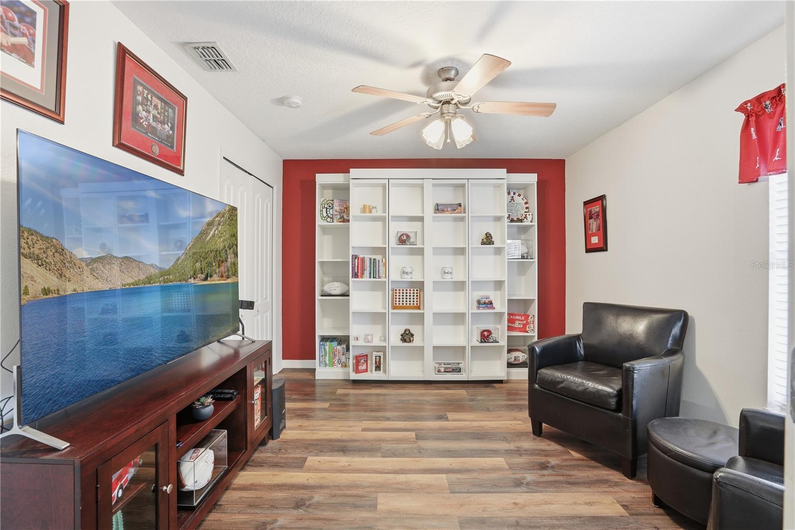 Welcome to 1023 Princeton Drive, a beautifully maintained four-bedroom, three-bath pool home with a versatile den or office space, situated in the highly sought-after, gated community of College Park. This home features a unique and thoughtfully designed layout. The homeowners have removed walls to seamlessly connect the kitchen, family room, and dining room, creating an open concept that enhances the flow between the main living areas. The spacious kitchen is equipped with a double pantry, stainless steel appliances, a large serving bar, a double oven, and ample space for casual eat-in dining, making it perfect for both everyday living and entertaining guests. The home offers a three-way split bedroom plan. The primary suite serves as a private retreat, featuring generous space, double closets, and double sinks. A second wing contains two secondary bedrooms and a full bath, while a third houses the fourth bedroom and a full bath, providing privacy and flexibility for family or guests. Custom touches are evident throughout the residence, including unique blinds and cornices in the front rooms, a sliding “barn-type” door between the primary bedroom and bath, and a built-in Murphy bed with custom shelving in the fourth bedroom. Glass doors throughout the home open to the lanai and the expansive pool area. The pool deck offers space for both lounging and dining, making it an ideal spot for entertaining. Enjoy added peace of mind with recent upgrades including a roof replacement in 2021 and a new pool pump installed in 2024. College Park boasts a prime location, conveniently close to shopping, entertainment, golf courses (with one located just across the street), and a short drive to the Clermont Turnpike entrance.