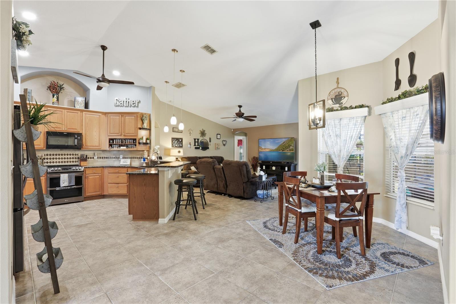 - Ceiling Fans(s), Eat-in Kitchen, High Ceilings, Kitchen/Family Room Combo, Open Floorplan, Primary Bedroom Main Floor, Solid Surface Counters, Walk-In Closet(s)