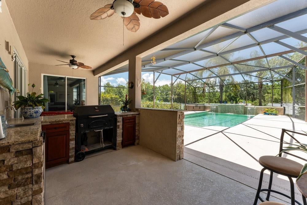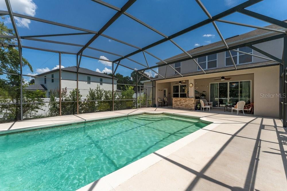 Located within the gated community of Spring Ridge Estates, this pool home offers a layout designed for everyday living, with indoor spaces thoughtfully centered around the outdoor living area. Set on a quiet cul-de-sac lot with conservation and water views, the home provides a sense of privacy while remaining conveniently located just minutes from downtown Eustis and Mount Dora, as well as shopping, dining, and major commuter routes. As you enter through the double front doors, you are welcomed by a foyer with soaring 20-foot ceilings and a striking chandelier, immediately drawing your eye straight through the home to the outdoor living space beyond. The open floor plan flows naturally from the main living areas outward, reinforcing the home’s indoor-outdoor design and sense of openness. The first-floor primary suite offers private, direct access to the covered outdoor area, along with a spacious en-suite bath and walk-in closet. The kitchen overlooks the main living area and features an island, breakfast bar, dining space, and generous cabinetry. Upstairs, the home features four additional bedrooms, a second living room, and a large bonus/game room that can easily function as a media room, home office, or fifth bedroom. From the upper level, there are water and conservation views, adding to the home’s sense of space and privacy. The outdoor living area includes a screened pool with waterfall feature, a covered lanai, and an outdoor kitchen with a full pool bath, offering direct access from the pool and living area—ideal for year-round Florida enjoyment. With over 4,000 square feet, multiple living spaces, and a thoughtful layout, this home offers exceptional flexibility for a variety of lifestyles. Located within one of Eustis’ most desirable gated communities and close to Highways 441, 44, and 429, this property combines space, privacy, and convenience in a setting that is increasingly hard to find.