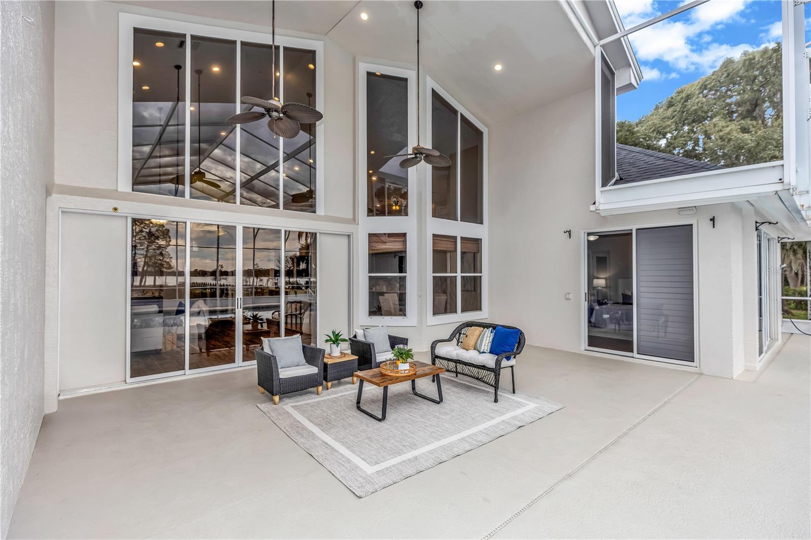 Under contract-accepting backup offers. Experience the pinnacle of lakefront luxury in this stunning 5,418 sq. ft. estate situated on the pristine, spring-fed shores of Lake Joanna. This meticulously updated home features soaring vaulted ceilings and an expansive loft area that creates an atmosphere of grand architectural scale. Peace of mind is integrated into the very fabric of the property, which is equipped with a full-home fire sprinkler system and discreet hidden safe rooms for ultimate security. The interior was further elevated in 2023 with extensive remodels of both the gourmet kitchen and the primary master suite, all finished with premium Kohler plumbing hardware throughout. The heart of the home is a chef’s dream, boasting a gas stove, brand-new cooktop, and a new refrigerator set against modern finishes. Designed with versatility in mind, the floor plan includes two master bedrooms, one of which is perfectly positioned to serve as a private in-law suite complete with its own separate entrance. This layout is ideal for multi-generational living or hosting long-term guests without sacrificing privacy. Ample storage and workspace are provided by the oversized three-car garage, offering plenty of room for vehicles, lake toys, and hobby equipment. Outdoor living is centered around a spectacular 13-foot deep swimming pool, featuring eco-friendly solar heating and a brand-new pool pump for year-round enjoyment. Beyond the screened enclosure, a private dock provides direct access to the tranquil waters of Lake Joanna, a spring-fed, crystal clear lake, perfect for boating, fishing, and viewing breathtaking Florida sunsets. Combining modern upgrades, unique safety features, and a premier waterfront location, this Eustis masterpiece offers a lifestyle of unparalleled comfort and sophistication.