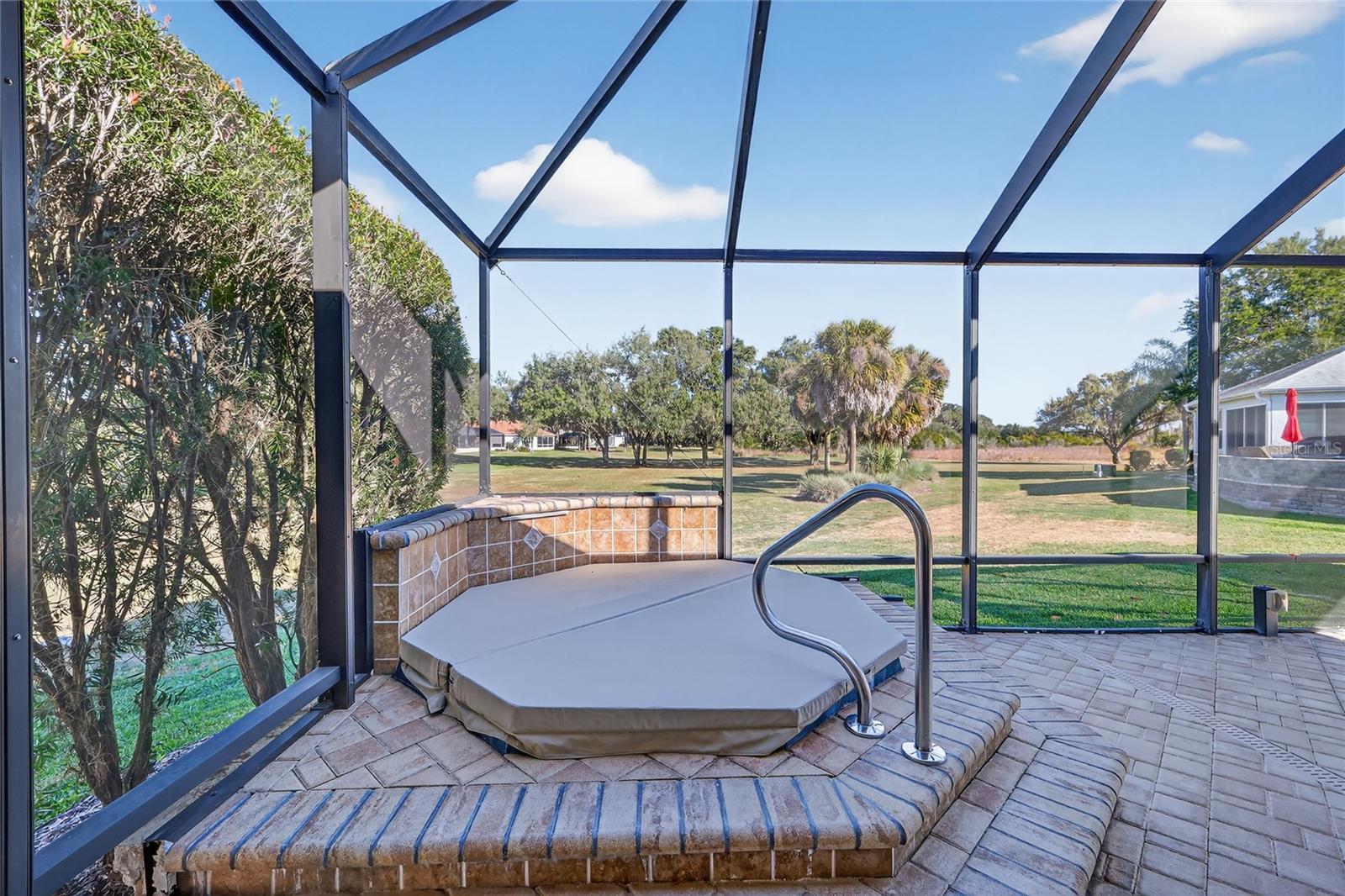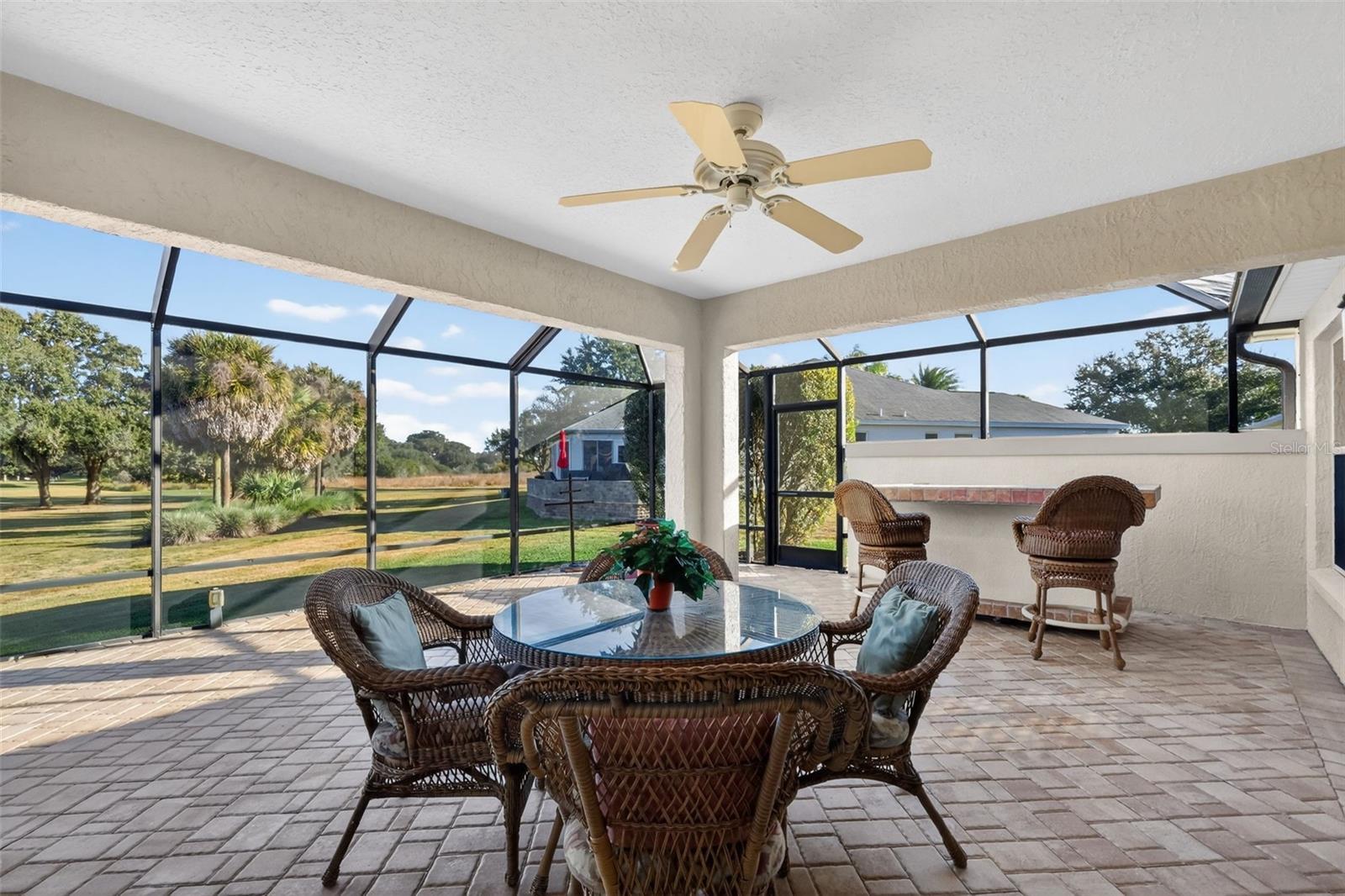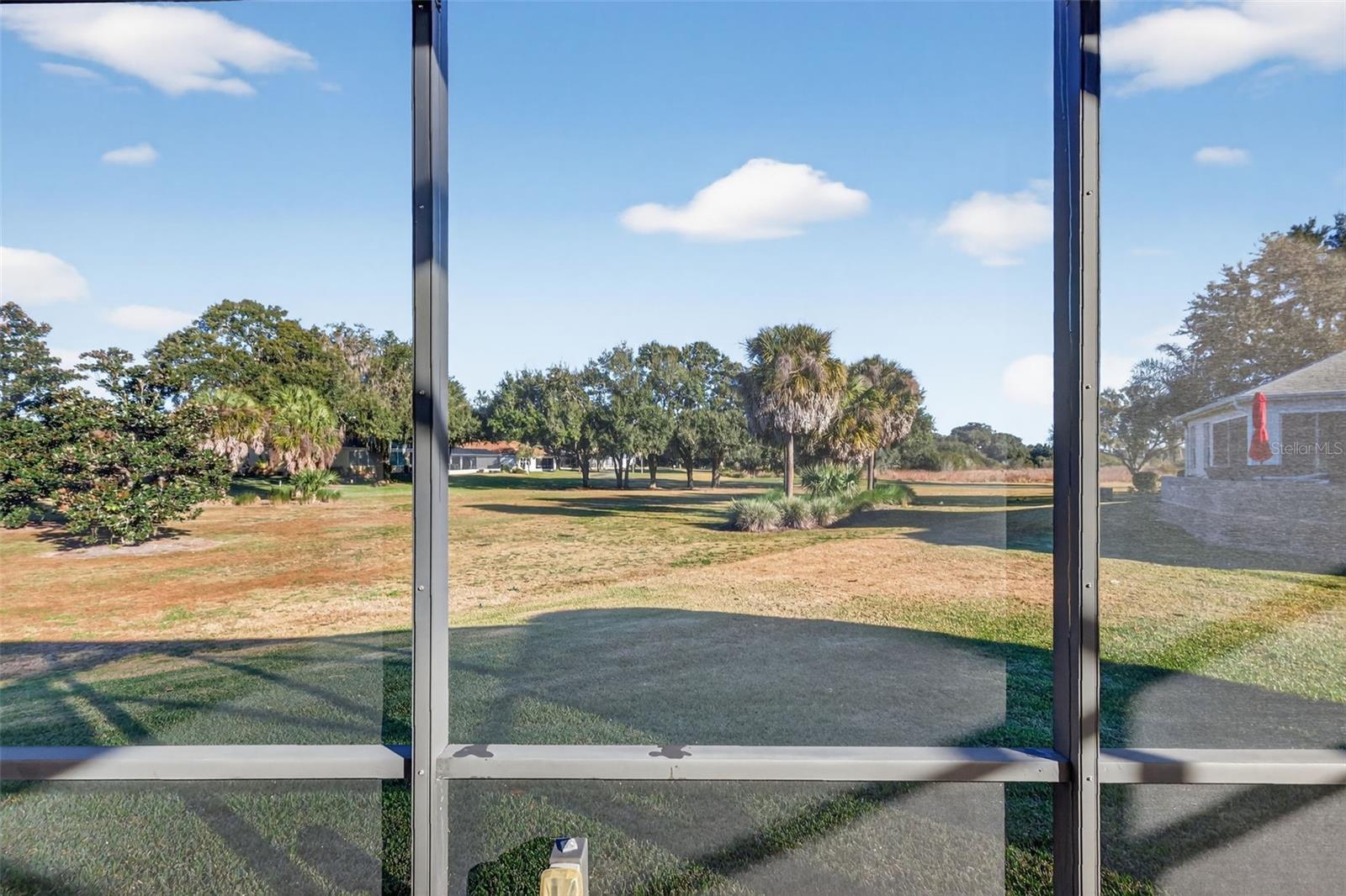 BREATHTAKING GOLF and PRESERVE VIEWS -- NO BOND -- ROOM FOR A POOL. Offering stunning panoramic views of the Pelican Golf Course and preserve, this 3-bedroom, 2-bath Lantana is located in the highly desirable Village of Sunset Pointe, just minutes from SUMTER LANDING. Situated on an extra-large, private lot, this home features NO BOND, a two-car plus GOLF CART GARAGE, and the room for and option to add a pool plus a turnkey package can be included at no extra cost. ROOF 2020. From the moment you arrive, the custom paver driveway, lush landscaping, and inviting front walkway set the tone. Step inside and your eyes are immediately drawn through the home to the spectacular golf course and preserve views beyond. Designed with a split floor plan, guests enjoy their own private wing with two spacious bedrooms and a full bath, including a front guest bedroom with a beautiful bay window (and Murphy bed). The open-concept living area features hardwood floors, vaulted ceilings, solar tubes, and fresh interior paint. The eat-in kitchen is ideal for entertaining, offering granite countertops, tile backsplash, abundant cabinetry with pull-out drawers, and a unique three-point curved counter that opens seamlessly to the dining and living areas. The primary suite is a true retreat with tranquil golf course views, an expansive tray ceiling, and a huge walk-in closet. The ensuite bath features dual granite vanities, a walk-in shower, and custom cabinetry for extra storage. The highlight of this home is the glass sliding doors from the livingroom, opening to a large 36x22 foot birdcage with a raised in-ground spa, movable bar, and fully paved outdoor living space—perfect for year-round enjoyment and entertaining while taking in the serene views. This prime location is just a short golf cart ride to Sumter Landing, shopping, dining, and nightly entertainment, and approximately ½ mile to Lake Miona and Hibiscus Recreation Centers and Cane Garden Country Club. Close to championship golf, medical facilities, grocery stores, and everything The Villages lifestyle has to offer. Please view the 3D walkthrough of this exceptional home. Call today to schedule your private showing.