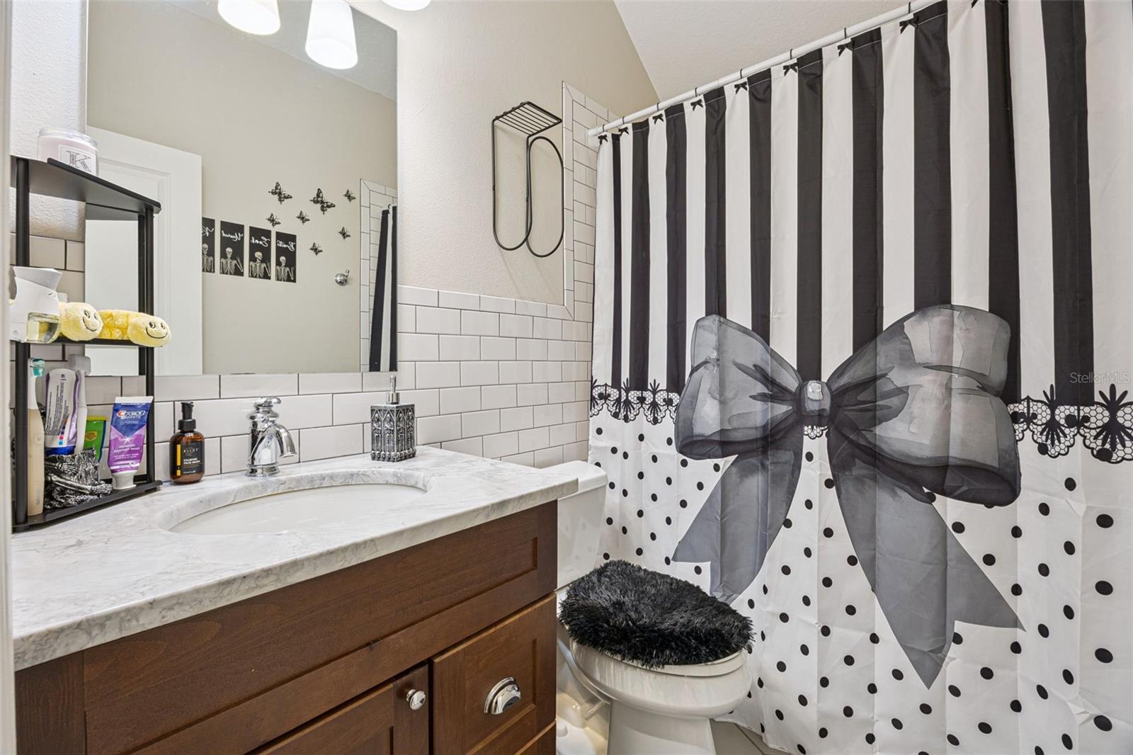 From the moment you enter, this home makes a statement with high ceilings and an abundance of natural light. Designed for both refined living and effortless entertaining, the open-concept living and dining spaces flow seamlessly into a beautifully appointed kitchen featuring granite countertops, rich wood cabinetry, stainless steel appliances, a breakfast bar, and an inviting breakfast nook. The thoughtfully designed split-bedroom floor plan offers exceptional privacy. The primary suite is a true retreat, complete with a spa-inspired bathroom showcasing a Jacuzzi tub, separate shower, dual granite vanities, and two spacious walk-in closets. A well-equipped laundry room with extensive cabinetry and a utility sink adds both convenience and functionality. Two additional bedrooms are situated on the opposite side of the home and share an elegant bathroom with a tub/shower combination. Upstairs, a spacious bedroom with a private en-suite bathroom provides ideal accommodations for guests or a secluded home office. Large pocket sliding doors open to a covered back porch with travertine flooring, creating a seamless indoor-outdoor living experience. The resort-style heated saltwater pool, enhanced by tranquil fountains, is the focal point of the fully fenced backyard, enclosed with a wrought iron fence for privacy and style. Additional features include a two-car garage with epoxy flooring, a recently replaced A/C system (2025), new roof in 2019, and access to a community dock area for residents—perfect for enjoying the waterfront lifestyle. all measurements are approx. and should be checked by buyer/buyers agent