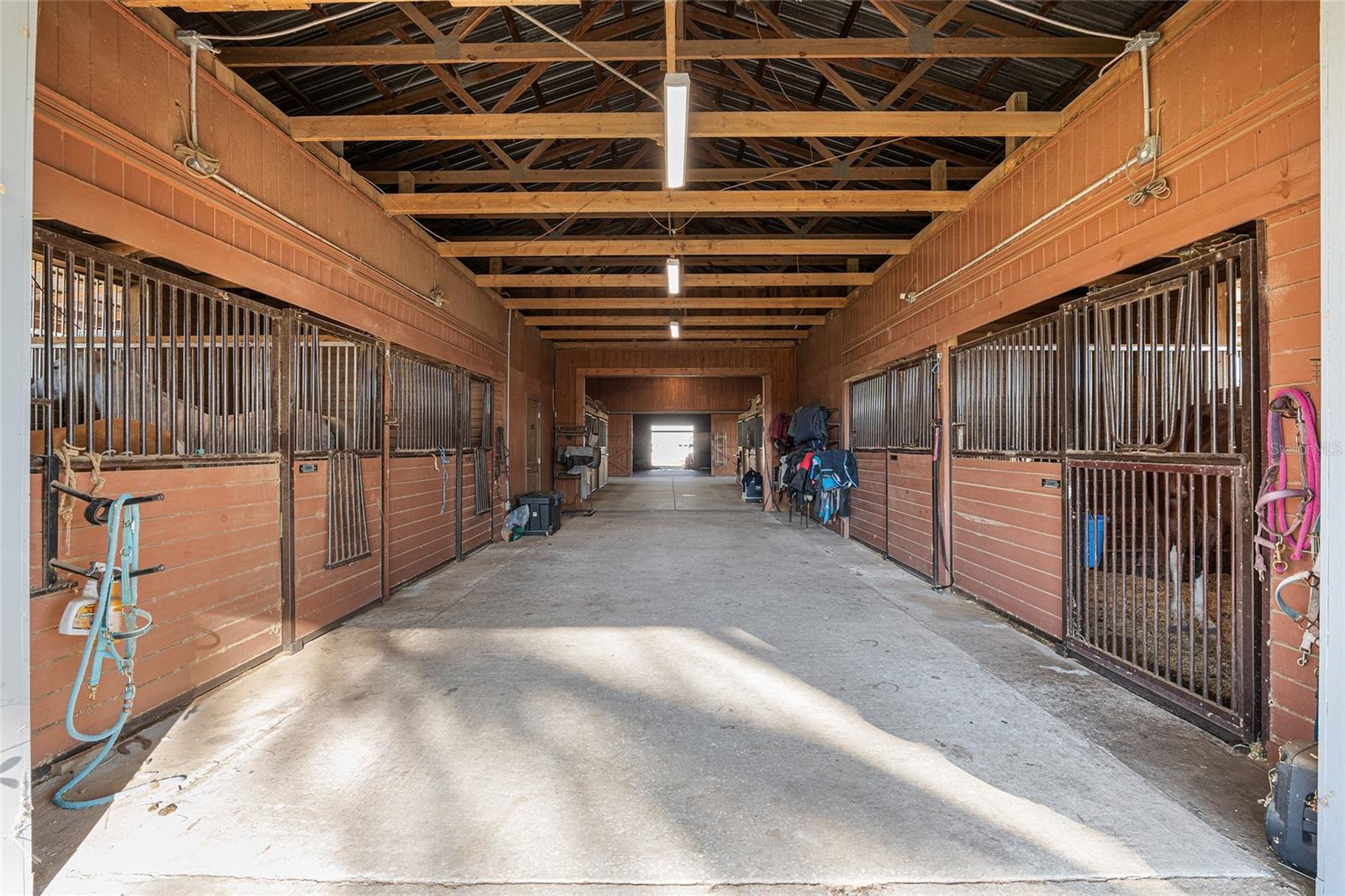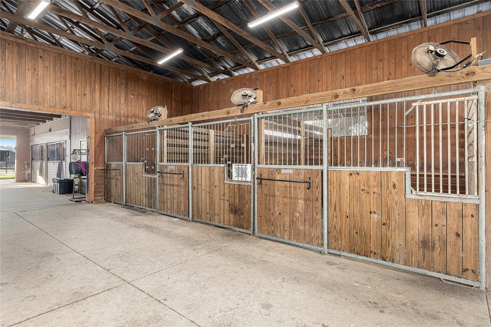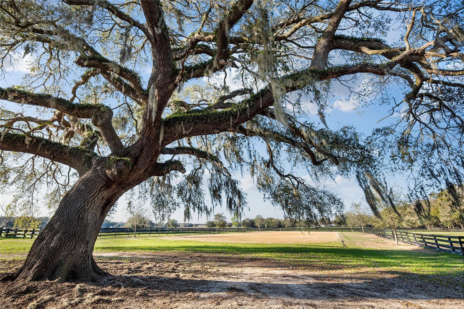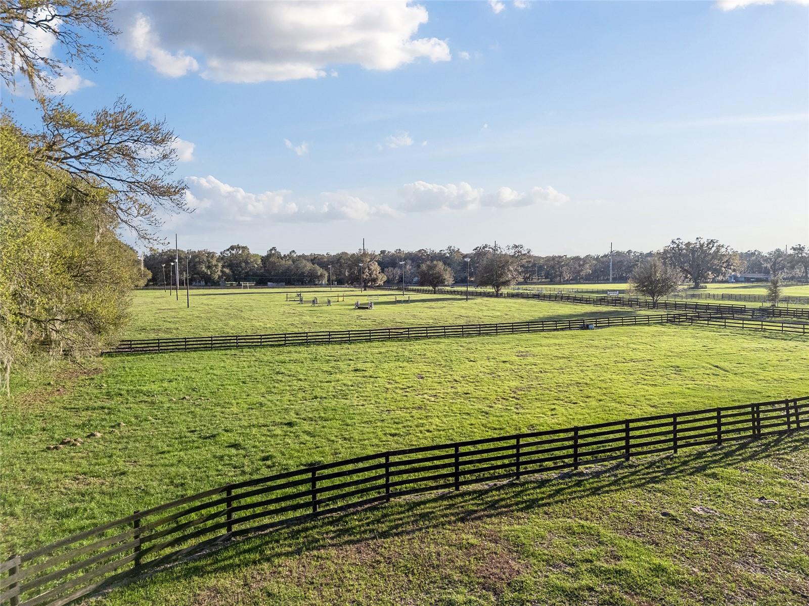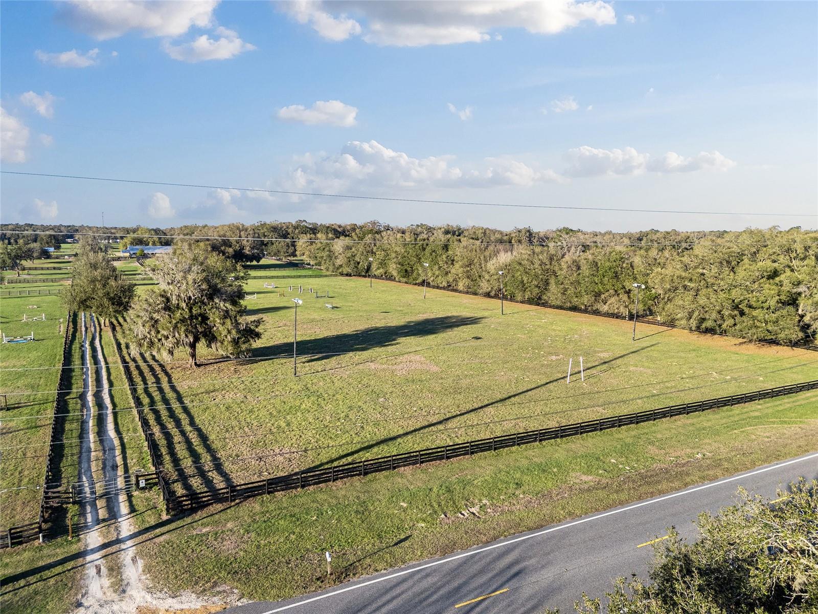 Exceptional Location! This turnkey equestrian estate is set on 12.97 serene acres adorned with picturesque, mature granddaddy oaks. Designed to accommodate any riding discipline, the property features a beautiful 13-stall center-aisle barn, along with 7 covered shed-row catch stalls. All stalls are 12×12 or larger and equipped with fans for year-round comfort. The barn is thoughtfully appointed with a centrally located feed room, tack room, full bathroom, and laundry area, all individually air-conditioned, plus additional storage throughout. An impressive 80’ × 220’ riding arena with a clay base and sand/clay footing provides excellent rideability. The property includes newly upgraded asphalt millings driveway, new fencing & additional cross-fenced pastures with automatic waterers, a run-in shelter, and wash rack. A Massive hay and shavings storage area offers ample space for feed and farm equipment. Additional features include a 50-amp RV hookup perfectly positioned beneath a majestic oak tree, as well as an additional hookup suitable for a smaller camper or living-quarters horse trailer under the barn overhang. One of the property’s most exceptional and highly desirable features—especially during the warmer months—is the lighted field. This versatile space is ideal for a jump course, polo field, dressage ring, practice arena, or any use that suits your needs. The entrance is enhanced by a new solar-powered gate, and as you drive down the lane, the expansive lighted field welcomes you on the right—an impressive and functional first impression. Conveniently located with easy access to I-75, just minutes from the Florida Horse Park, and a short drive to WEC, this property offers the perfect blend of peaceful country living and accessibility. Close to hospitals, dining, shopping, and The Villages, it is both easy to reach and ideally situated. This is truly a must-see property to fully appreciate its beauty, functionality, and setting.