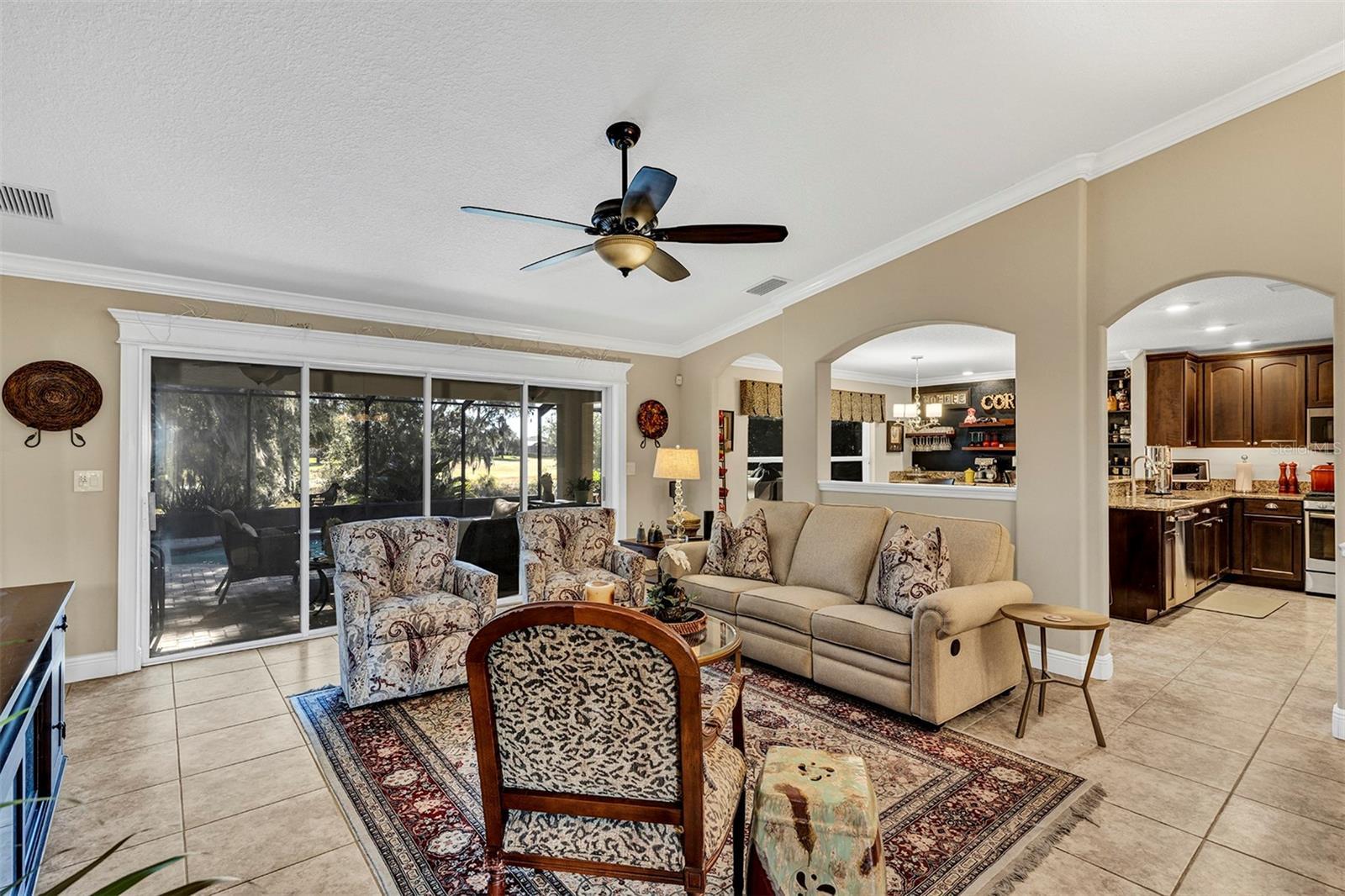 RARE OFFERING ENERGY-EFFICIENT AFFORDABLE SOLAR-HEATED 10X24 POOL, PAID-OFF SOLAR PANELS FOR FREE ELECTRICITY ONLY $36/MONTH CONNECTION FEE, LOCATED ON PRIVATE CONSERVATION LOT WITH GOLF COURSE ON OTHER SIDE OF TREES, LOW TRAFFIC LOOP IN HIGH DEMAND GATED ACTIVE-ADULT GOLF COMMUNITY OF ARLINGTON RIDGE, BUY NOW BEFORE PRICES GO UP ON POOL HOMES THIS SPRING, IT WILL BE HERE BEFORE YOU KNOW IT, NEW ROOF JAN. 2025 Welcome to a life that feels like vacation every day, this beautiful low-maintenance 3-bedroom 2 bath block & stucco home with over-sized 2 car+ garage with over-head storage & a golf cart garage, built in 2017 delivers the comfort, quality, and freedom you’ve been dreaming of without the resort price tag. Every detail has been thoughtfully cared for giving you peace of mind and more time to enjoy the things you love. Step inside and feel the spacious open-concept flow of the 21x17 great room with high ceiling and crown molding to enhance your sense of space that is perfect for relaxed evenings or lively gatherings with your new friends. The kitchen is inspired with its 5 burner natural gas stainless steel range & fridge that stay, closet pantry, and 4-seat bar-top that’s made for morning coffee and good conversation. The dining area has built-in bar The split-bedroom layout offers privacy for you and your guests, while the owner’s suite invites you to unwind, enjoy your conservation and pool view, The ensuite bath features dual vanities, a walk-in shower, custom California walk-in closet and private toilet. The second bedroom also has a bath just outside it's door. MAJOR UPGRADES INCLUDE, NO CARPETS, TILE ANND CROWN MOLDING THROUGHOUT ALSO INCLUDES A NATURAL GAS WHOLE HOUSE GENERATOR SO YOU'RE NEVER WITHOUT ELECTRICITY. Step out to your over-sized screened pool cage with privacy and breathe in the tranquility while sipping your morning coffee or afternoon margarita or using you outdoor kitchen complete with smoker and fridge. With block and stucco construction, high elevation, and massive insurance savings for wind and flood protection, this home offers strength and serenity in equal measure. But what truly sets this home apart is the lifestyle. Arlington Ridge is more than a community it’s a way of living. Spend your mornings on the championship 18-hole golf course, your afternoons at one of the 2 community the heated pools for lap swimming, water aerobics or a friendly game of water volleyball or fitness center, or spend your evenings with neighbors at the on-site restaurant, tavern for watching sports or on karaoke night for the bold & the brave, (FUN IS GUARANTEED, THE TALENT IS NOT), or free movie theater. Enjoy tennis, pickleball, bocce-ball & billiards, or a peaceful stroll along golf cart-friendly streets lined with sidewalks and manicured landscapes. And with a remarkably low HOA of just $126/month, you’ll enjoy included lawn care, high-speed internet, Wi-Fi, and over 200 cable channels. With hardly any yardwork to worry about, What will you do with all your free time? Conveniently located near shopping, dining, medical services, and a short drive to Orlando’s airport major theme parks, attractions and both coasts’ beaches, this home blends resort-style living with everyday practicality. Don’t just buy a home, embrace the lifestyle you worked hard for and deserve. Schedule your private showing today and start living your best Florida life at Arlington Ridge. Retirement is not the end, it’s a new chapter just beginning.