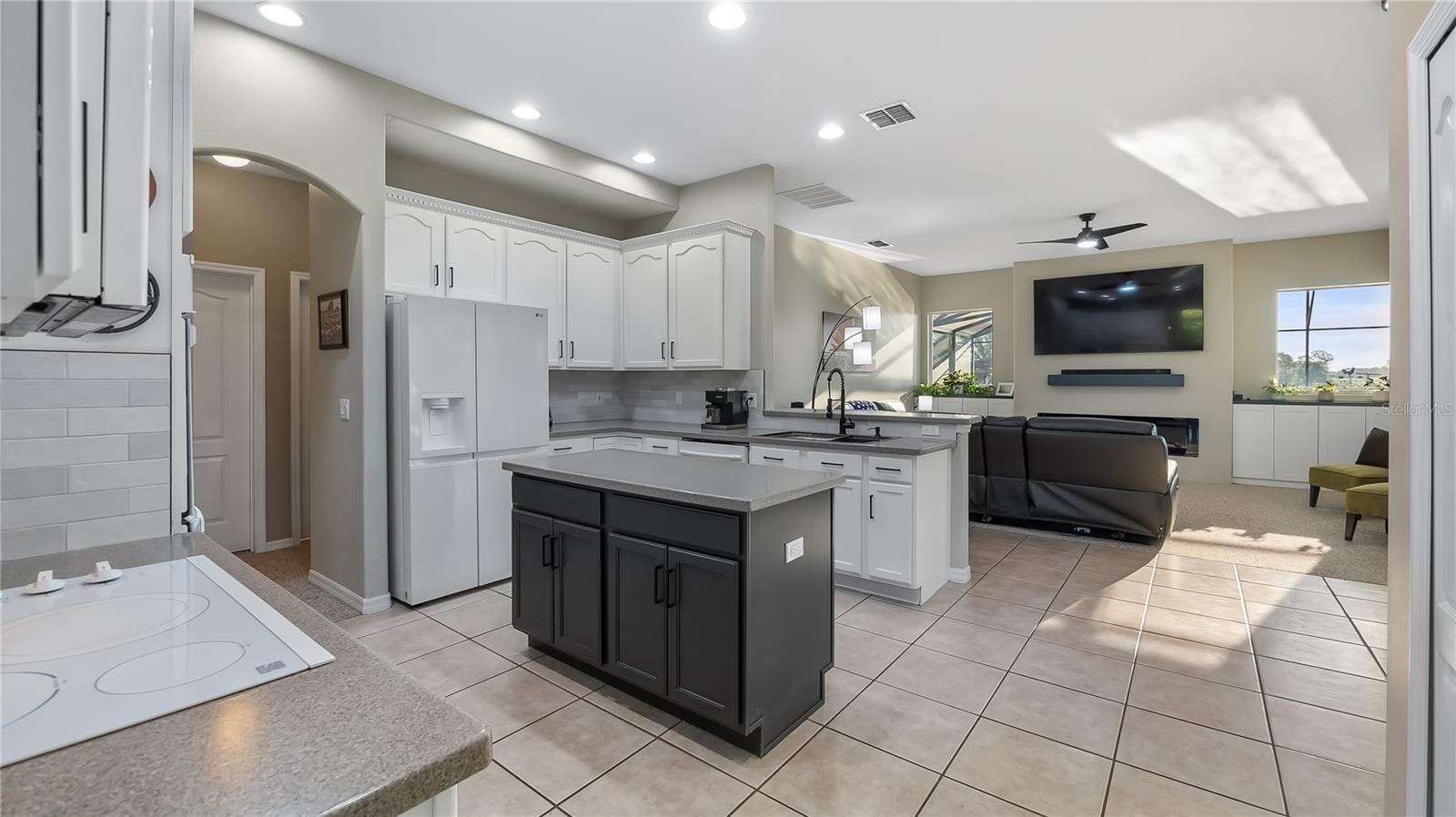 - Ceiling Fans(s), Eat-in Kitchen, High Ceilings, Kitchen/Family Room Combo, Primary Bedroom Main Floor, Solid Wood Cabinets, Split Bedroom, Stone Counters, Thermostat, Walk-In Closet(s)