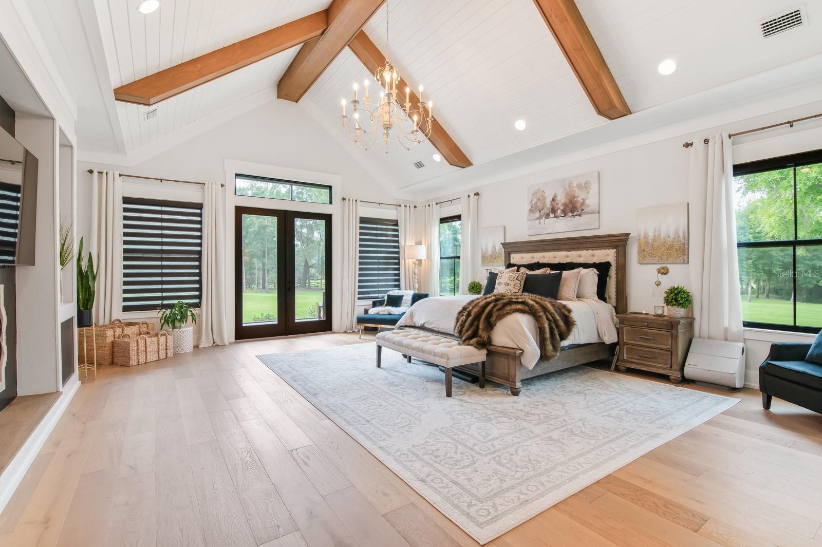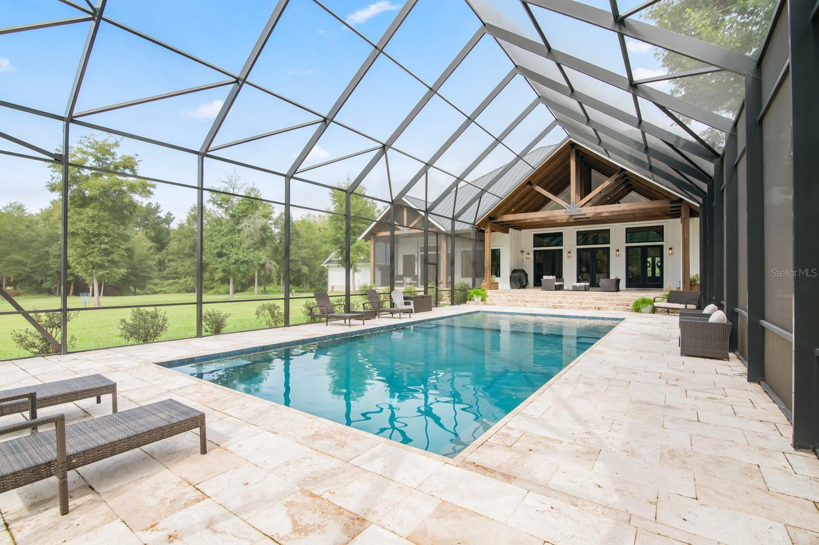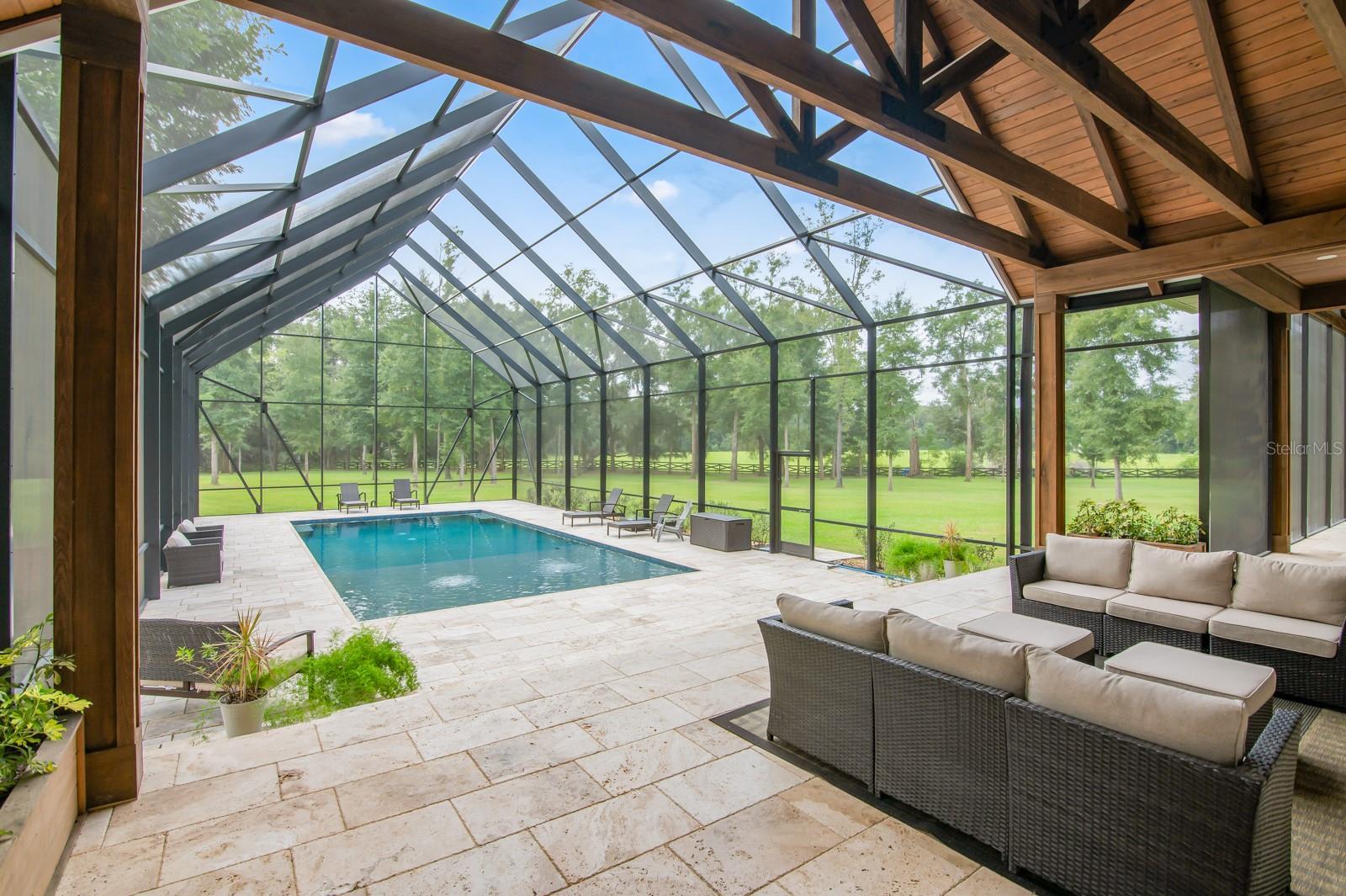 Under contract-accepting backup offers. Experience refined country living in this remarkable custom-built home located within the prestigious, gated Charleston neighborhood. Set on over 6 acres, this 4-bedroom, 3.5-bath residence includes a private study, entertainment room, loft, and dedicated storage space—offering luxury and flexibility for any lifestyle. Step inside through an impressive entryway that reveals soaring 23-foot ceilings adorned with cypress tongue-and-groove accents. Rich wood floors flow throughout the home, complemented by a show-stopping staircase featuring floating solid walnut treads. The gourmet kitchen is designed for both entertaining and everyday living, featuring a large center island, high-end gas range, butler’s pantry, and a coffee/wet bar for added convenience. The open-concept layout seamlessly connects to the great room, where walls of glass overlook the spectacular outdoor oasis. The primary suite is a true retreat, complete with vaulted ceilings, private glass doors leading to the pool area, and a spa-inspired en-suite bathroom. Highlights include a glass-enclosed shower, dual vanities, and a dream-worthy custom walk-in closet with built-in cabinetry and direct access to the laundry room. Step outside to your own private paradise: a screened saltwater pool with hand-built cypress trusses and extensive travertine decking—perfect for year-round enjoyment. Additional features include two tankless water heaters, full-house generator hookup, Central vacuum system and water softener. Four-car garage, large underground propane tank and Horse-friendly property. This home offers a rare blend of luxury, functionality, and space—truly a must-see.
