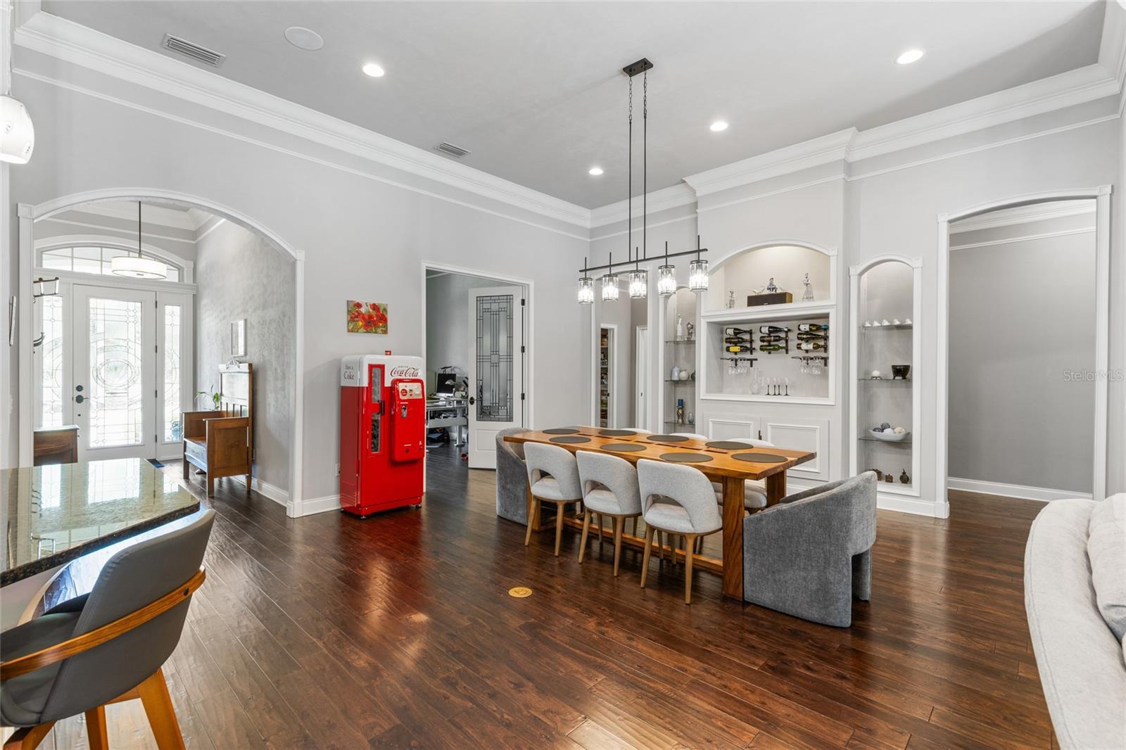 - Built-in Features, Ceiling Fans(s), Crown Molding, Dry Bar, High Ceilings, Open Floorplan, Solid Surface Counters, Solid Wood Cabinets, Split Bedroom, Stone Counters, Thermostat, Walk-In Closet(s), Window Treatments