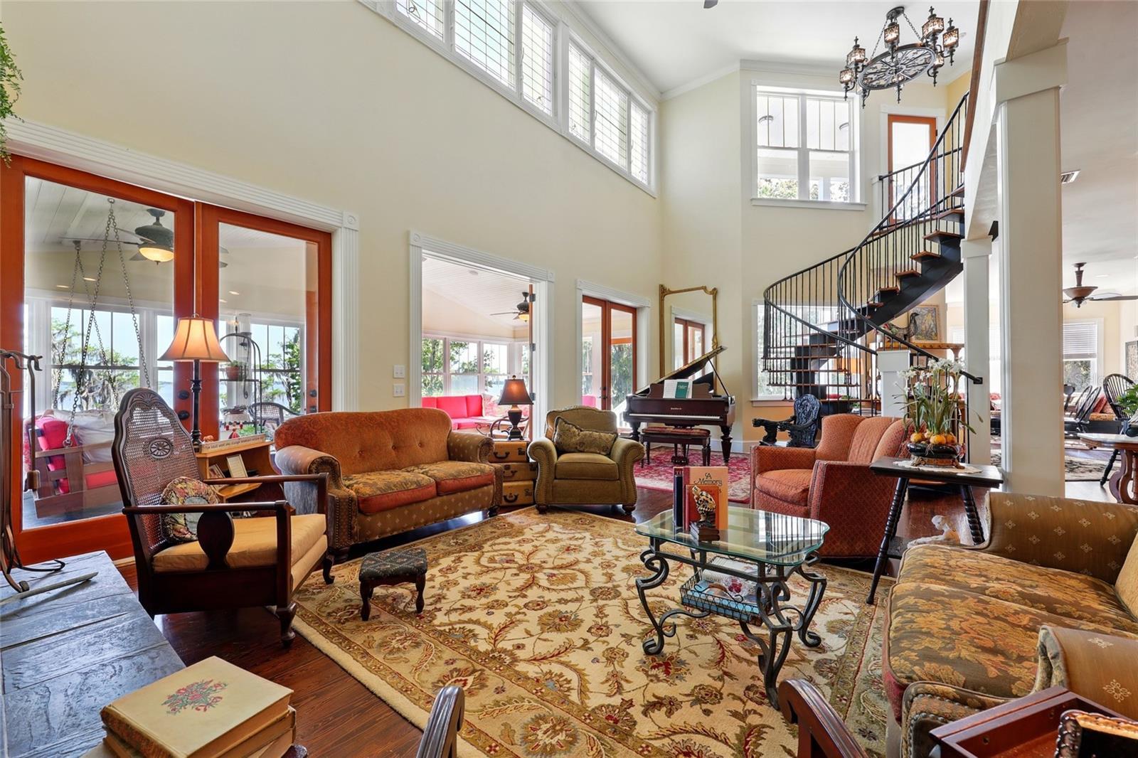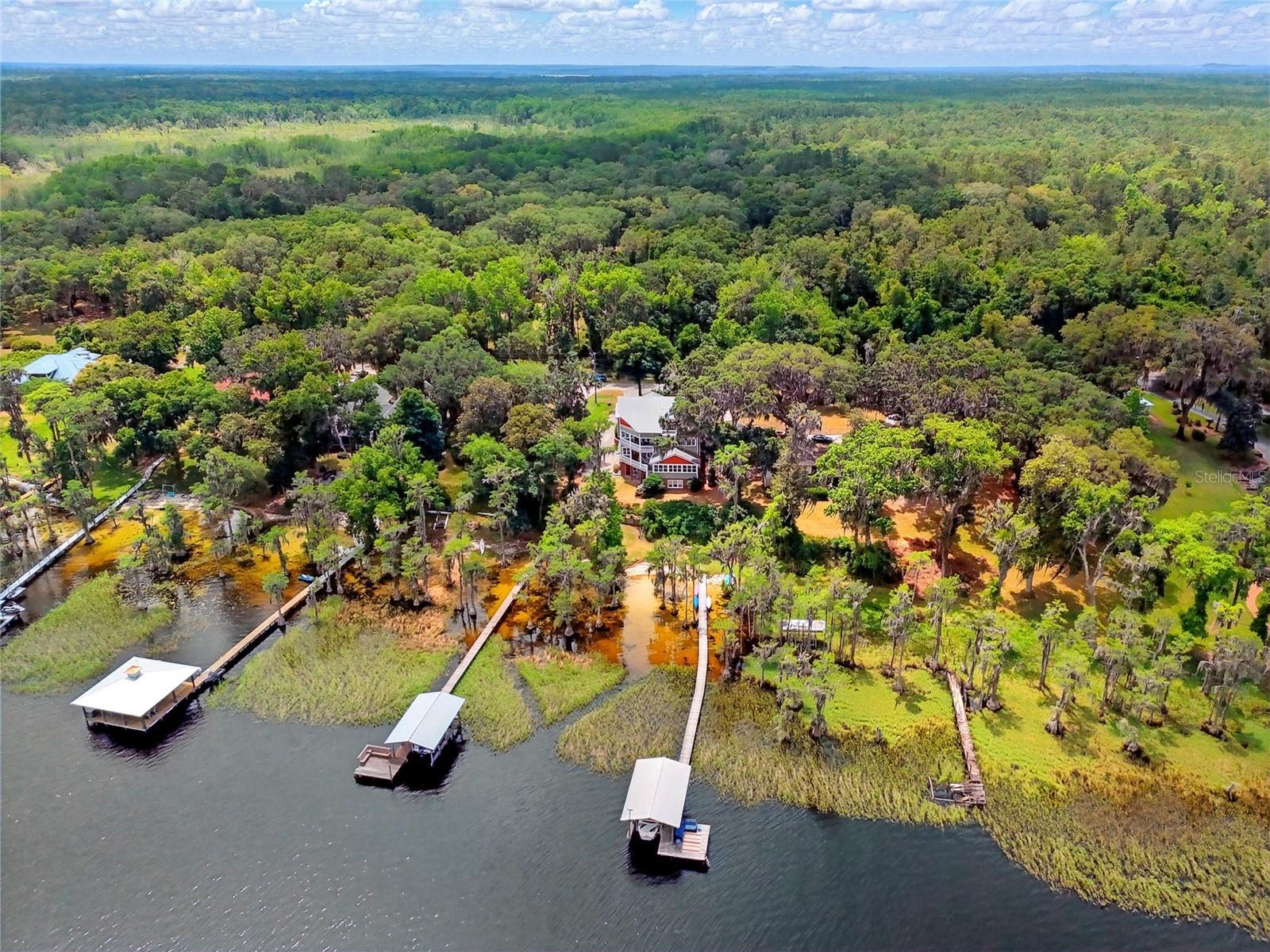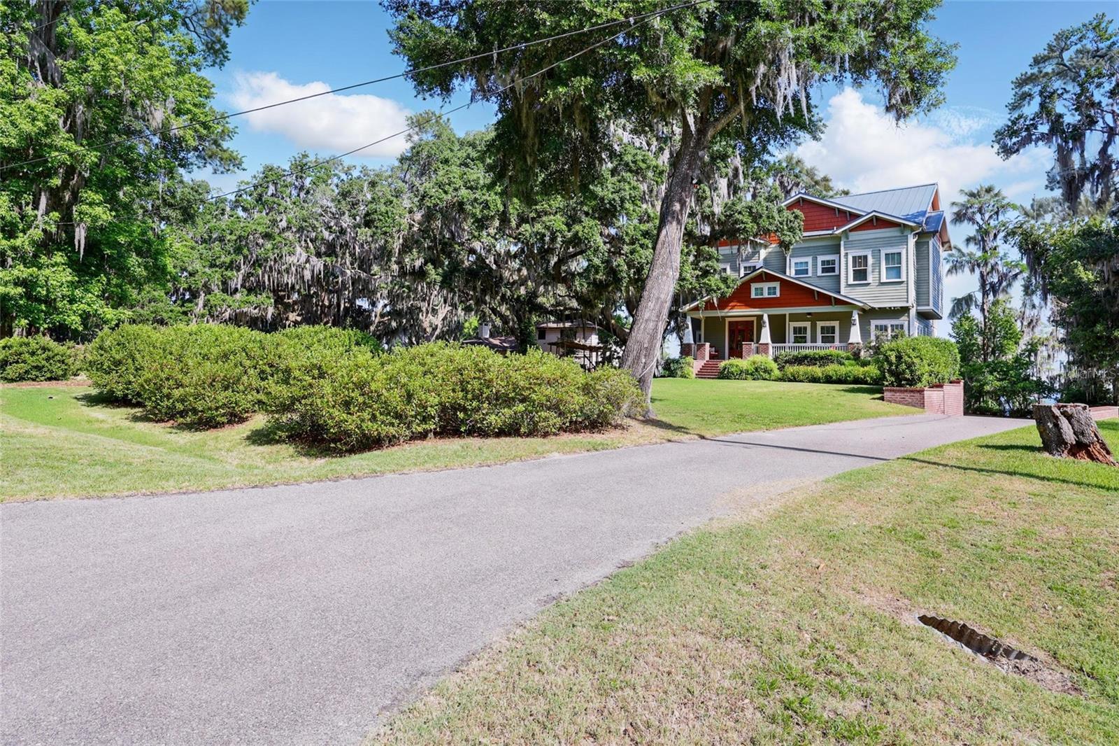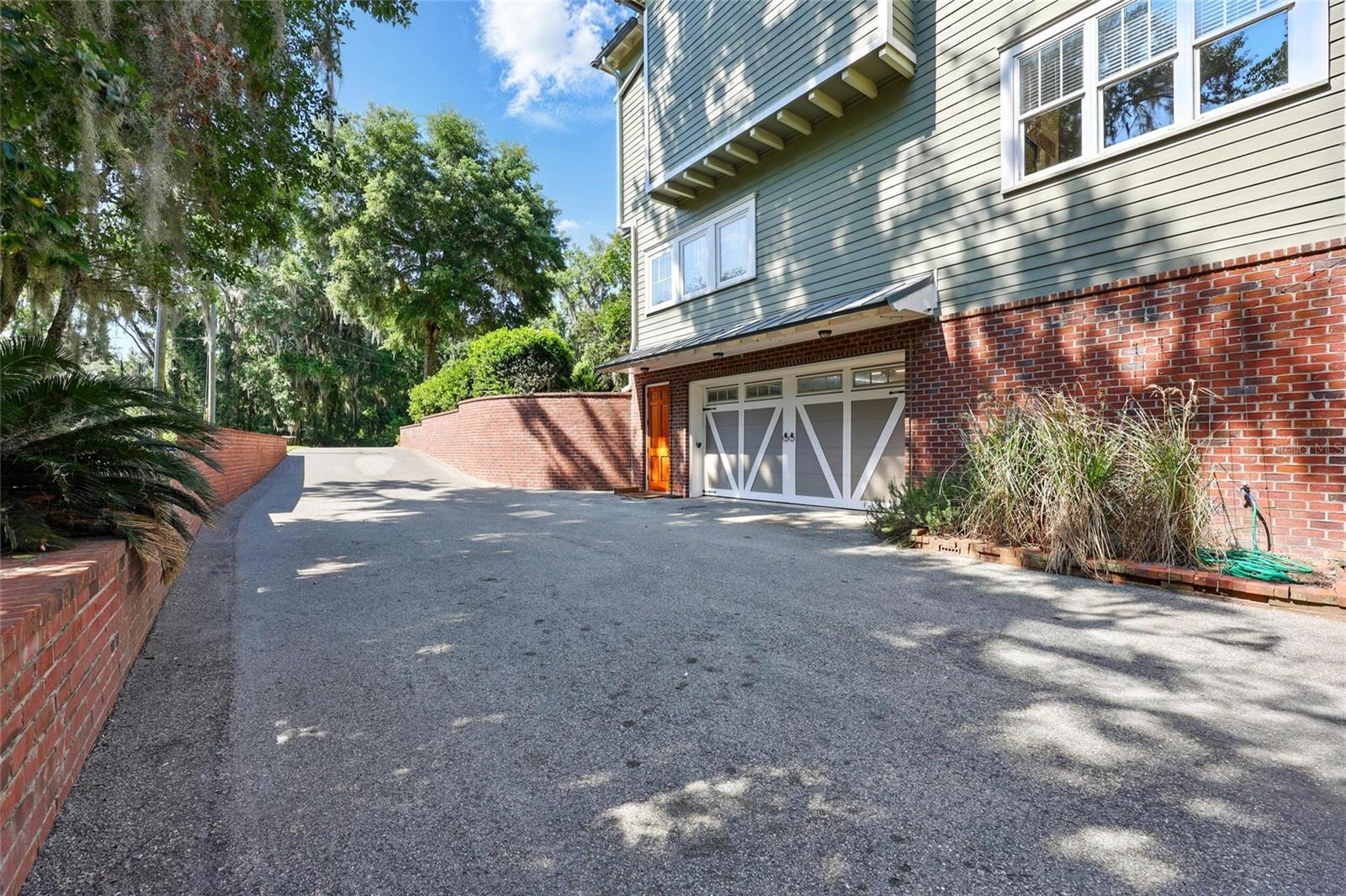 Uniquely perched on a 15 ft bluff above Lake Santa Fe, this expansive custom lakefront estate offers a grand scale and timeless elegance, perfect for those seeking a luxurious retreat. The heart of the home is its open kitchen, designed for effortless entertaining, flowing seamlessly into a spacious living area with room for a grand piano and dining space, all framed by 2 story ceilings that amplify the sense of grandeur. Almost every room captures stunning lake views, immersing you in the serene beauty of the surroundings. A dramatic custom steel circular staircase with oak treads milled from the property is designed to preserve the breathtaking vistas and add an artistic touch. The primary suite, nestled on the third floor nearly 40 ft above the lake, is a true sanctuary of luxury and tranquility. It opens to a private porch where you can savor morning coffee or evening wine while gazing out over the shimmering lake—a perfect spot for quiet reflection. Adjacent to the suite, a cozy keeper room offers a private retreat for reading or relaxation, bathed in natural light and lake views. The primary bathroom elevates the experience with a spacious, curbless walk-in shower designed for seamless accessibility, a corner soaking tub ideal for unwinding after a day on the water, and a custom double vanity that adds a touch of elegance to your daily routine. For the young or young-at-heart, a secret children’s room offers a magical hideaway, accessible only through a wardrobe, evoking a sense of wonder. Inside, 4 children’s bunk beds create a cozy retreat for sleepovers or imaginative play, making this space a delightful surprise for families. This home is built for versatility and comfort, with porches on all four floors, each offering a unique perspective of the lake’s shimmering waters—perfect for morning coffees or evening gatherings. The elevator accesses all four floors including the full-size attic, featuring 8 ft ceilings, making the home fully accessible for all. The attic is plumbed for an additional bathroom and offers ample space to create more bedrooms, making it ideal for growing families or guests. The first floor is a self-sufficient 2-bedroom apartment, complete with its own kitchen and living areas, operating independently from the main house for ultimate flexibility. Step outside to the lakefront, where a gentle beach entry offers an easy walk-in swimming area, perfect for family fun or a refreshing dip. The ipe wood dock extends into the lake, featuring a boat lift for your watercraft and boasting over 10 ft of water depth at its end—ideal for boating enthusiasts. The sunsets here are magical, painting the sky in vibrant hues as you unwind. This home is truly unlike any other and must be seen in person to experience all it has to offer.