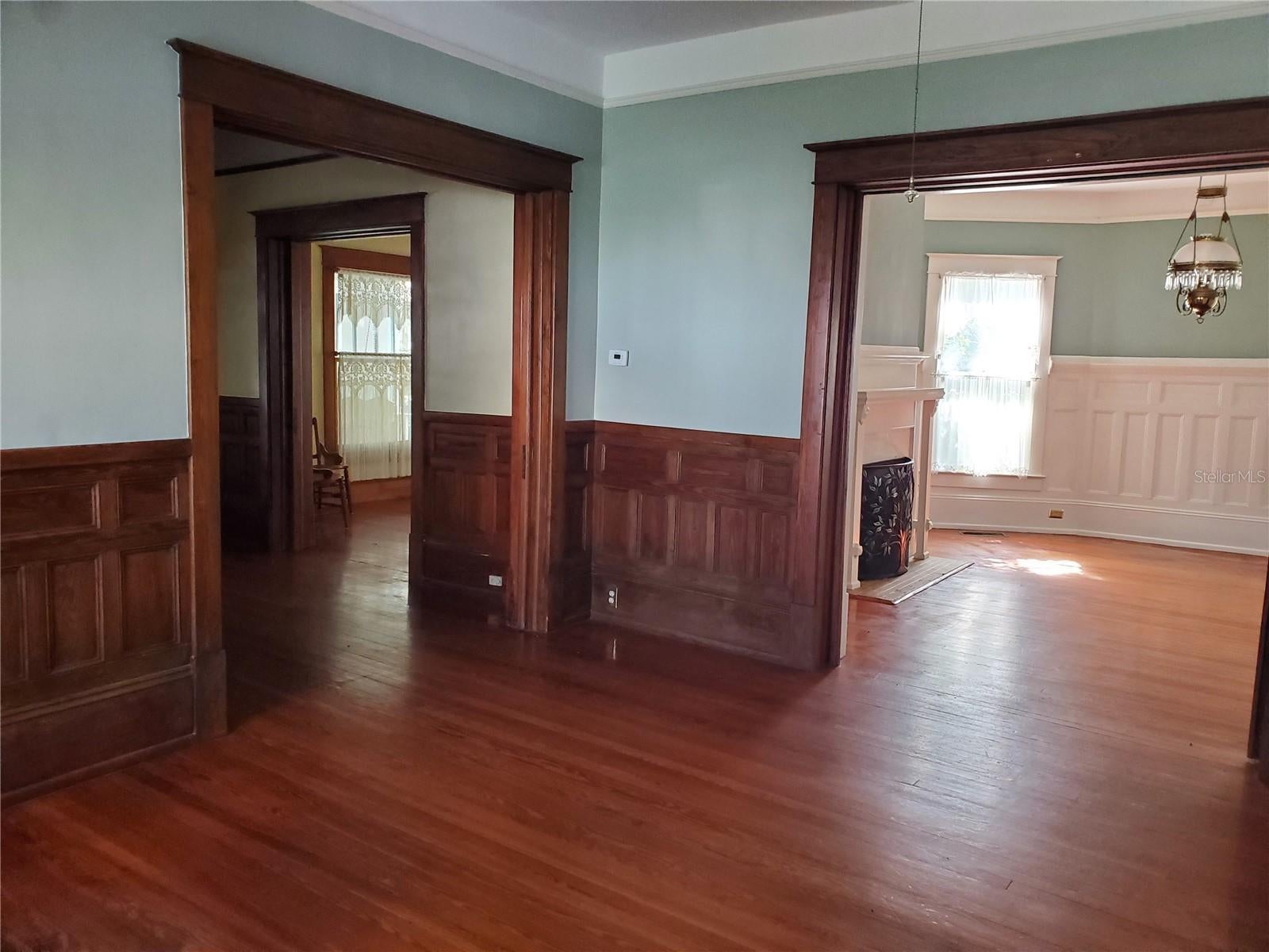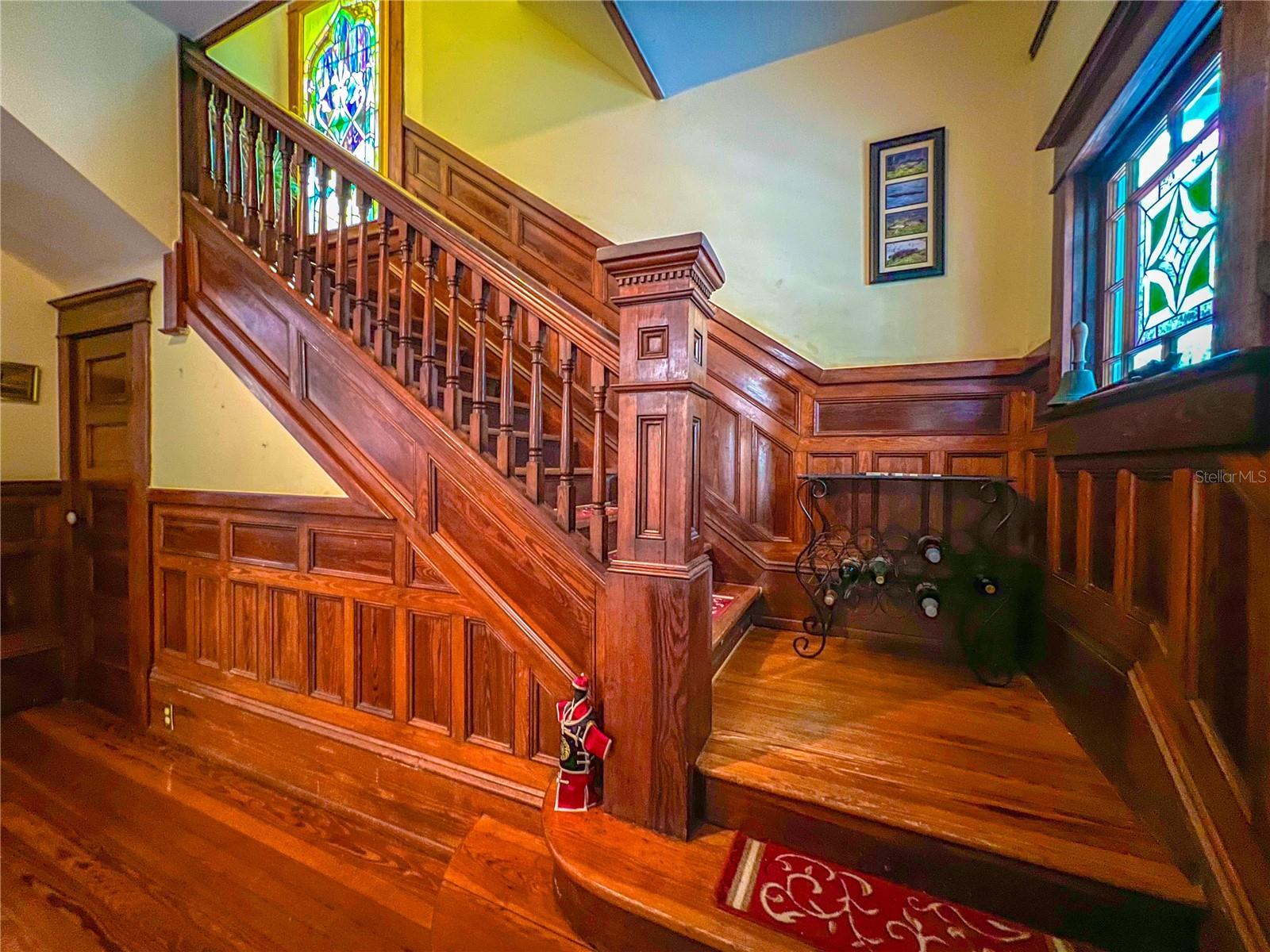 Welcome to the lovely Duckpond neighborhood! Just steps from the Thomas Center gardens and events. Enter this stately historic home-- built in 1913 --through a huge foyer featuring a standout architectural staircase, seating area and coat closet. This well-maintained beauty has an abundance of original features such as heart pine floors throughout, nearly 10 foot ceilings, stylish solid wood wainscoting , useful built-ins, and 5 functional fireplaces, two with gas inserts and three wood burning. Several gorgeous stained glass windows accent the home. Bright modern kitchen with a fantastic coffered ceiling to complement spectacular quartz counters and abundant cherry cabinets and walk-in pantry. Crown molding and 12 inch baseboards support a visual cohesiveness throughout. Four bedrooms, each with multiple large windows that let in plenty of light, two and a half updated bathrooms, an on demand water heater, two HVAC systems, two refrigerators, washer/dryer, a fabulous private sleeping porch, and detached garage. Full attic on 3rd floor that has new insulation and AUTOMATIC attic stairs. Spend time on the substantial open front porch or opt for more privacy out back on the 27 foot screened lanai with plenty of dining space and a heated dipping pool/spa. Artistic wrought iron fencing and large established flowering trees and bushes with sitting areas welcome you home on this quiet street just blocks from downtown and UF.