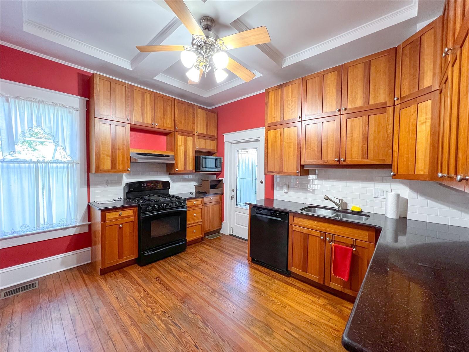 - Built-in Features, Ceiling Fans(s), Coffered Ceiling(s), Crown Molding, High Ceilings, PrimaryBedroom Upstairs, Solid Wood Cabinets, Thermostat, Vaulted Ceiling(s), Window Treatments