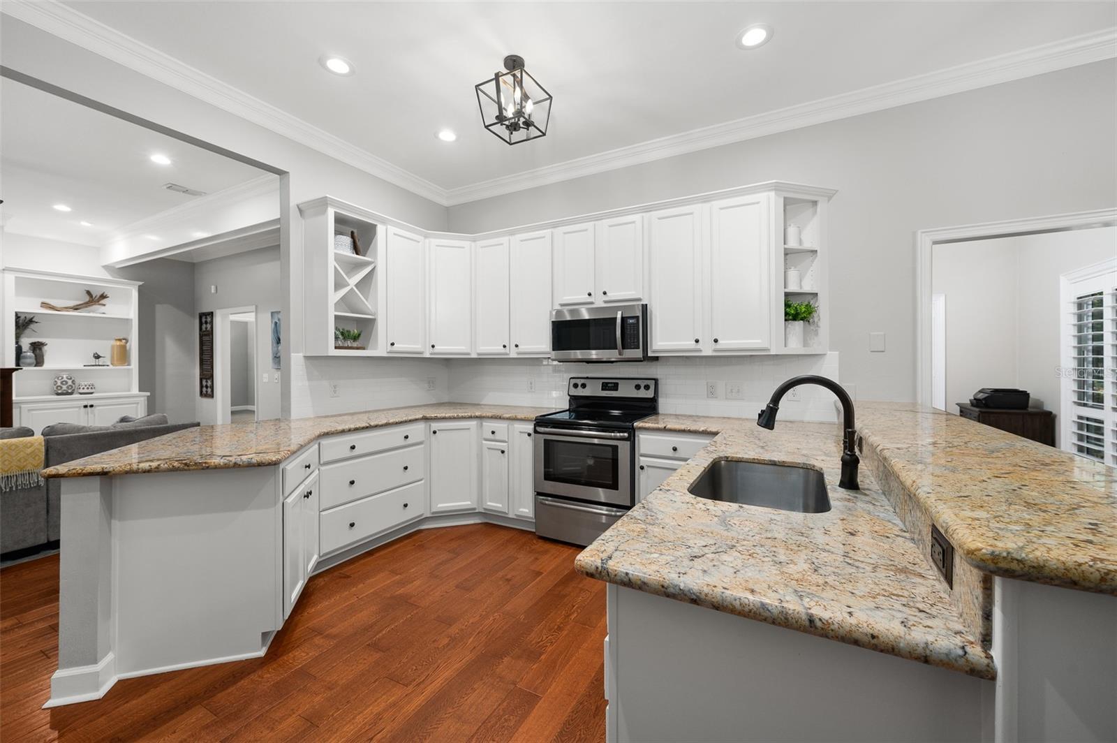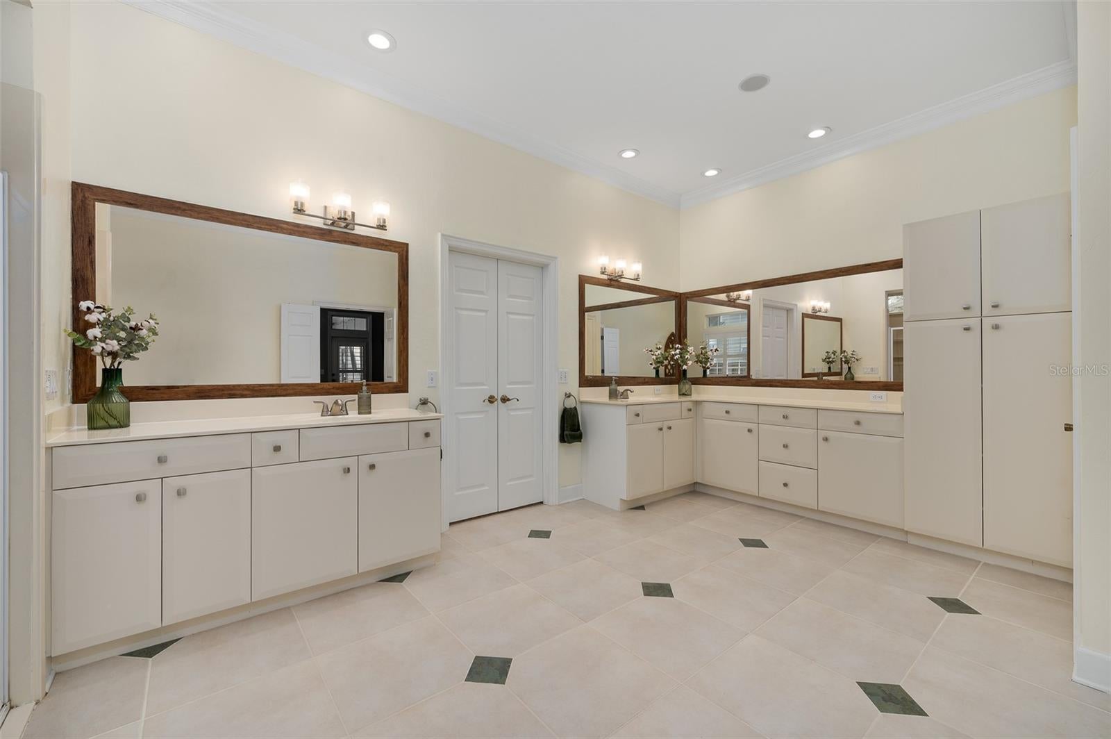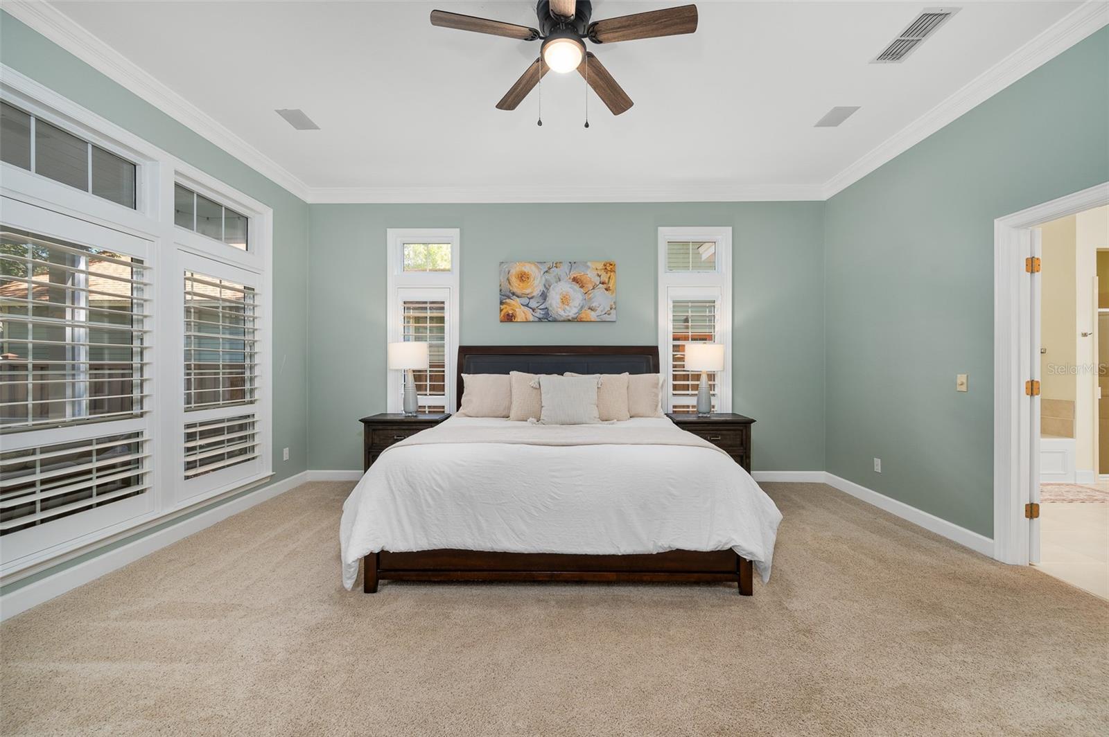 - Built-in Features, Ceiling Fans(s), Crown Molding, Eat-in Kitchen, High Ceilings, Open Floorplan, Primary Bedroom Main Floor, Solid Surface Counters, Solid Wood Cabinets, Split Bedroom, Walk-In Closet(s)