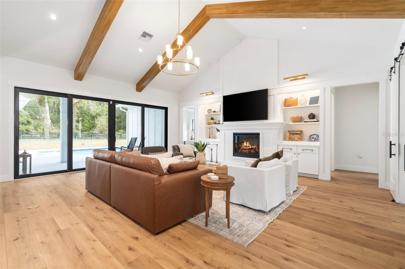 Experience refined estate living in this custom-built residence within Barrington, Gainesville’s premier gated community. Set on two private acres surrounded by majestic oaks, this home blends timeless architecture with modern comfort and meticulous craftsmanship. Spanning nearly 4,000 square feet, it offers four bedrooms, four and a half baths, a dedicated office, and a spacious game/media room that opens to a veranda and resort-style pool—ideal for both everyday living and effortless entertaining. The open-concept great room centers around a striking fireplace and flows seamlessly to the outdoor living area, complete with a second fireplace and expansive covered lanai. The gourmet kitchen showcases GE Monogram appliances, Cambria quartz countertops, and custom cabinetry, while COREtec Pro Enhanced Cairo Oak flooring provides the beauty of hardwood with waterproof durability. Designer Visual Comfort lighting and elegant finishes elevate every space. The primary suite serves as a private retreat, featuring a spa-style bath with a soaking tub, walk-in shower, and dual vanities. Additional highlights include a porte-cochère, four car garage, and well-planned storage and laundry areas that combine luxury with functionality. Homeowners enjoy peace of mind with a Maverick Structural & Home Warranty, including one-year workmanship coverage, two-year systems protection, and ten-year structural coverage, plus the HomeCare Program’s dedicated support and 11-month review process. Ideally located just minutes from Tioga Town Center, Publix, UF, and I-75, Barrington offers tranquility, convenience, and exclusivity—defining luxury estate living in North Florida.