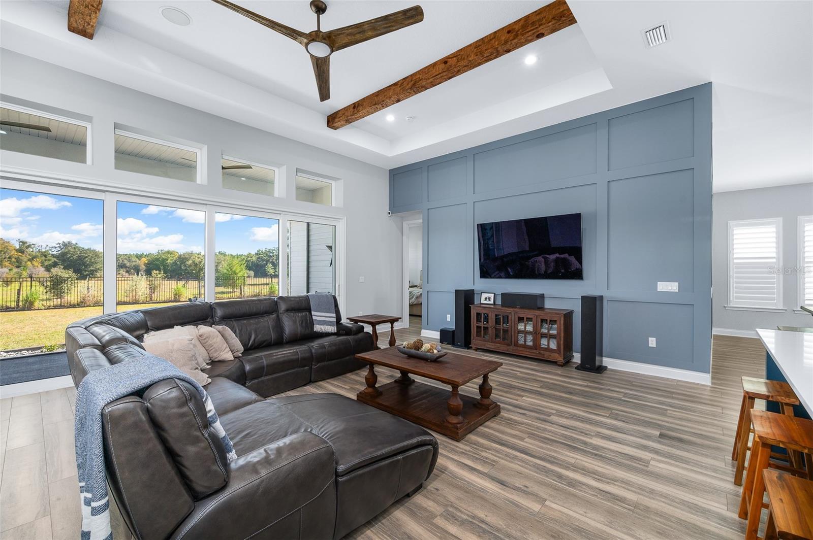 Step into luxury with this exceptional 4-bedroom, 3-bathroom residence in the desirable Oakmont community in Southwest Gainesville. Built in 2024, this home seamlessly blends modern craftsmanship, elegant finishes, and thoughtful design. Entering through the beautiful, custom four-panel rain glass front door you’re greeted by the bright office/study with custom barn doors and a built-in bookcase with a library ladder — the perfect spot for working from home or curling up with a good book. Across the hall, you’ll find two bedrooms and a full bath, with one bedroom featuring charming bookcase closet doors that add a touch of personality. Continuing down the main entry past the gallery with tray ceilings, the kitchen is a true showpiece feature of the home. Double stacked, upgraded deluxe kitchen cabinets, upgraded quartz countertops, upgraded undermount sink, a furniture-wrapped island with decorative X panels, drop-in gas range with hood, wall oven, and custom bricked walls create a space as functional as it is stunning. From here, the kitchen flows seamlessly into the dining room featuring a board and batten wrapped wall that continues into the spacious living room where tray ceilings with gorgeous hand-hewn wood beams and sweeping multi-panel sliding glass doors open to the infinity screened porch, revealing serene views of the fenced backyard that overlooks a gopher tortoise preserve conservation area behind the property. Adjacent to the living room, a third guest bedroom showcases elegant crown molding and is accompanied in the hall by a guest bathroom with upgraded pebble stone in the shower. Across the home, the owner’s suite is a true retreat, offering a tray ceiling, luxurious ensuite bath with upgraded pebble stone shower flooring, dual vanities, and a walk-in closet with built-in closet organizer. Practical elegance continues throughout the home with a mudroom featuring a charming built-in bench and storage, a large double-door pantry connecting to the laundry room, and a three-car tandem garage with ample space for storage or a workshop. Exquisite upgrades extend throughout the home, including plantation shutters, LED recessed lighting, wood-look tile flooring, seamless gutters, a whole-house water filtration system, concrete landscape curbing around the house, and additional insulation in the walls in some areas of the home. Oakmont residents enjoy resort-style amenities, including a clubhouse, fitness center, resort-style swimming pool with lap lanes, tennis courts, basketball court, multi-purpose activity field, and playground, all within a prime SW Gainesville location close to highly-rated schools, shopping, and dining.