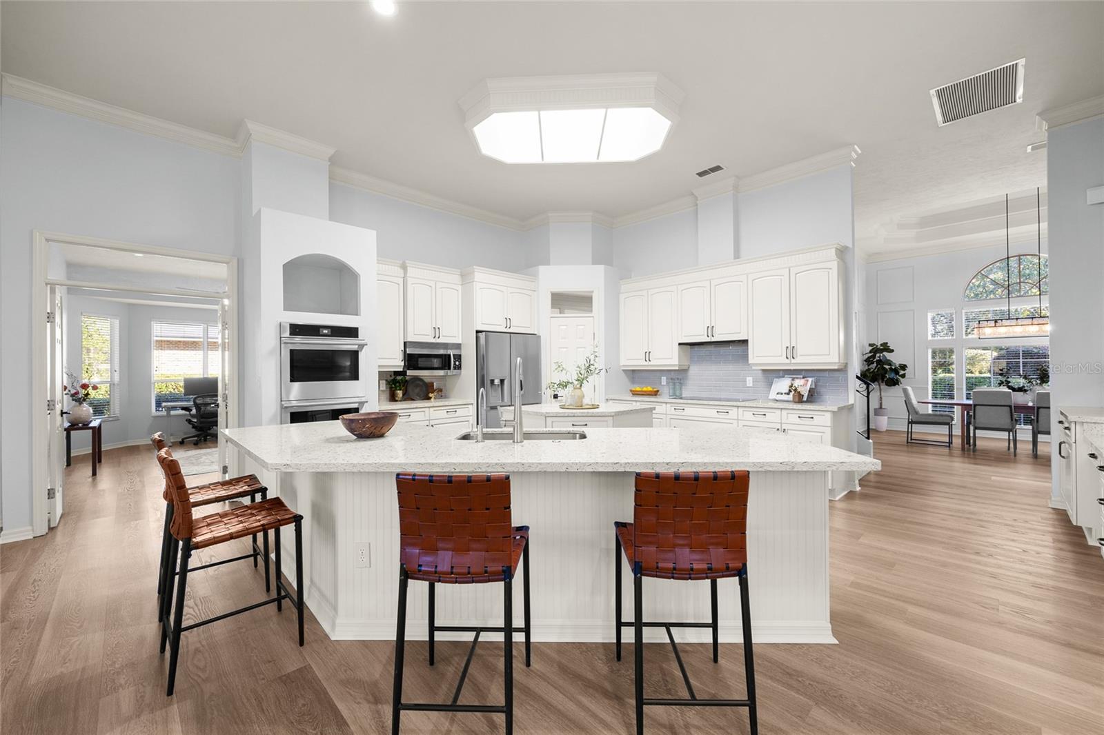 Under contract-accepting backup offers. Welcome home to your beautifully updated Haile Plantation India Station estate, set on one of the most desirable golf course lots in Hawkstone Country Club, with sweeping views of the signature 10th hole. This stately home offers over 4,900 square feet of thoughtfully designed living space, blending refined finishes with comfort and functionality. As you arrive, a circular driveway framed by lush landscaping creates a gracious first impression, while the oversized 3 car garage with a built in workshop adds both convenience and storage. Step inside to soaring ceilings, abundant natural light, and brand new luxury vinyl plank flooring that flows throughout the main level. Off the entry, you'll find a grand home office with French doors, a formal dining room, and a secondary living area, perfect for entertaining or creating a quiet retreat. The home features a 4 way split floor plan, ensuring privacy and space for everyone. The heart of the home is the updated kitchen, where new quartz counters, a designer backsplash, and all new stainless steel appliances make a bold, modern statement. The kitchen opens to the family room and casual dining area, all of which are flooded with natural light and framed by stunning panoramic views of the golf course. Whether you're starting your morning with a cup of coffee or winding down in the evening, the view from this space is simply unmatched. All 4.5 bathrooms have been recently renovated with a cohesive, stylish design that feels timeless yet current. Frameless glass shower enclosures, beautiful tilework, and sleek quartz countertops create a polished, spa like feel throughout. Step outside to your private outdoor oasis, featuring a resort style pool with waterfall, a granite summer kitchen, a cozy outdoor fireplace, and expansive covered patio space, all with sweeping views of the fairway. With 4 main bedrooms and 4.5 baths, the home offers incredible flexibility. Two of the spacious bedrooms are separated by a flex room perfect for an ideal bonus living space, study retreat, or playroom. The upstairs bonus room has been reimagined as a true multi purpose space with endless possibilities, perfectly complemented by the updated full bath and new wet bar with refrigerator. Whether you envision a game room, private guest suite, fitness studio, hobby room, or teen retreat, this space is ready to accommodate your lifestyle. The spacious primary suite is tucked away on the main floor and offers tranquil golf course views, a luxurious updated en suite bath with quartz counters and enlarged zero entry shower, stand alone soaking tub, separated vanities, toilet closet and dual walk in closets. Beyond the home, residents enjoy all the perks of Haile Plantation, one of Gainesville’s most sought after communities. Stroll or bike along miles of shaded walking trails that wind through lush surroundings, or head to the charming Haile Village Center for coffee, dining, boutiques, and community events including the Saturday morning farmers market. With easy access to UF Health Shands, HCA Florida North Florida Hospital, Butler Plaza, Celebration Pointe, and I 75, the location offers unmatched convenience while preserving a peaceful, neighborhood feel. This exceptional property offers more than a home, it offers a lifestyle. Schedule your private tour today.