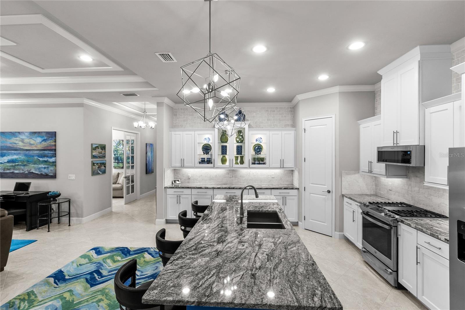 Welcome to an exceptional 5 bedroom, 3 full bath home in the heart of Oakmont, one of Southwest Gainesville’s most sought-after communities, where refined design meets peaceful privacy. From the moment you step inside, you’ll notice the attention to detail—porcelain tile laid on the diagonal creates a bright, flowing feel, complemented by soaring 10’ and 11’ ceilings, extensive crown molding, and custom ceiling details that elevate the formal living spaces. The home is beautifully appointed with engineered white oak flooring in all bedrooms, no carpet or LVP throughout, and thoughtfully selected lighting that highlights every room. The kitchen is both stunning and functional, featuring premium cabinetry with glass display uppers accented by LED lighting, a dramatic tumbled marble backsplash extended to the ceiling, luxurious countertops, a low-profile microwave, and a paintable, trim-wrapped island that anchors the open-concept living area. Quartz countertops and framed mirrors continue the upscale finishes throughout all bathrooms, along with upgraded glass shower enclosures. Plantation shutters, custom fixtures, LED lighting throughout, and a well-designed laundry room with cabinetry and sink add both style and convenience. Designed for effortless indoor-outdoor living, the extended covered lanai opens to a private backyard that backs to a dedicated treed conservation area, offering a serene, wooded backdrop. Extensive exterior stone accents, upgraded landscaping around the entire home, paver driveway and walkways, exterior LED night lighting, and a quiet, well-insulated interior further enhance the home’s comfort and curb appeal. Oakmont offers more than just a beautiful home—it delivers a true lifestyle. Residents enjoy a resort-style Residents’ Club with a spectacular pool and splash pad, fitness center, tennis and basketball courts, walking trails, and vibrant community events throughout the year. Conveniently located with quick access to I-75, Haile Village, Butler Plaza, the University of Florida, and Shands Hospital, this home offers the perfect blend of privacy, luxury, and connectivity. If you’ve been searching for a thoughtfully upgraded five-bedroom home in a quiet, private setting with all the benefits of resort-style living, this is the one. Schedule your private showing today.