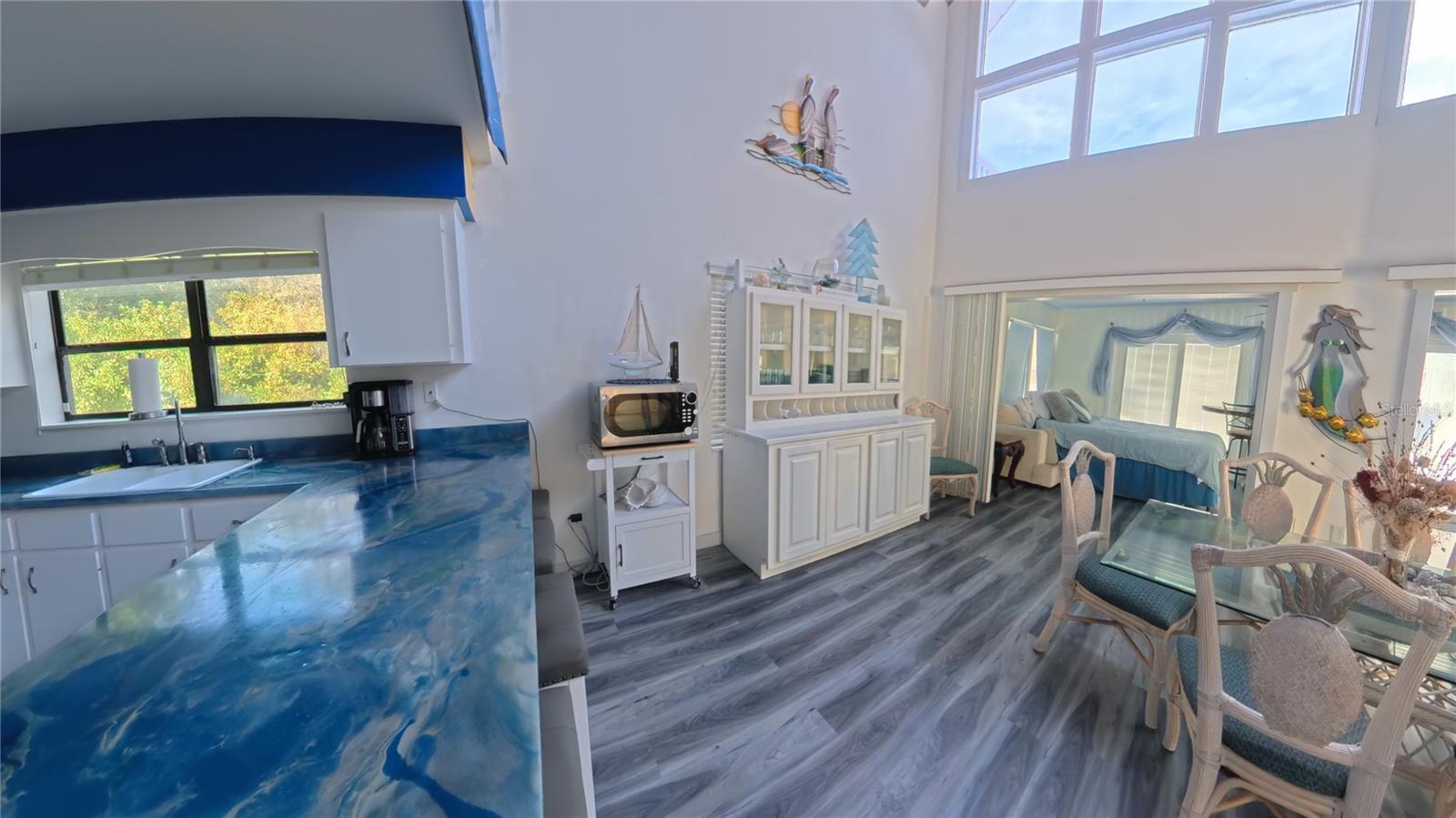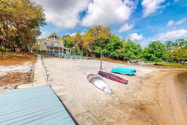 FULLY FURNISHED, INCLUDES,UTILITIES, INTERNET AND WATER,Rent this beautiful 2 bedroom, Loft with queen bed, 2 1/2 bathrooms and relax with the family at this quiet place to stay. Wake up to sunrises over lake, enjoy your coffee on balcony. Play, fish, kayak or paddleboat on the private beach & dock. Cook in a well equipped kit., grill or dine out at many fine area restaurants. 30 min to Gainesville, enjoy many activities or go to the springs and see the manatees. On the downstairs floor there is the master bedroom with a Queen bed with a full bathroom and a double sink. there is a 1/2 bath off the the Kitching and then in the living room which is very large with two sofas. the balcony is off the living room. Up Stairs there is a loft with a full size bed and in the bedroom 4 twin size beds a full bath with a double sink.