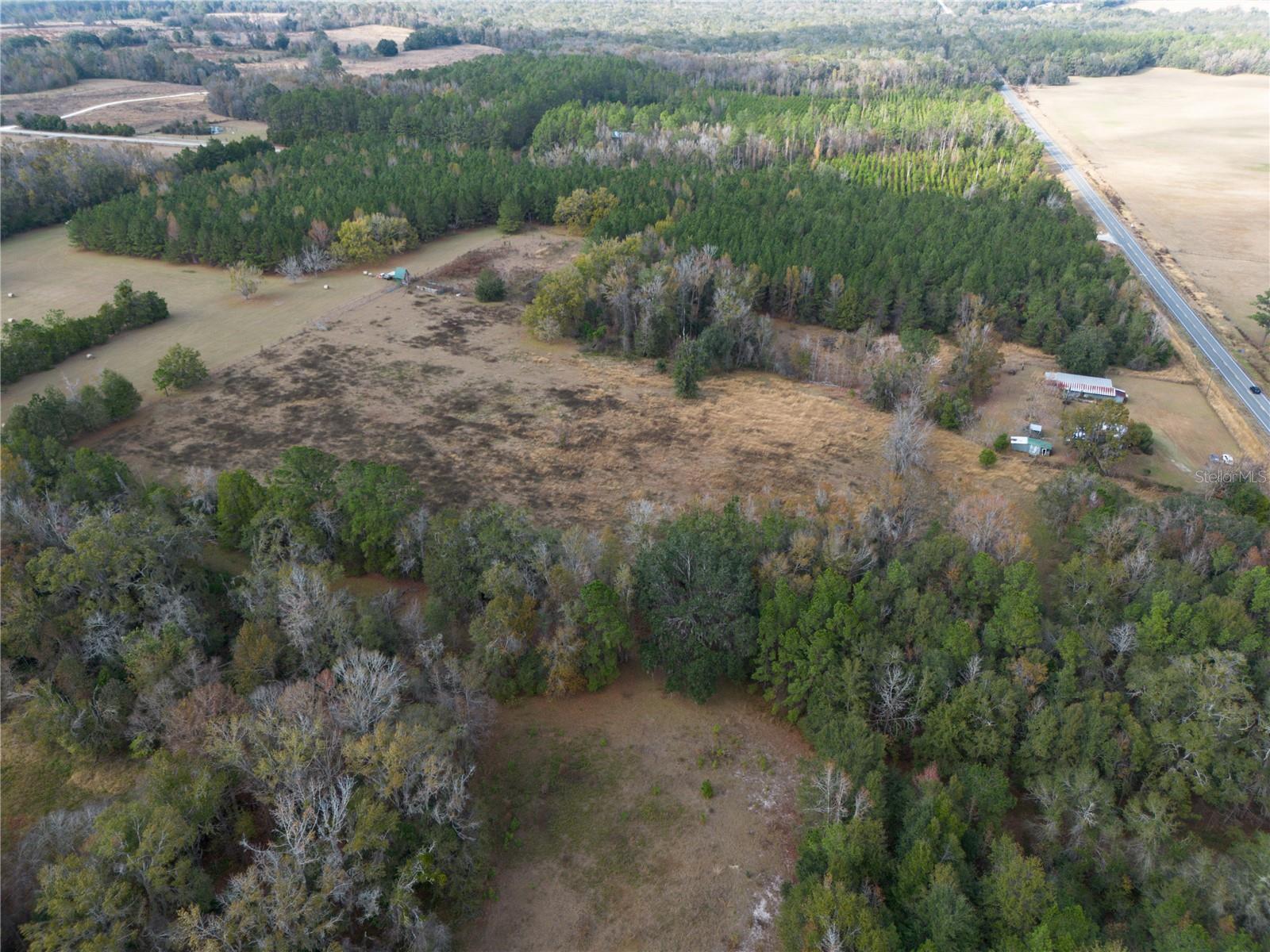 Under contract-accepting backup offers. Just under 56 acres in a highly desirable rural area of Alachua County. The property is located in Flood Zone X and is mostly wooded with established hardwoods, offering privacy, abundant wildlife, and long-term timber potential. A few open pasture areas provide usable space for farming, livestock, gardening, food plots, or selective clearing to expand your homestead vision. A small pond adds natural water access for wildlife or animals. A 2BR/1BA single-wide mobile home built in 1971 remains on site, offering possible restoration, weekend use, or a place to stay while building a new home. Included on the property are multiple storage buildings and a barn for equipment, tools, feed, or recreation gear. Located on a corner lot with paved road access from two sides, this property offers both seclusion and convenience being just minutes from High Springs or Alachua. Its proximity to I-75 allows for quick travel to Gainesville or Lake City. A versatile opportunity for homestead buyers, farmers, timber investors, and outdoor recreation enthusiasts seeking acreage with infrastructure already in place and room to grow. ** Boundary lines are approximate, not an actual survey. Information is deemed reliable but not guaranteed; buyers should perform their own due diligence to confirm all property details.** Also listed under Vacant Land GC535919