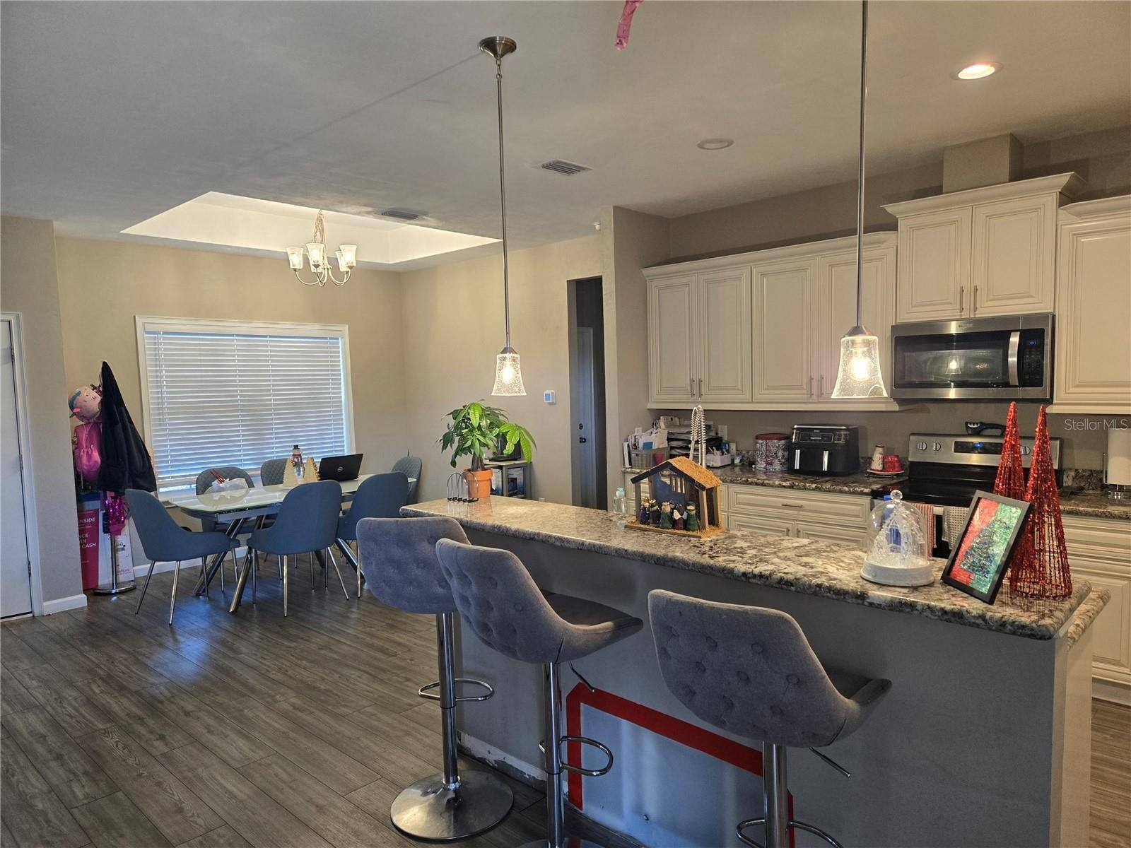 - Ceiling Fans(s), Eat-in Kitchen, High Ceilings, Kitchen/Family Room Combo, L Dining, Open Floorplan, Primary Bedroom Main Floor, Stone Counters, Thermostat, Tray Ceiling(s), Walk-In Closet(s), Window Treatments