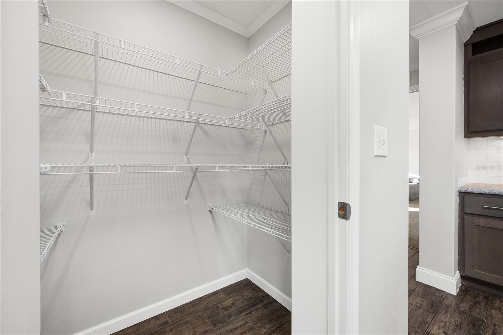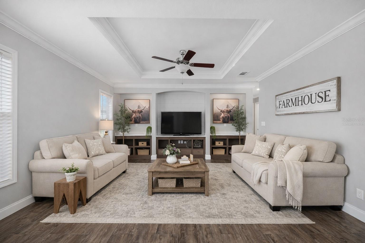 - Built-in Features, Ceiling Fans(s), Crown Molding, Eat-in Kitchen, Kitchen/Family Room Combo, Living Room/Dining Room Combo, Open Floorplan, Primary Bedroom Main Floor, Solid Surface Counters, Solid Wood Cabinets, Split Bedroom, Thermostat, Tray Ceiling(s), Walk-In Closet(s), Window Treatments