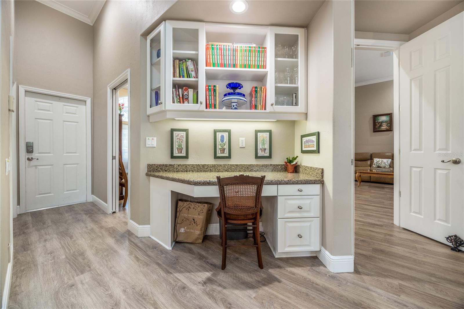 - Built-in Features, Ceiling Fans(s), Crown Molding, Eat-in Kitchen, High Ceilings, Kitchen/Family Room Combo, L Dining, Living Room/Dining Room Combo, Open Floorplan, Primary Bedroom Main Floor, Solid Surface Counters, Solid Wood Cabinets, Thermostat, Walk-In Closet(s), Window Treatments