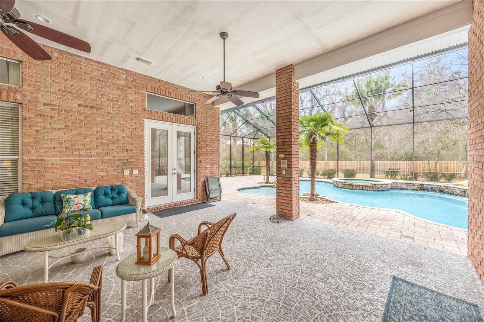 Enjoy effortless luxury in this one-story all-brick home featuring a spectacular pool, spa-like primary suite, and beautifully updated interiors in a sought-after gated community. Elegant one-story all-brick home in the gated community of Woodfield, nestled on a park-like 1.03-acre setting. The private, fenced backyard offers an ideal outdoor retreat. This spacious home features 4 bedrooms, 4 bathrooms, and a large flex space off the expansive family room, complete with a gas fireplace and custom built-in shelving. The updated kitchen boasts granite countertops, stainless steel appliances, a walk-in pantry with a second refrigerator, and a convenient built-in desk area. Formal dining and living rooms showcase French doors that open to a covered porch and an extraordinary pool area, creating seamless indoor-outdoor living. This home has been extensively updated, including all bathrooms, flooring, and the kitchen. The expansive primary suite features a spa-like en suite with French doors leading directly to the pool, a walk-in shower, and a freestanding soaking tub. Soaring 12-foot ceilings throughout enhance the open, airy feel. All appliances and window coverings are included. This pristine, special property is truly move-in ready.