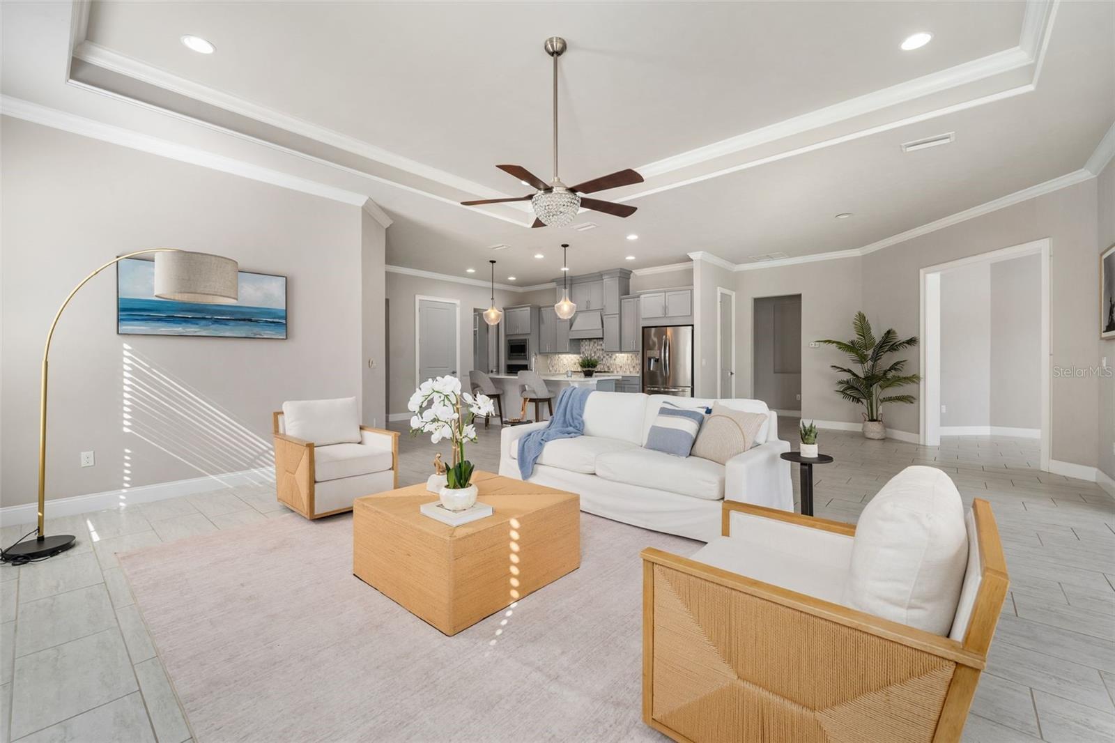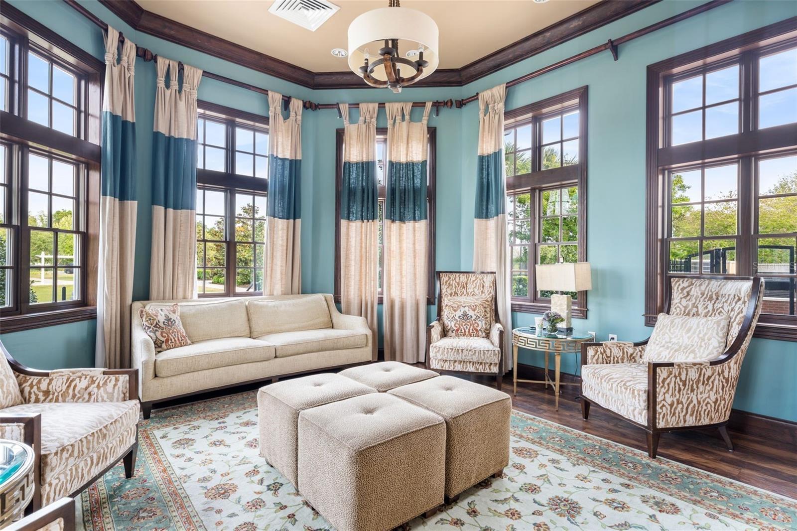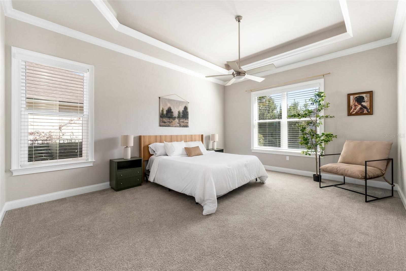 - Ceiling Fans(s), Crown Molding, Eat-in Kitchen, High Ceilings, Kitchen/Family Room Combo, Open Floorplan, Primary Bedroom Main Floor, Solid Surface Counters, Solid Wood Cabinets, Split Bedroom, Thermostat, Tray Ceiling(s), Walk-In Closet(s), Window Treatments