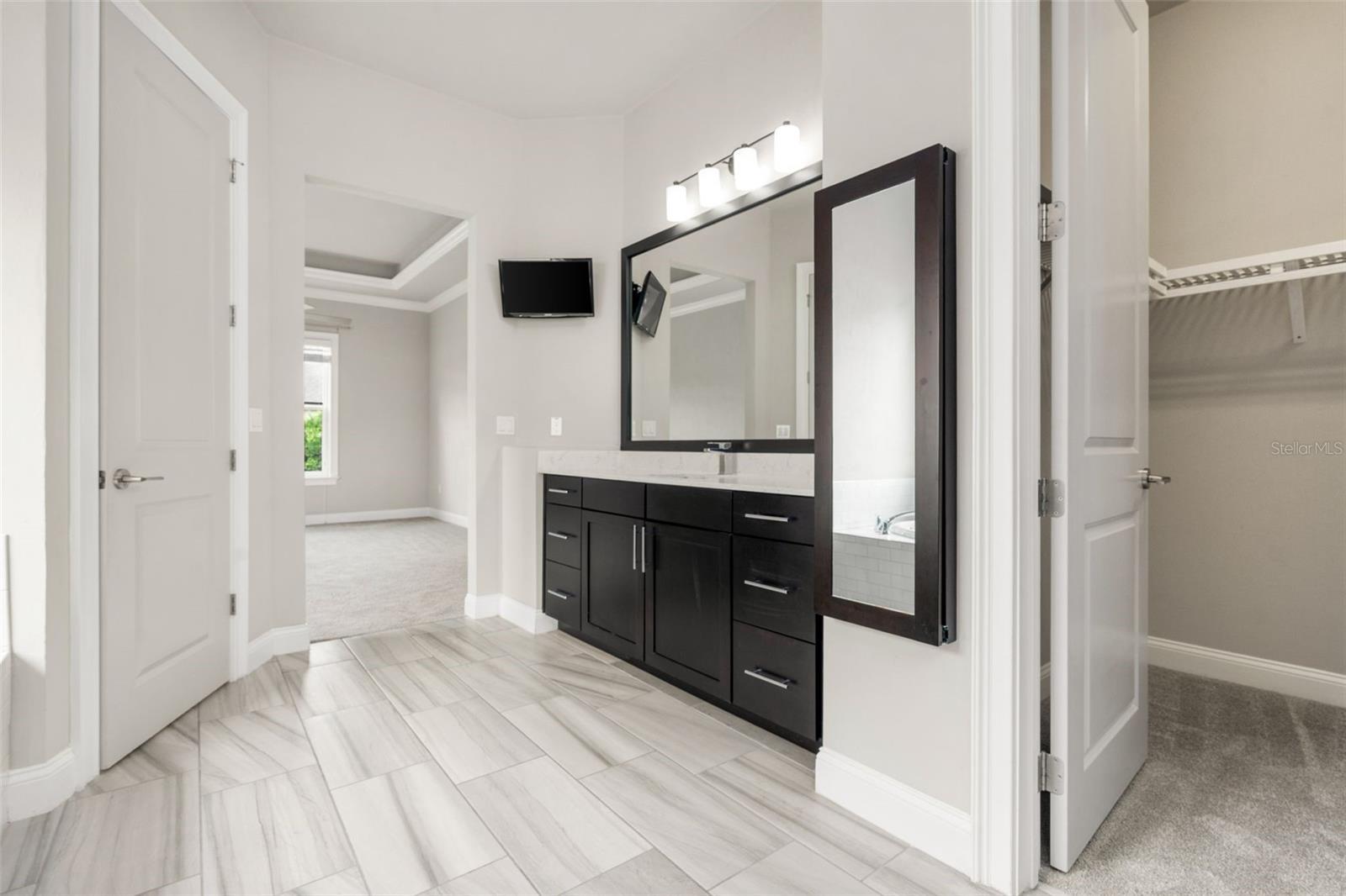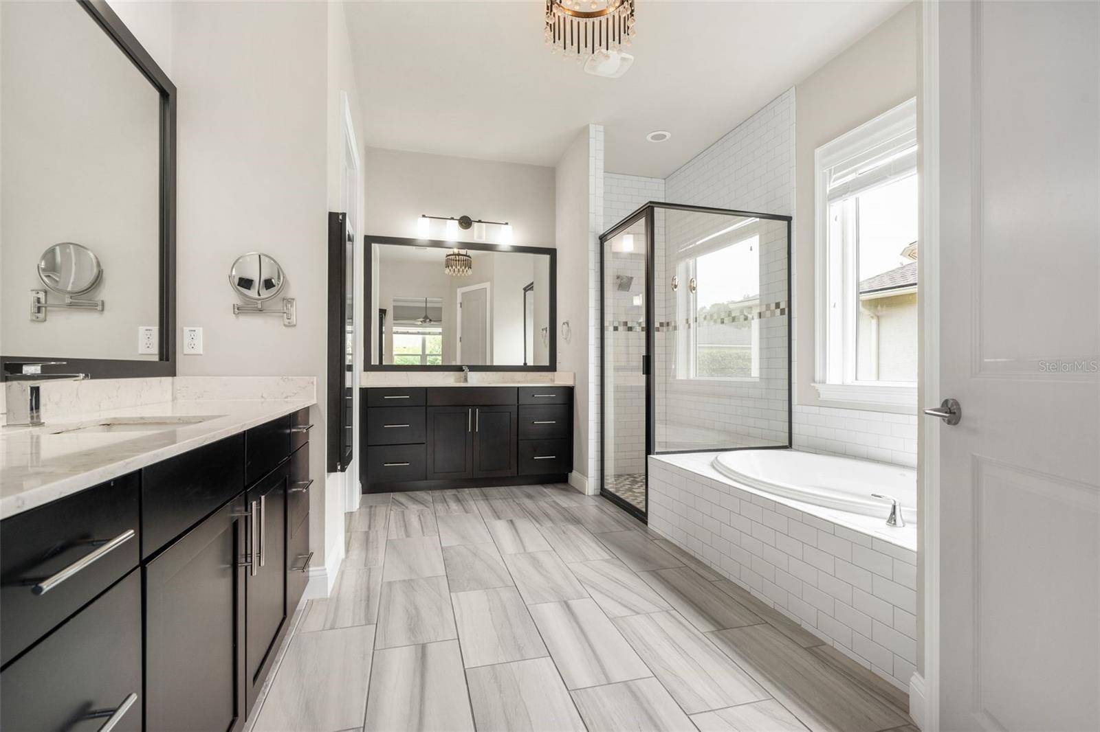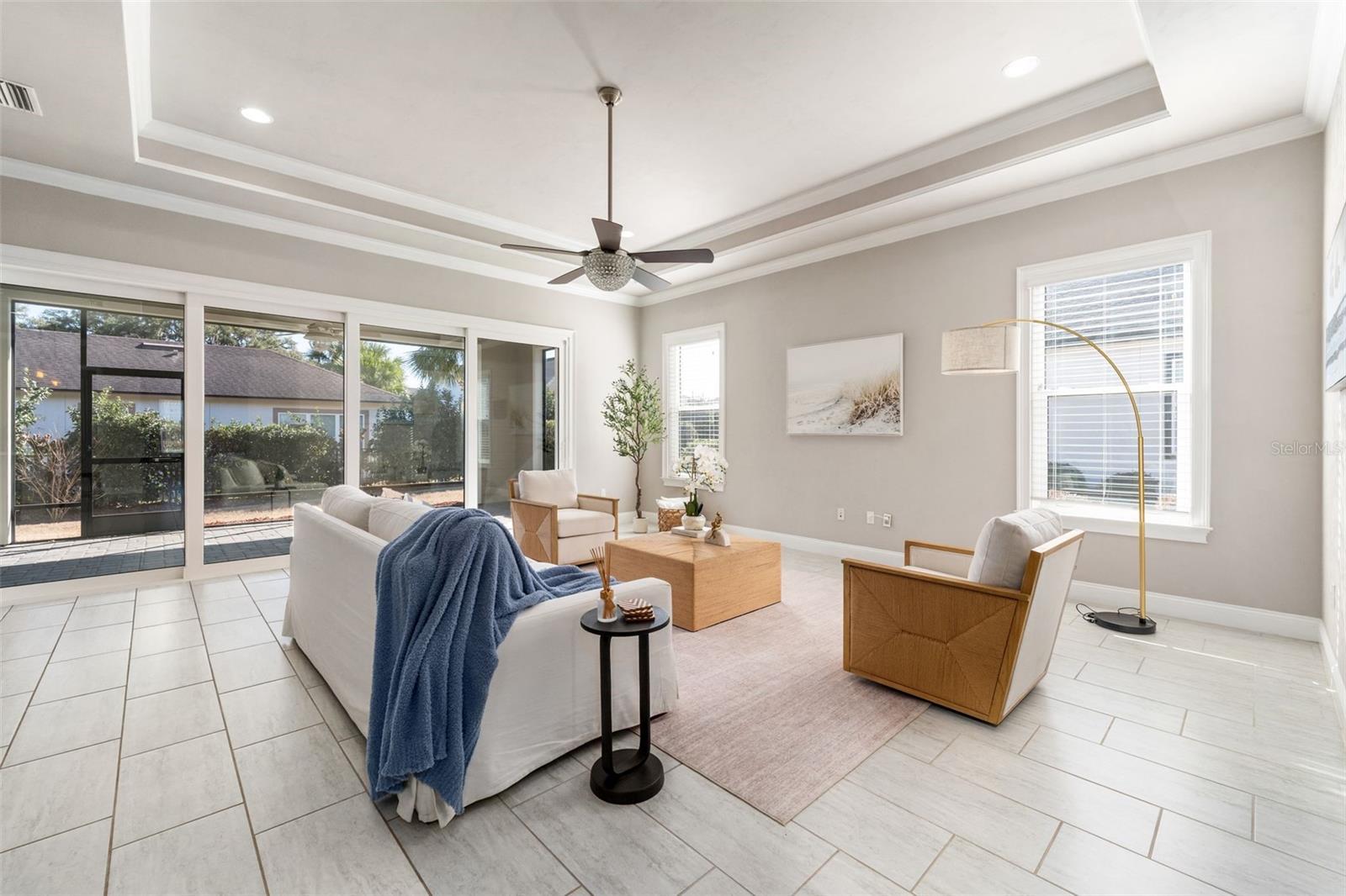 - Ceiling Fans(s), Crown Molding, Eat-in Kitchen, High Ceilings, Kitchen/Family Room Combo, Open Floorplan, Primary Bedroom Main Floor, Solid Surface Counters, Solid Wood Cabinets, Split Bedroom, Thermostat, Tray Ceiling(s), Walk-In Closet(s), Window Treatments