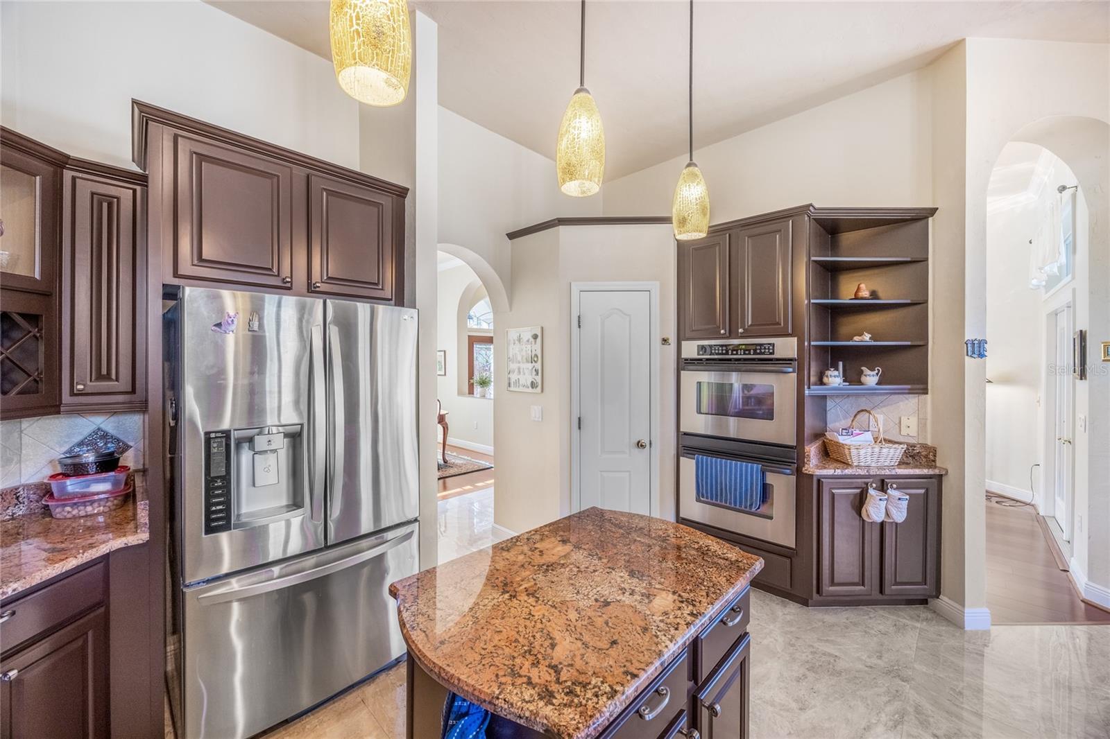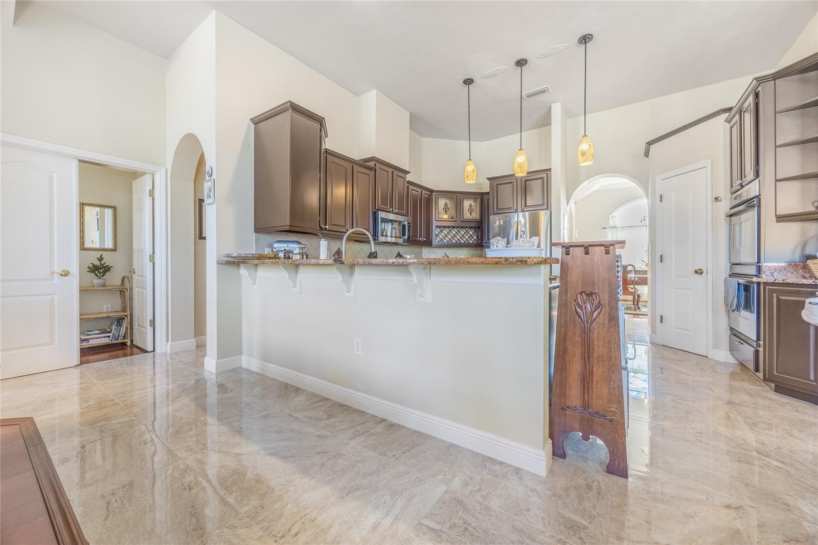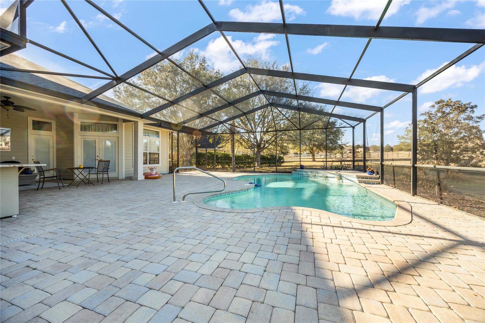 This stunning, gated community, salt water pool home sits on a picturesque 1.15 acre lot and is move-in ready. The home is highlighted by elegant wood and tile floors, granite counters, 11' ceilings, arched doorways and abundant windows radiating outstanding natural light across the spaciously open plan. Prepare meals with flare in your inviting kitchen with recently refinished, raised panel wood cabinets, stainless appliances, gas range, dual ovens, newer dishwasher, built-in wine rack, convenient pantry and nook. The delightfully inviting family room features gorgeous vaulted ceilings, a cozy gas fireplace and stellar windows. The separate living and dining rooms exude elegance with crown molding, a large china cabinet niche and French doors leading to the picturesque screened lanai. Relax, play or entertain on the expansive paver patio beside the sparkling pool and enjoy grilling at the festive bar and summer kitchen while admiring the beautifully manicured back yard. The tranquil primary bedroom includes his and her walk-ins, refinished wood cabinets, dual vanities, glassed-in shower and a jetted tub. French doors lead to the beautifully, bright study w/closet that could easily serve as a 5th bedroom. Additional highlights include 2023 roof, 2014 HVAC, exterior landscape lighting, recently refinished garage flooring, multiple new plumbing fixtures and toilets and newer laundry sink. All of this in an extraordinary community, with excellent schools, down the street from the Market Square Publix shopping and dining and an easy commute to UF, Shands and North Florida Regional Medical Center.