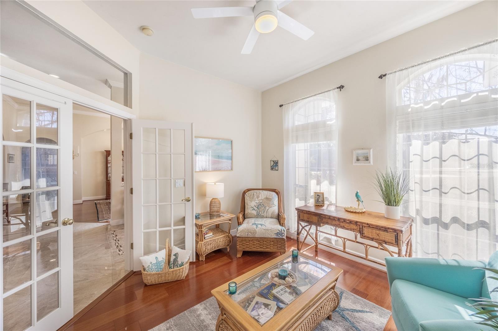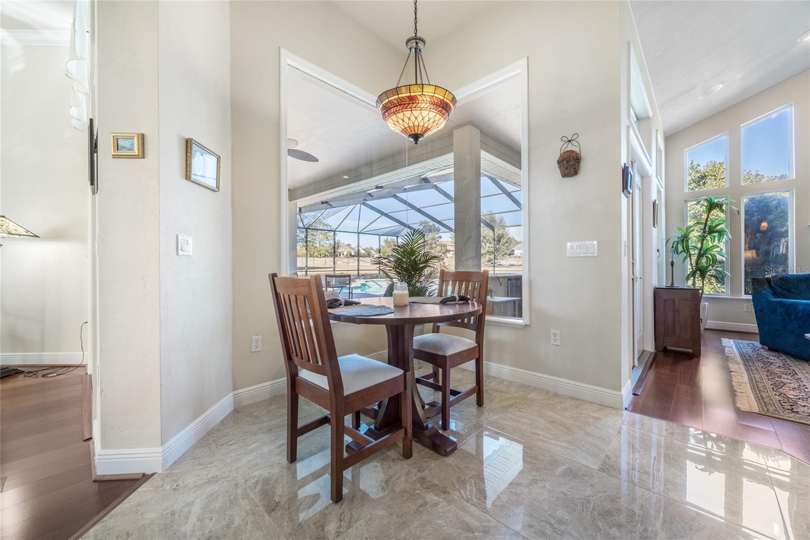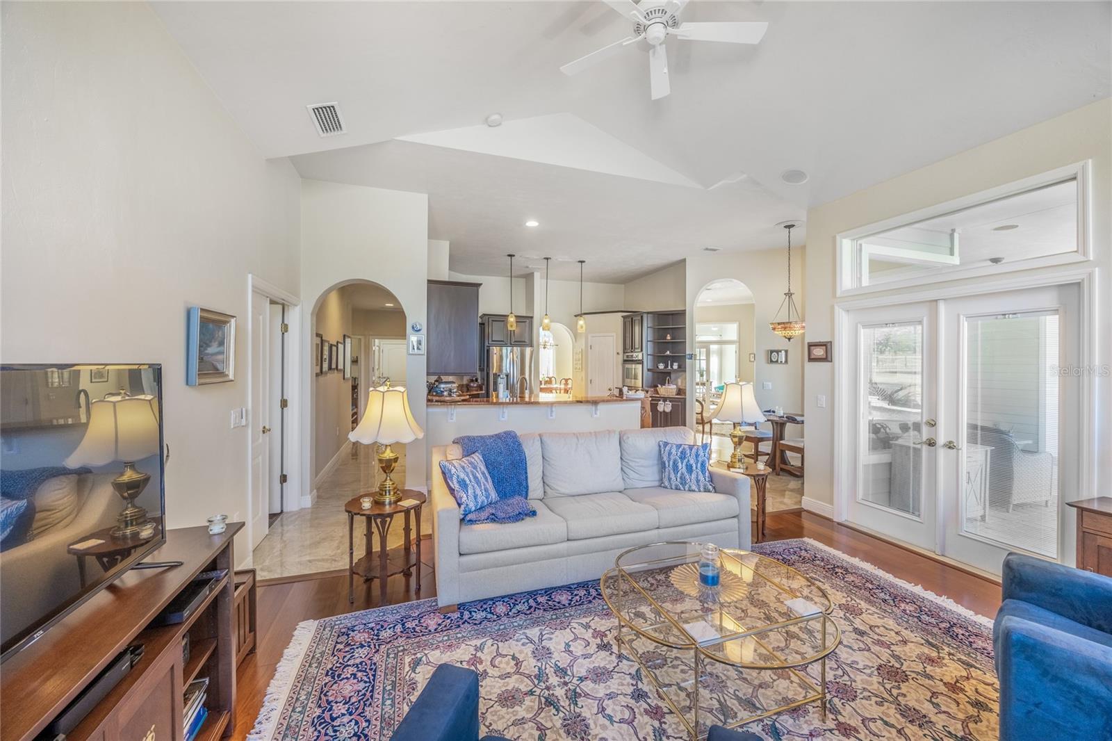 This stunning, gated community, salt water pool home sits on a picturesque 1.15 acre lot and is move-in ready. The home is highlighted by elegant wood and tile floors, granite counters, 11' ceilings, arched doorways and abundant windows radiating outstanding natural light across the spaciously open plan. Prepare meals with flare in your inviting kitchen with recently refinished, raised panel wood cabinets, stainless appliances, gas range, dual ovens, newer dishwasher, built-in wine rack, convenient pantry and nook. The delightfully inviting family room features gorgeous vaulted ceilings, a cozy gas fireplace and stellar windows. The separate living and dining rooms exude elegance with crown molding, a large china cabinet niche and French doors leading to the picturesque screened lanai. Relax, play or entertain on the expansive paver patio beside the sparkling pool and enjoy grilling at the festive bar and summer kitchen while admiring the beautifully manicured back yard. The tranquil primary bedroom includes his and her walk-ins, refinished wood cabinets, dual vanities, glassed-in shower and a jetted tub. French doors lead to the beautifully, bright study w/closet that could easily serve as a 5th bedroom. Additional highlights include 2023 roof, 2014 HVAC, exterior landscape lighting, recently refinished garage flooring, multiple new plumbing fixtures and toilets and newer laundry sink. All of this in an extraordinary community, with excellent schools, down the street from the Market Square Publix shopping and dining and an easy commute to UF, Shands and North Florida Regional Medical Center.