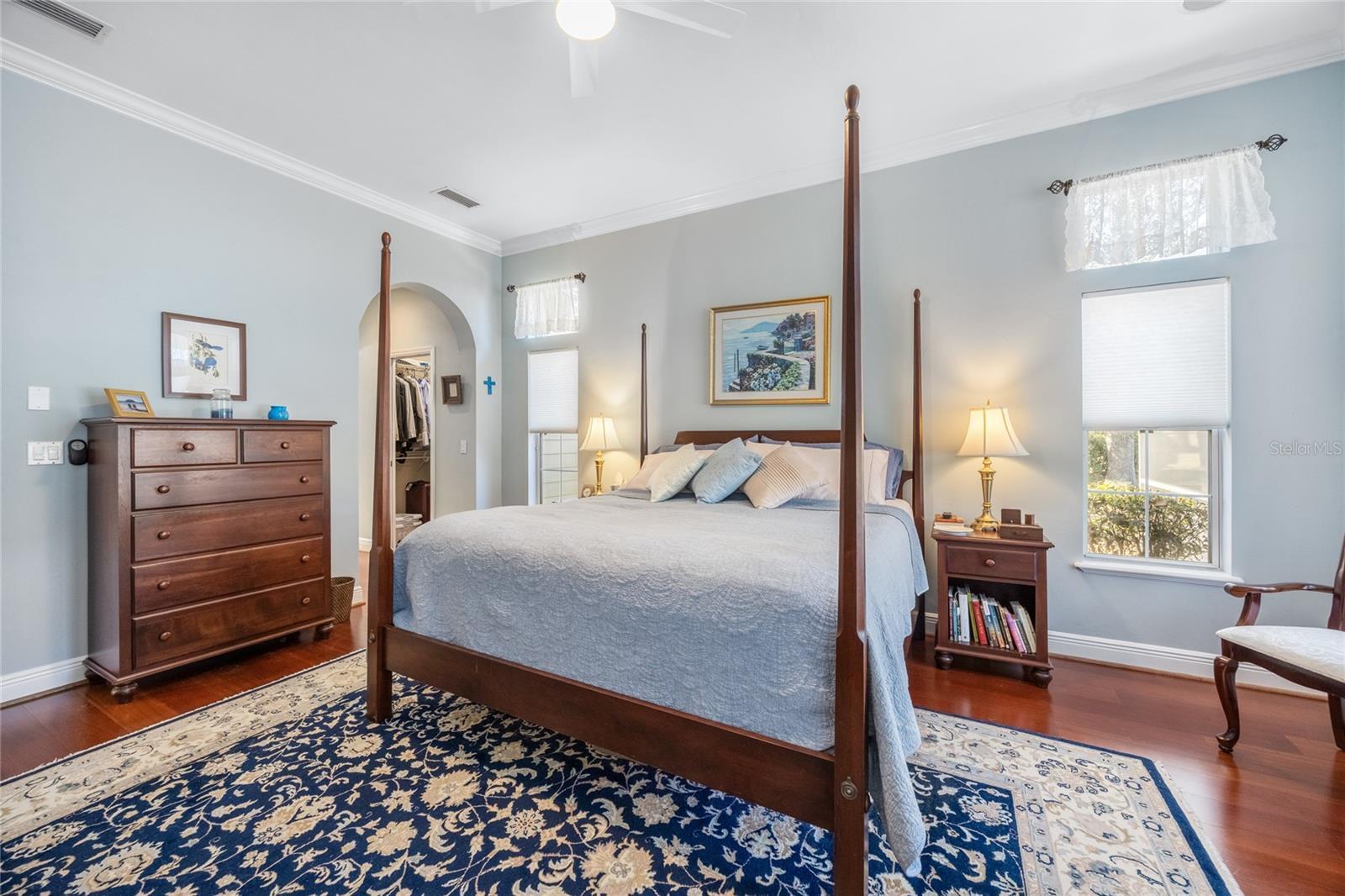 - Ceiling Fans(s), Crown Molding, High Ceilings, Open Floorplan, Solid Surface Counters, Solid Wood Cabinets, Split Bedroom, Thermostat, Walk-In Closet(s)
