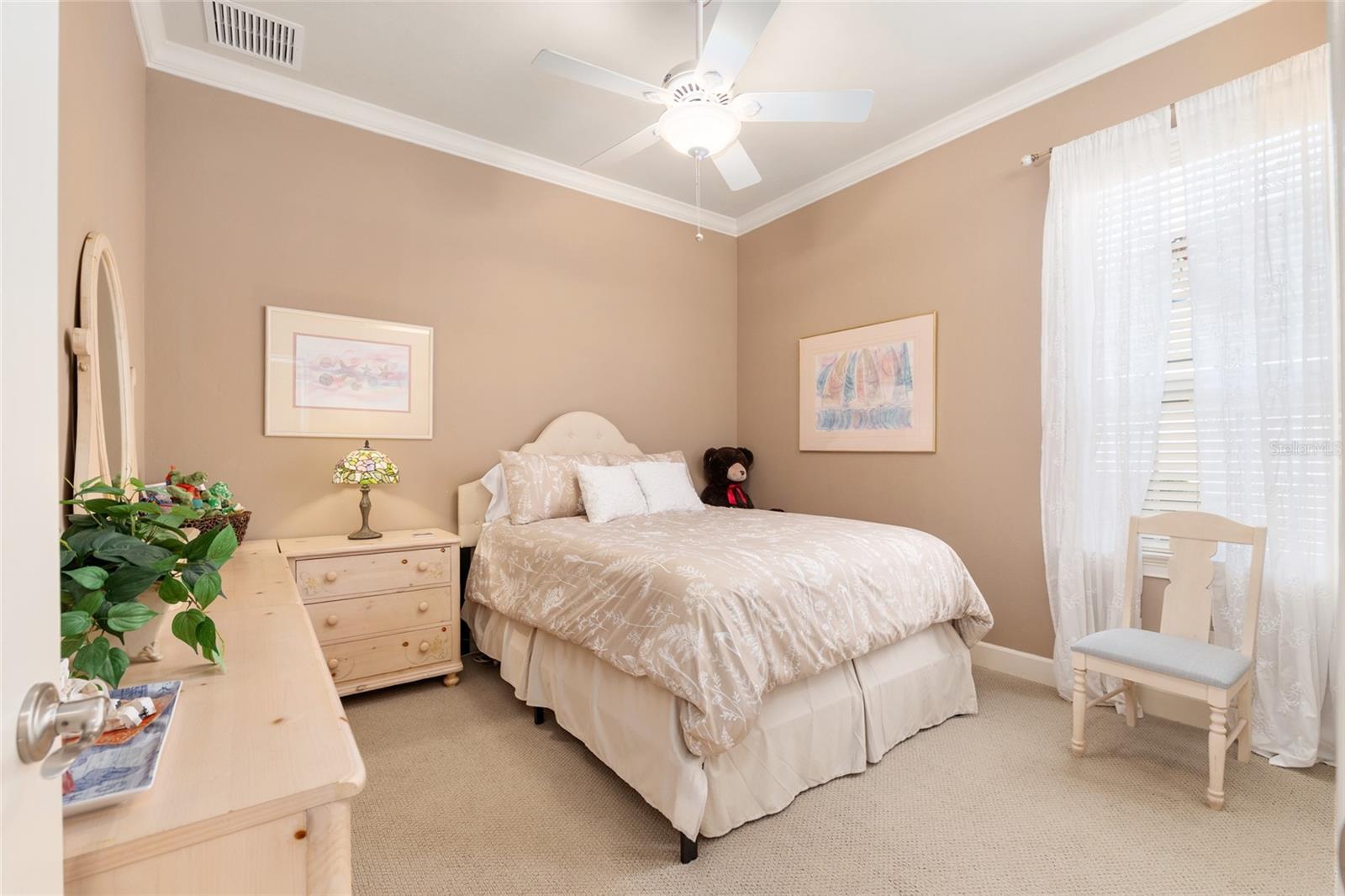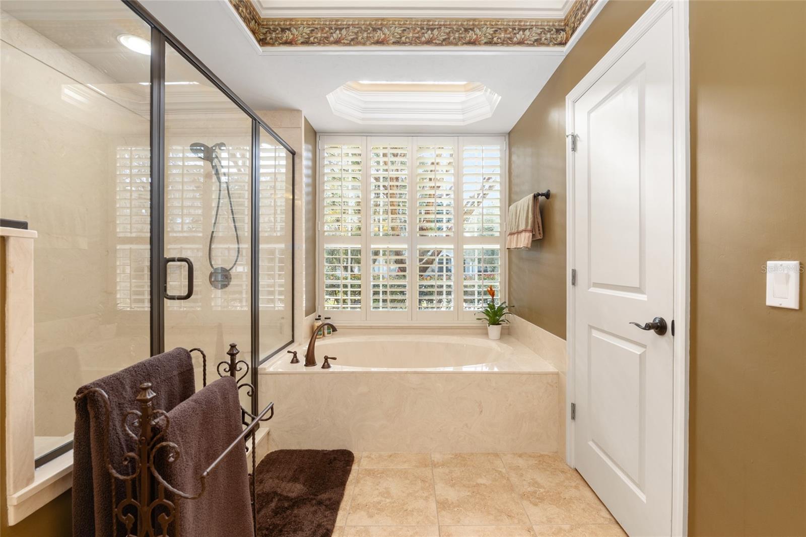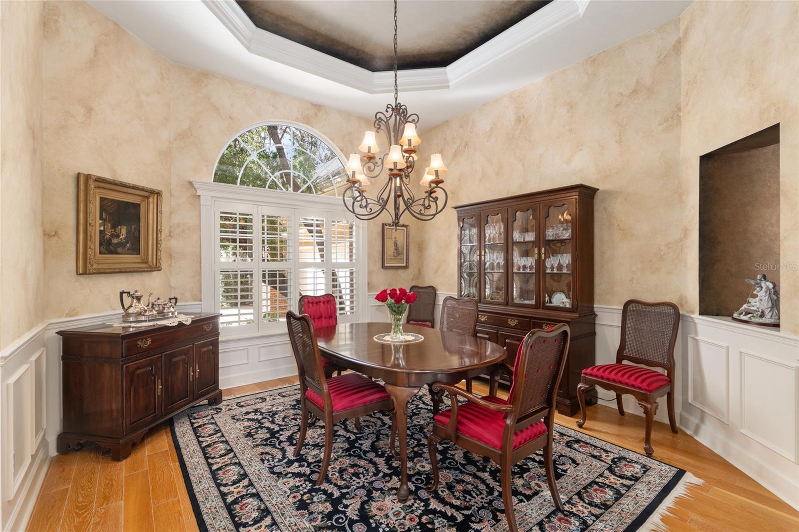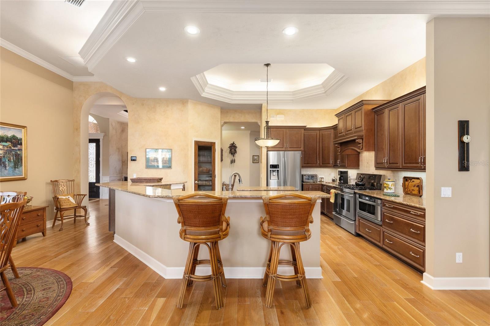 - Accessibility Features, Ceiling Fans(s), Chair Rail, Crown Molding, Eat-in Kitchen, High Ceilings, In Wall Pest System, Kitchen/Family Room Combo, Pest Guard System, Primary Bedroom Main Floor, Solid Surface Counters, Solid Wood Cabinets, Split Bedroom, Stone Counters, Thermostat, Tray Ceiling(s), Walk-In Closet(s), Window Treatments