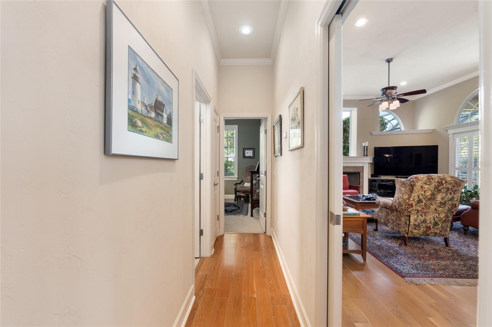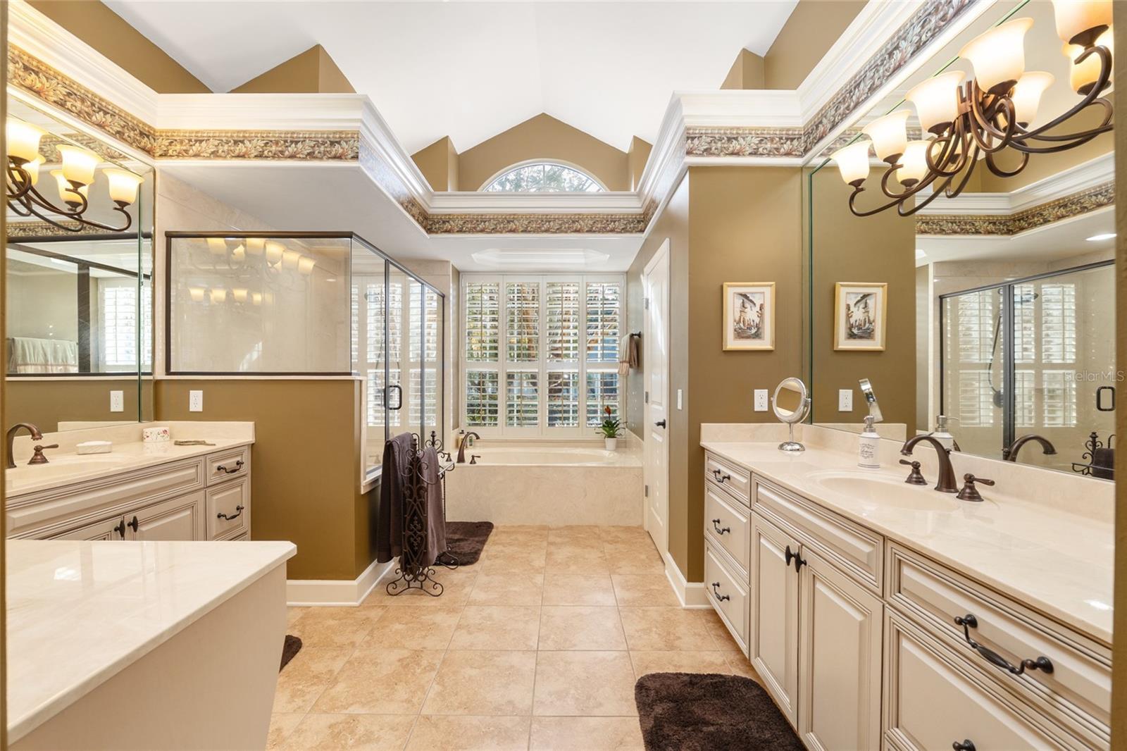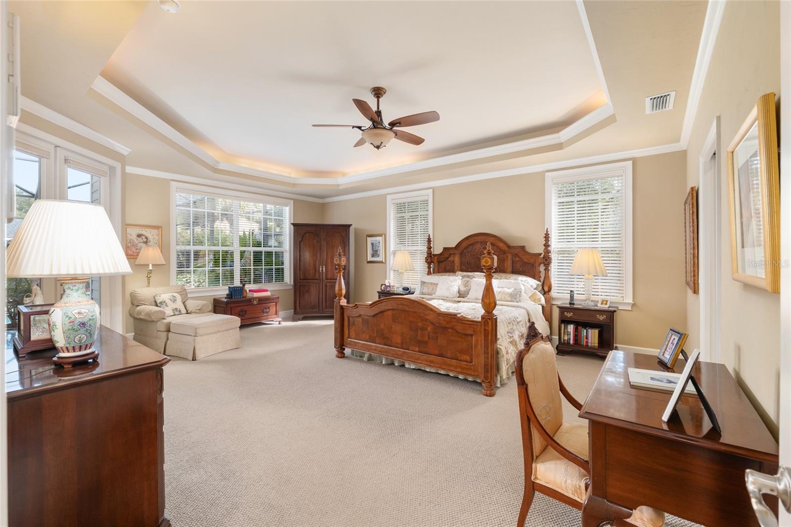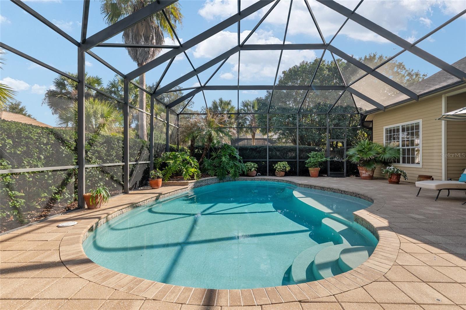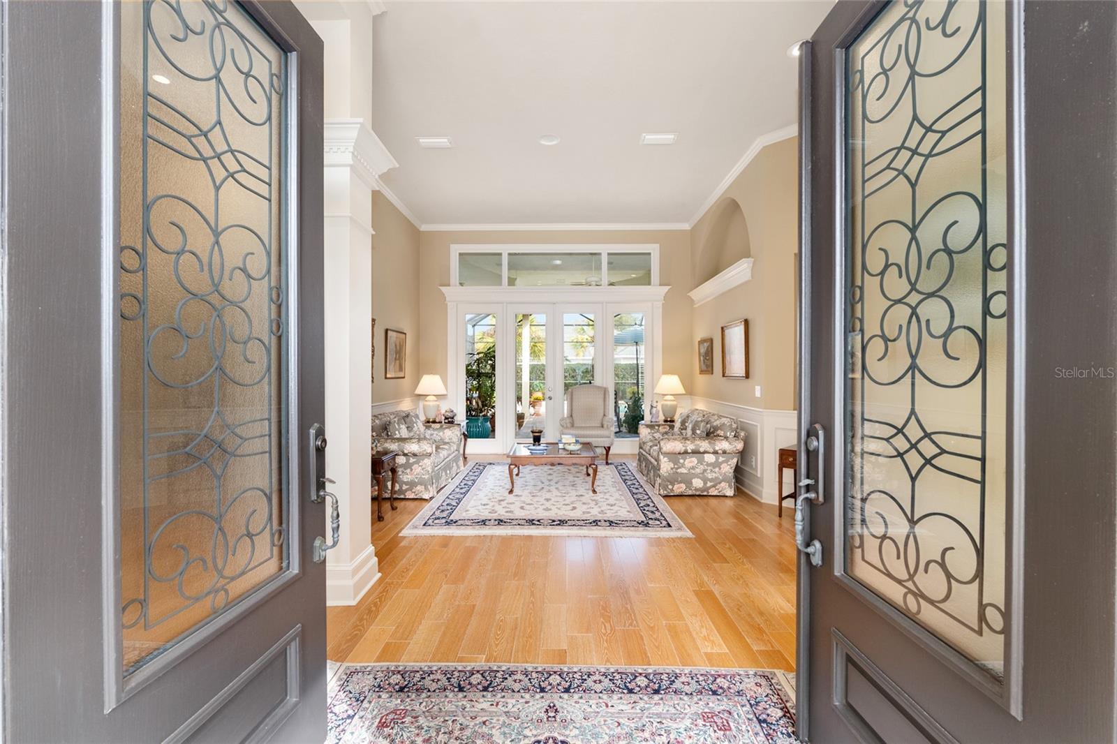Exquisite Jeffrey Wilde Parade Home offering refined luxury and timeless elegance. This exceptional residence is appointed with crown and dentil molding throughout and imported Swiss designer wood flooring in the main living areas. Grand French glass doors and expansive windows bathe the home in natural light. The gourmet kitchen is a showpiece, featuring striking granite countertops and executive 42" wood cabinetry. Elegant lighted tray ceilings enhance the kitchen, dining room, and primary suite. A spacious upstairs bonus room with full bath and custom built-in bookshelves adds versatility, while the fifth bedroom offers the option of a private study or guest retreat. The thoughtfully designed three-way split floor plan ensures privacy and comfort. Outdoors, enjoy a serene screened pool and lanai surrounded by stone pavers, creating a private resort-style setting. An oversized three-car garage and pavered driveway complete this remarkable home. Luxury living at its finest.