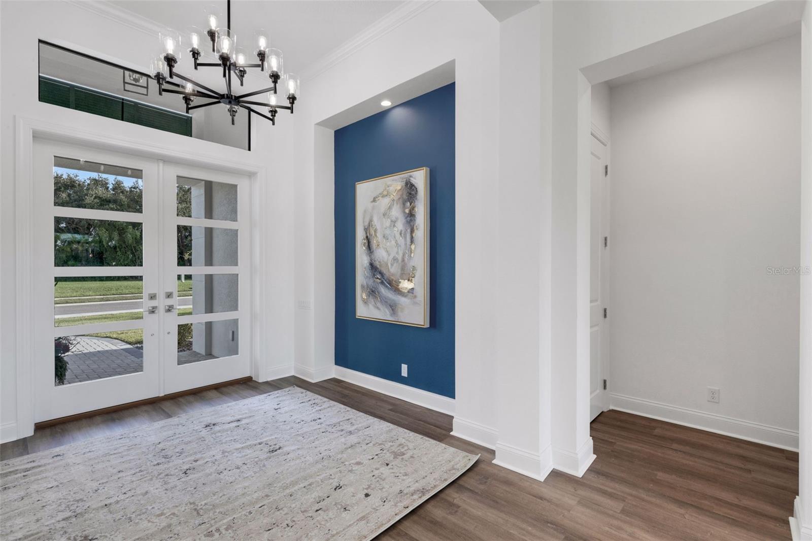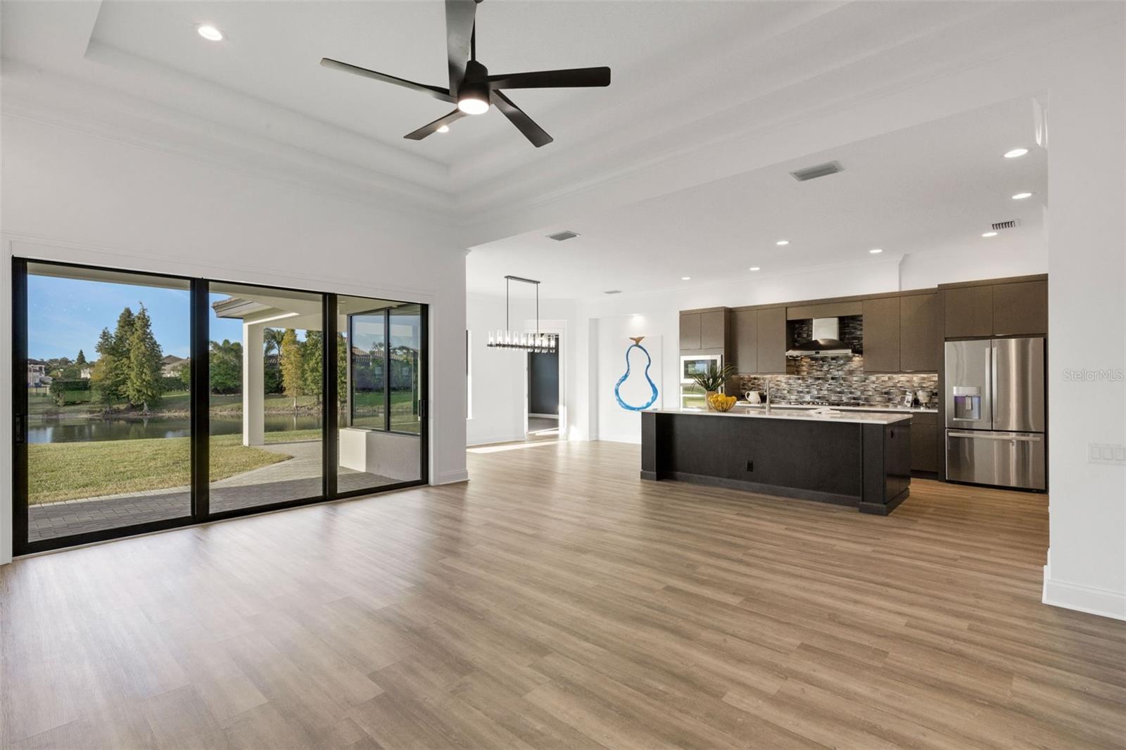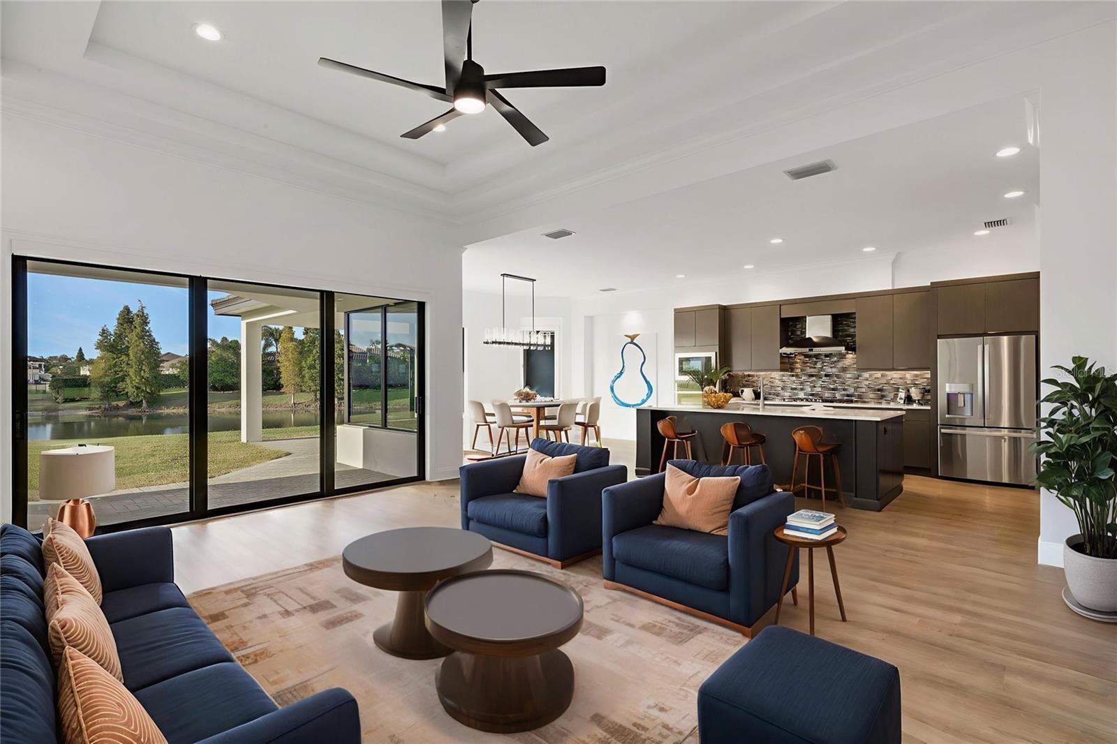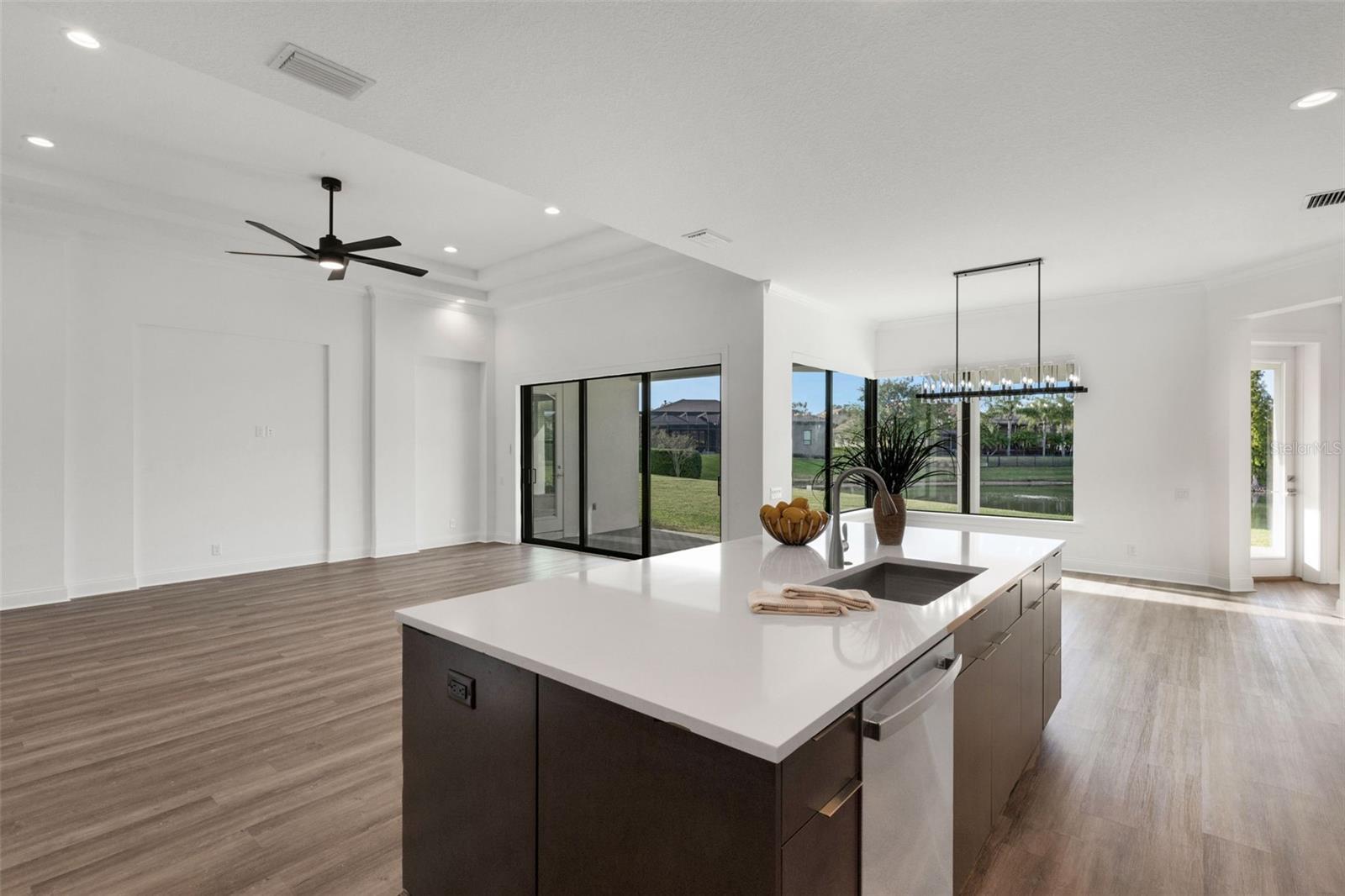 One or more photo(s) has been virtually staged. THE FINISHING TOUCHES ARE "IN" . . . by popular request the finishing features that many have asked for in this beautiful home are now installed - MOVE IN BY CHRISTMAS!!! Improvements such as custom closet organizers, designer grade light fixtures land ceiling fans, window blinds in all major windows including power roller sunshades to the great room and dining/kitchen areas. Now is the time to make this NEW one-story home your own without having to wait for the construction process. The Aruba plan by Rutenberg Homes is incredibly livable in today's world and offers an expansive, open floorplan featuring a large great room/kitchen/dining combo with 12' ceilings, luxury vinyl plank flooring, and crown molding. The 3-bedroom, 3-bath home includes a den/office/flex room overlooking the backyard and pond. The kitchen boasts a central quartz-topped island, flat panel cabinets, and a hidden walk-in pantry with a natural gas cooktop and built-in oven/microwave. The spacious laundry room fits larger front-loading washers and dryers, has storage cabinets and built-in utility sink and still has space left over for an extra refrigerator/freezer. Other interior features include whole-house pest defense systems (Tubes in the Walls), tankless whole house GAS water heater, and more. The exterior features a full brick paver driveway, walkway, front entry, and rear patio/lanai, with space for a pool or spa in the backyard, full front and rear irrigation system and water view. Sidewalks throughout the community provide pleasant walks and opportunities to meet neighbors. Located behind the gates of Grasslands Golf & Country Club (club facilities require additional fees) so well maintained that you will feel like you live in a resort EVERYDAY plus it's convenient to shopping, dining, medical facilities, and major transportation via the Polk County Parkway.