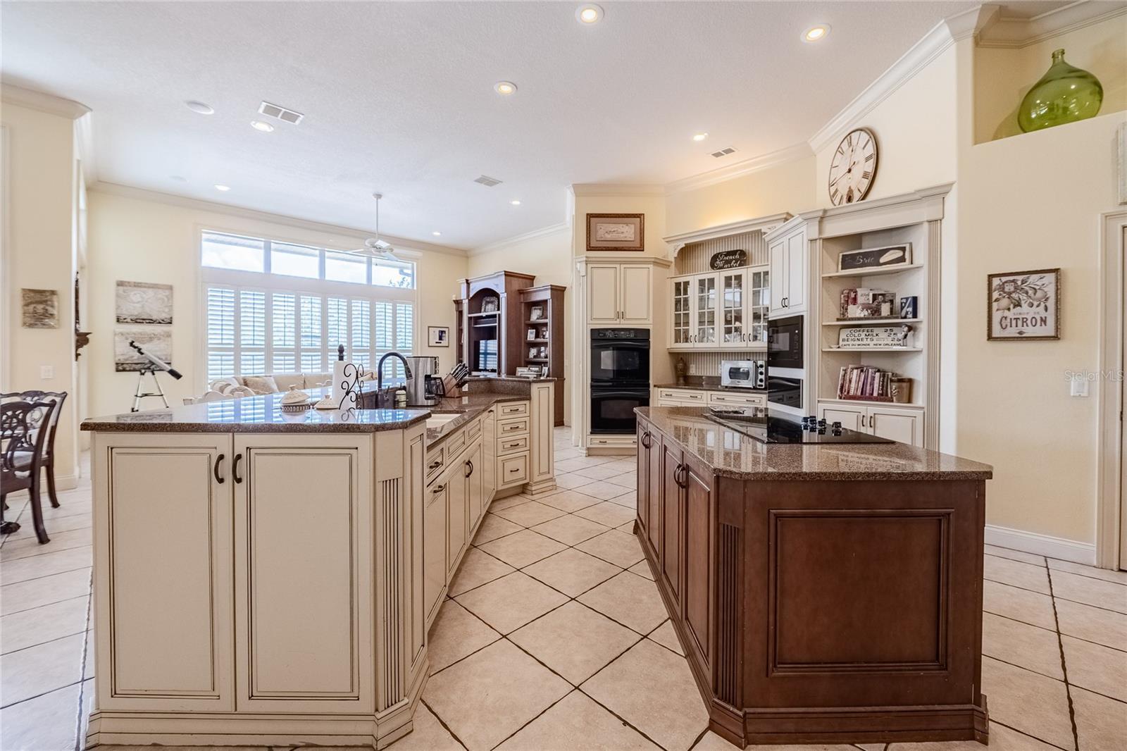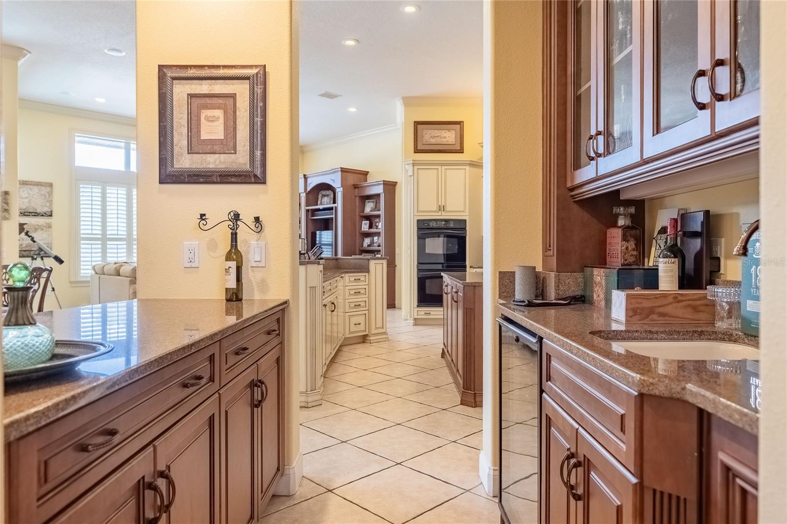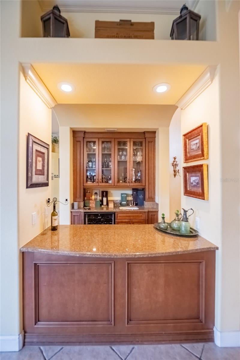 - Built-in Features, Crown Molding, Open Floorplan, Primary Bedroom Main Floor, Solid Wood Cabinets, Stone Counters, Thermostat, Wet Bar