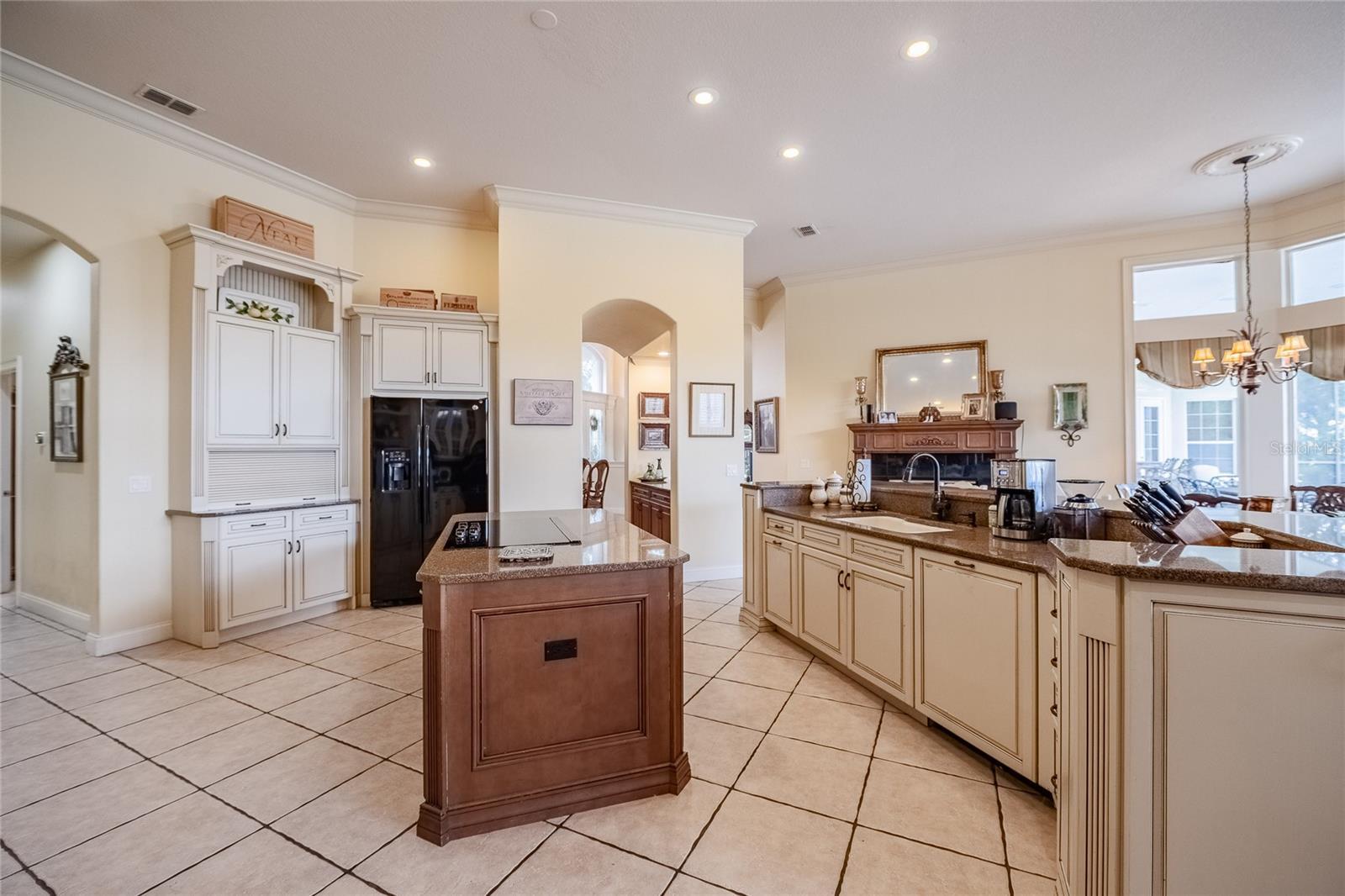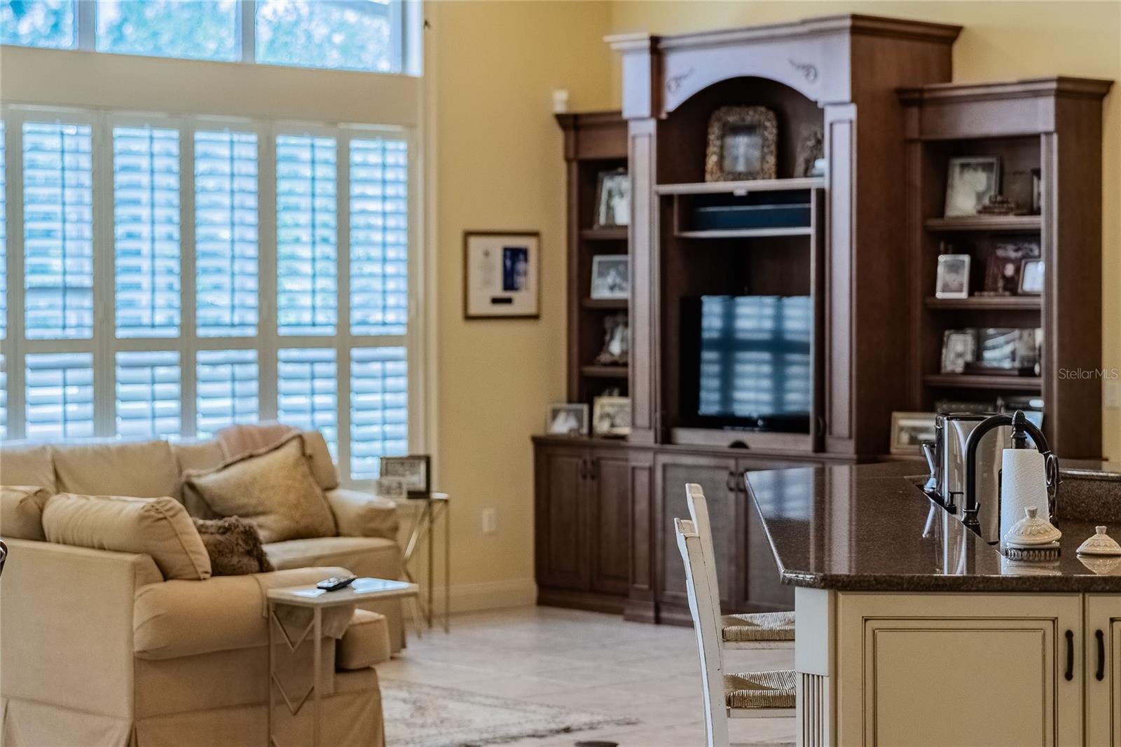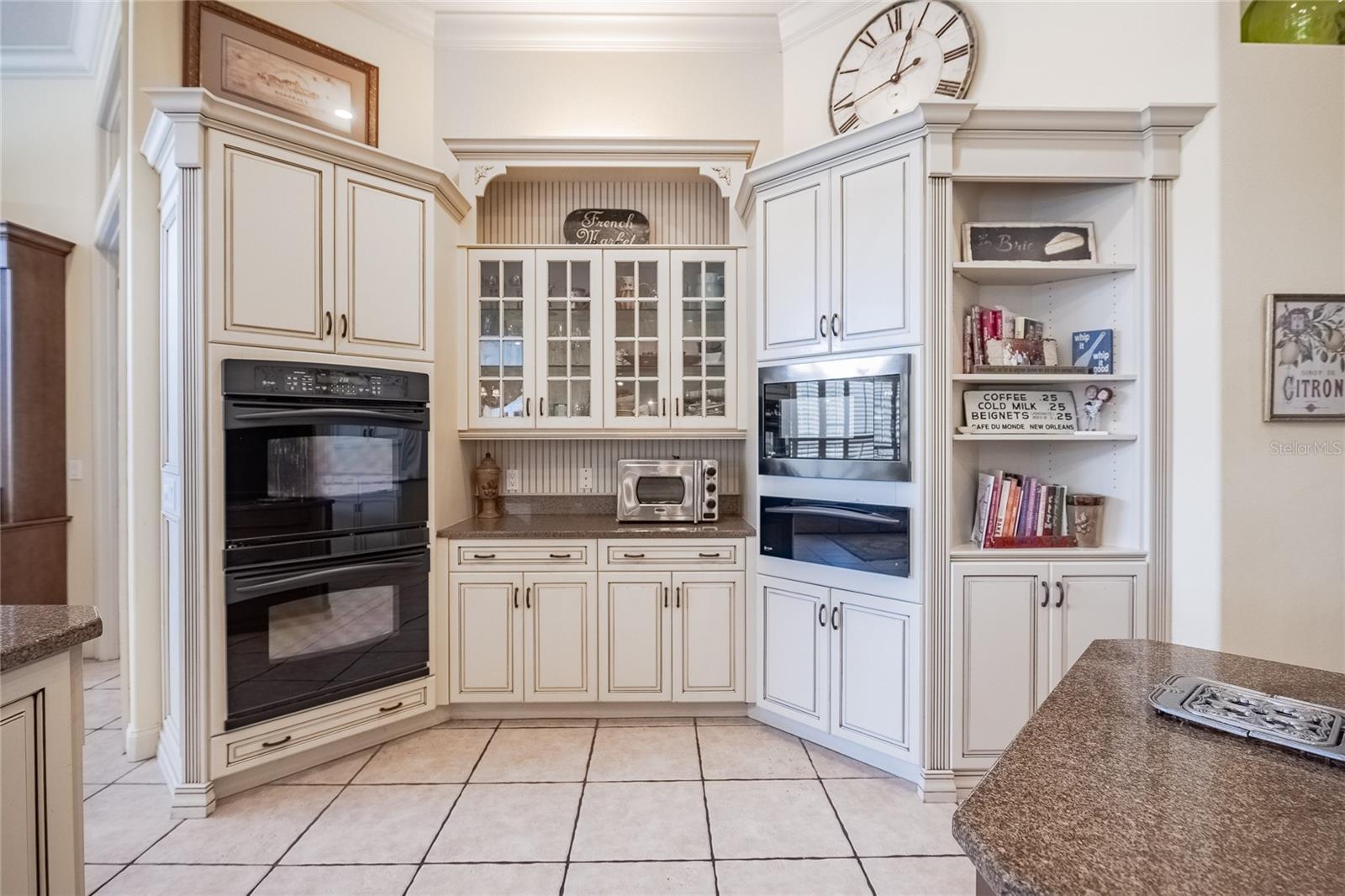 - Built-in Features, Crown Molding, Open Floorplan, Primary Bedroom Main Floor, Solid Wood Cabinets, Stone Counters, Thermostat, Wet Bar