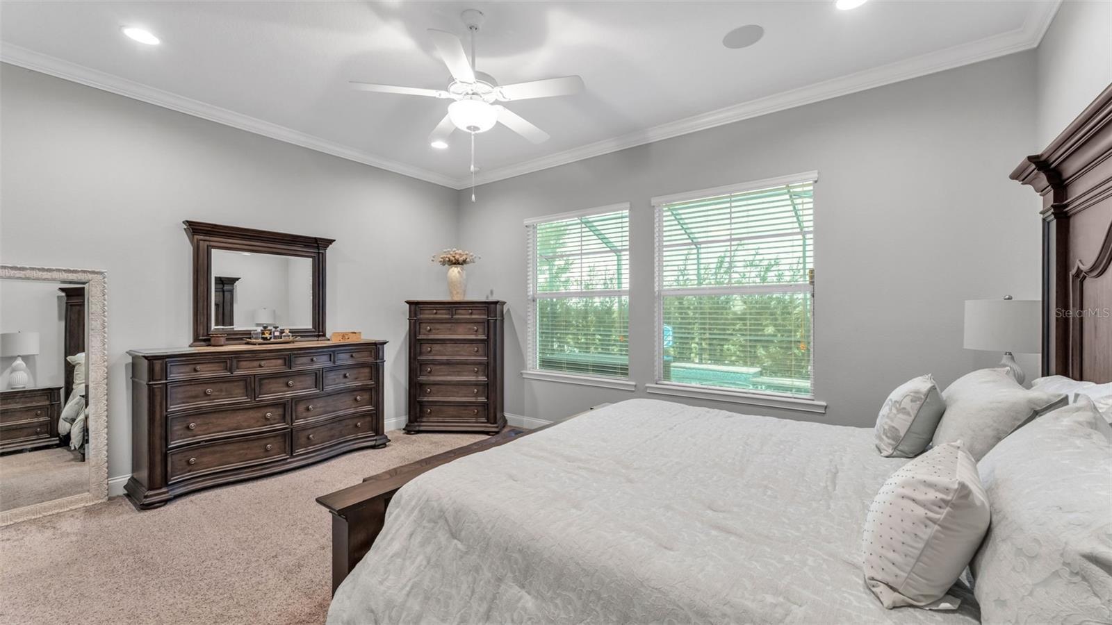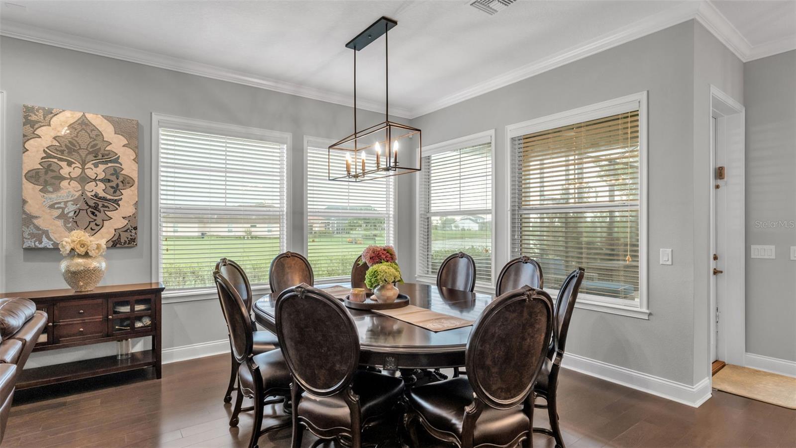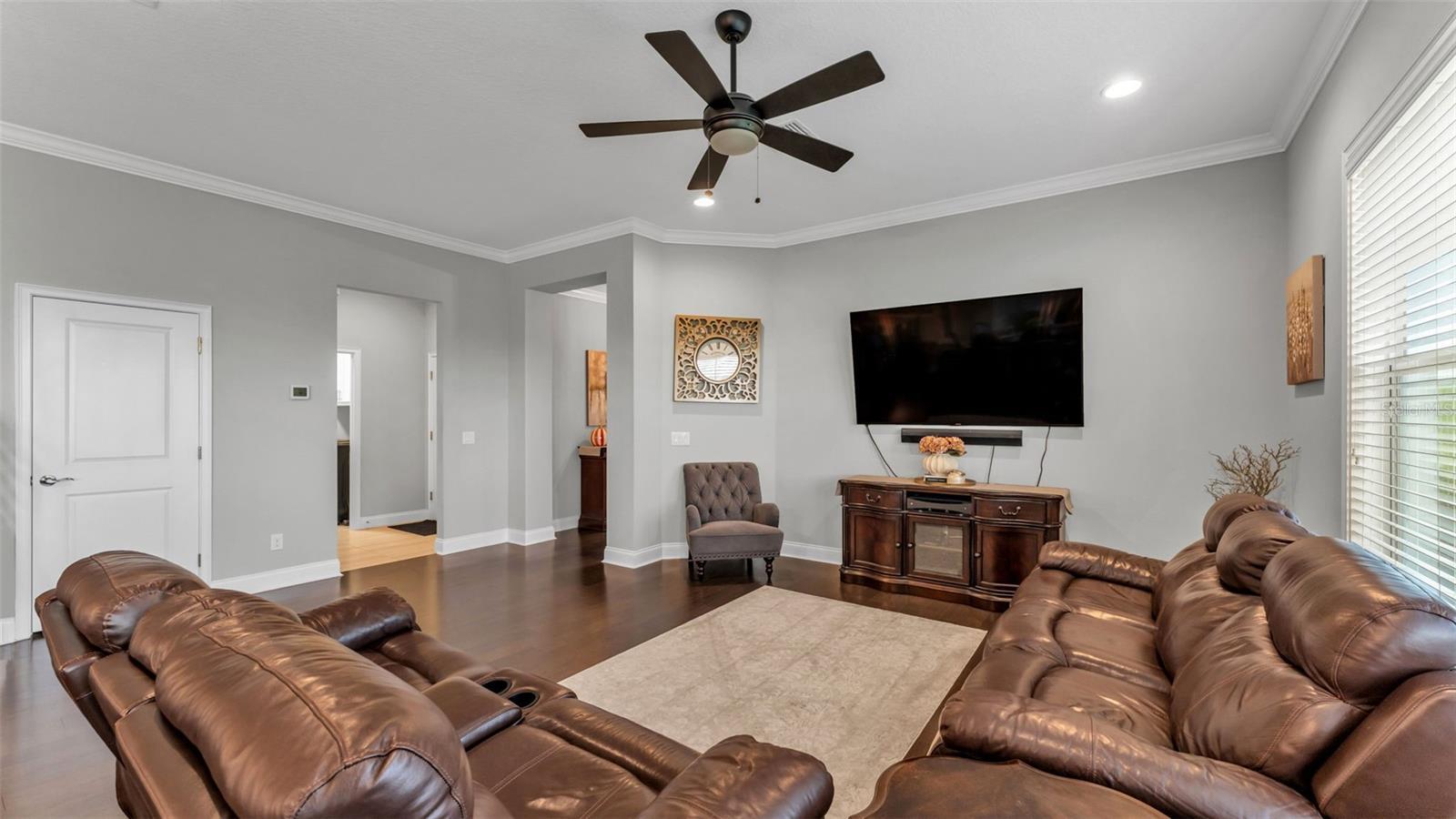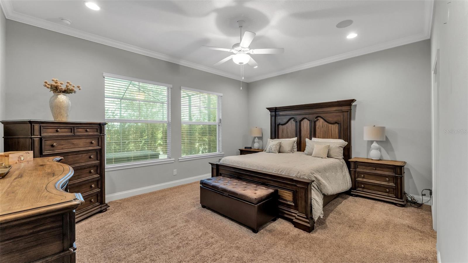 - Ceiling Fans(s), Crown Molding, Eat-in Kitchen, Kitchen/Family Room Combo, Primary Bedroom Main Floor, Solid Surface Counters, Solid Wood Cabinets, Thermostat, Walk-In Closet(s), Window Treatments
