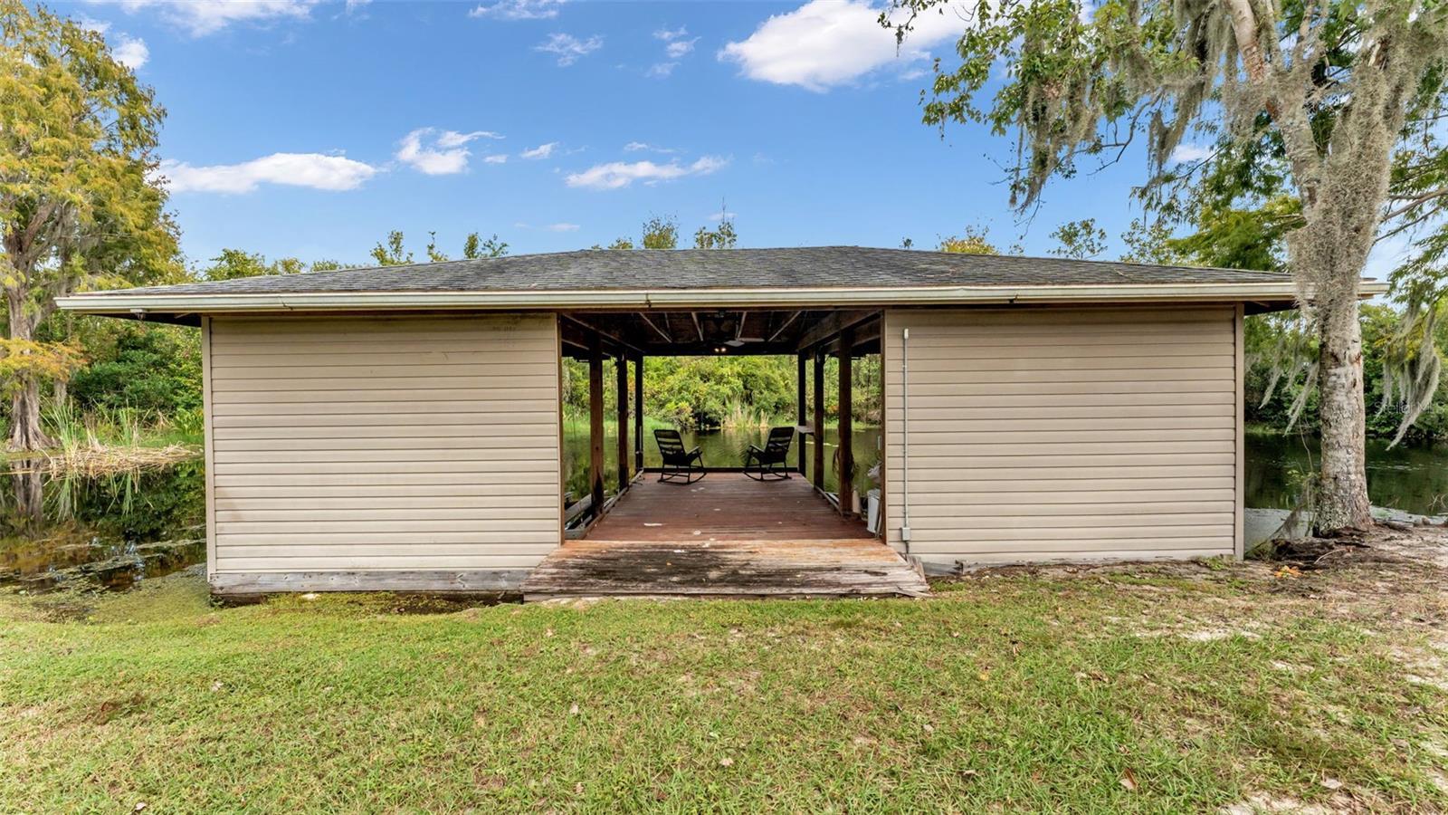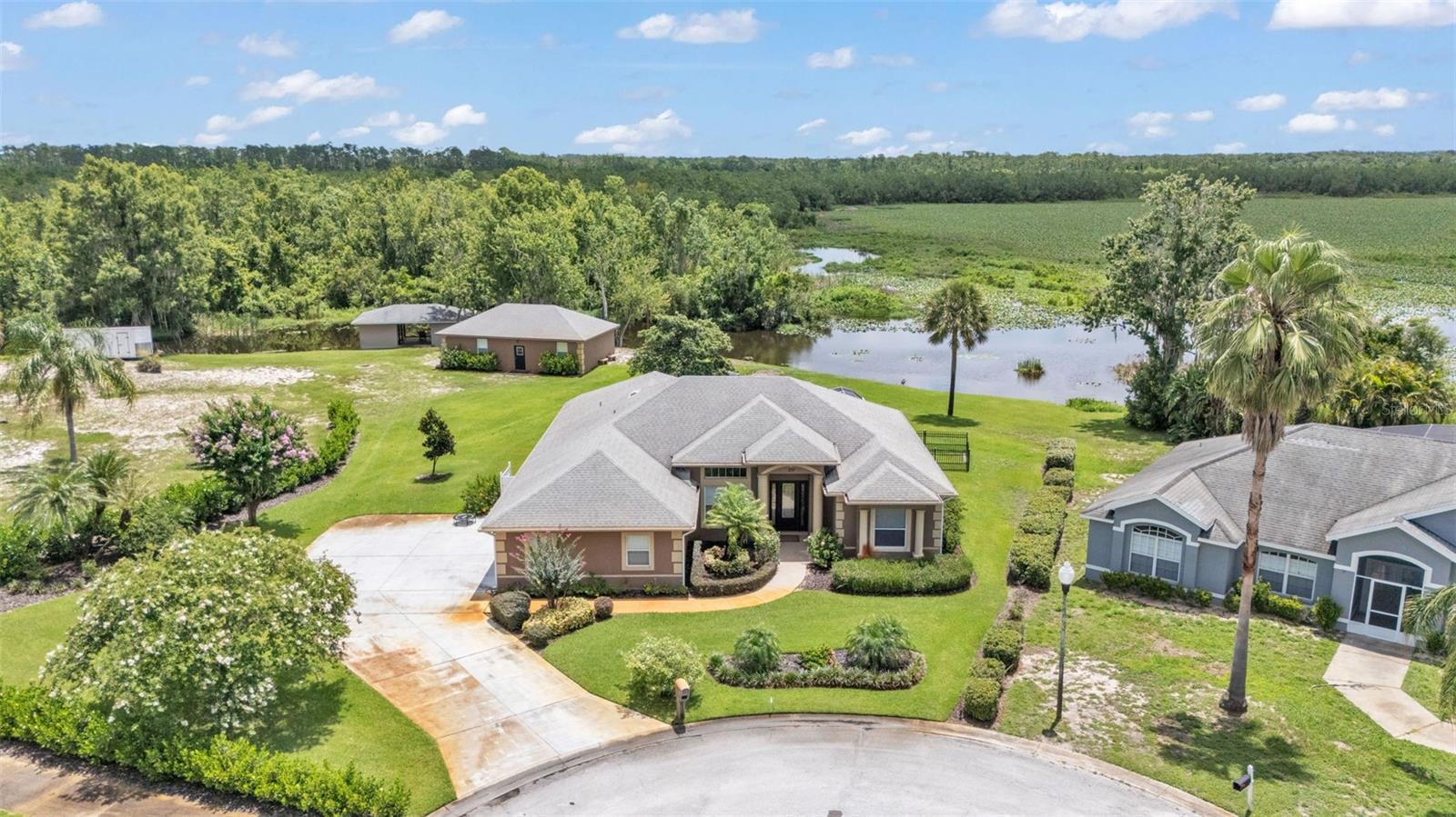 One or more photo(s) has been virtually staged. Are you looking for a completely remodeled lakefront home on 5 acres? Then look no further! The home has a screened in back patio, a separate air conditioned 2 car garage/workshop as well as an attached 2 1/2 car garage with the 1/2 being a golf cart garage, a separate boathouse with lift and much more! The home has beautiful lake views, direct lake access and is a venerable fisherman's paradise! This remarkable home was recently remodeled featuring new plumbing and electrical, Maytag washer and dryer purchased in 2025. In the bathrooms there are new upgraded fixtures, a tankless water heater in the master bath, stone flooring and stone tile in the showers, glass around the showers, champagne gold deluxe new shower heads, new mirrors with custom frames and a stand-alone tub. In the dinette/breakfast nook there is a custom dry bar with 2 kitchen aid wine refrigerators and new custom cabinets in laundry room. All of the bedrooms feature new paint and, custom closets made by CLOSETS BY DESIGN and deluxe recess lighting in all rooms. The kitchen has all KITCHEN AID appliances; quartz countertops, a motion activated sensor Faucette, a wolf steam oven and the cabinets are made of maple and creamy glaze maple all made by A. WARD cabinets with under counter lighting and receptacles! Where there isn't tile, the home has all new luxury vinyl plank flooring, new paint and lighting fixtures throughout as well as custom remote-controlled blinds throughout the house. Outside the home has new landscaping and the boathouse has been rewired. Don't miss out on this unique opportunity in central Florida!
