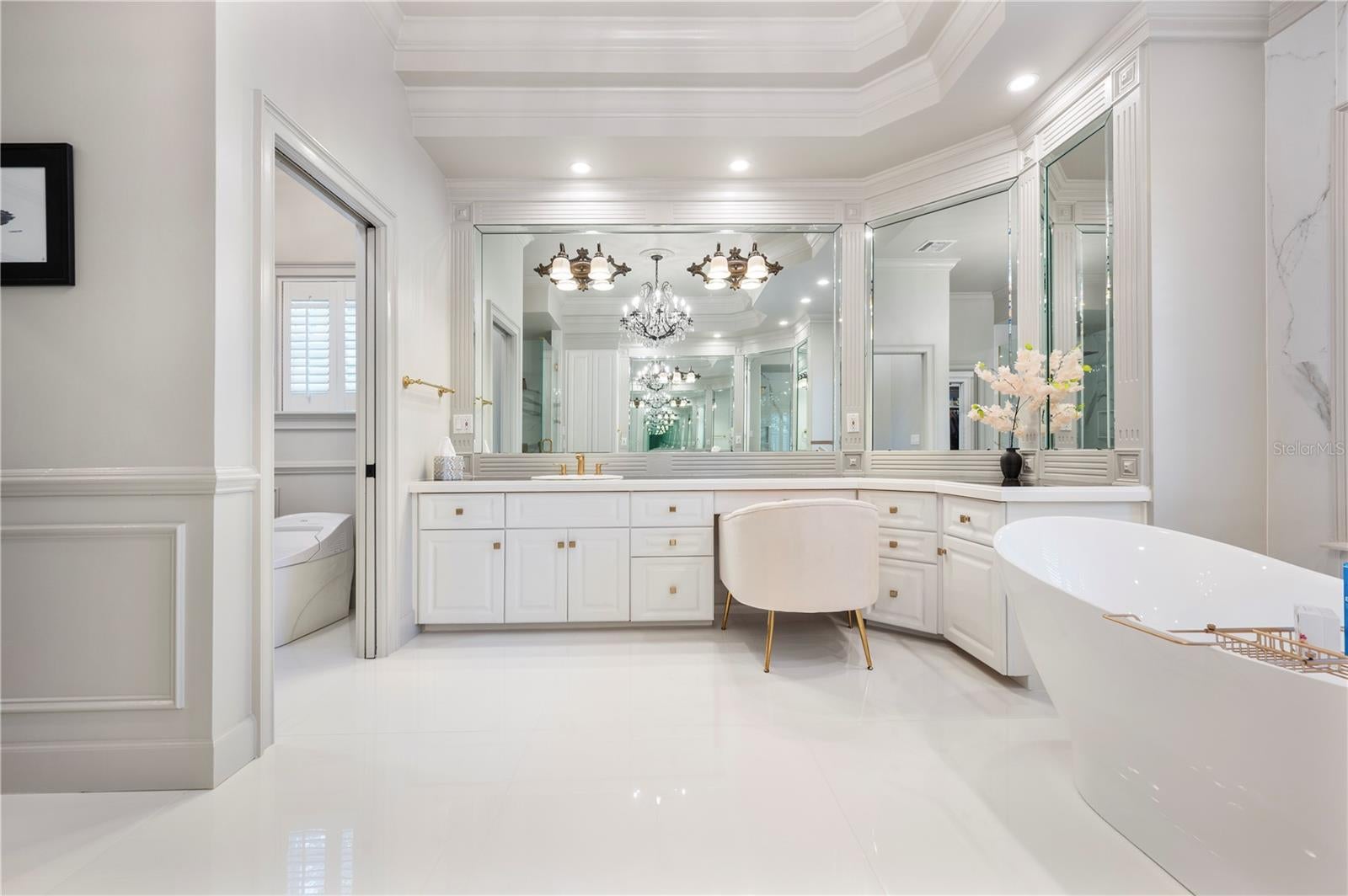 - Built-in Features, Ceiling Fans(s), Chair Rail, Coffered Ceiling(s), Crown Molding, Eat-in Kitchen, Primary Bedroom Main Floor, Solid Surface Counters, Solid Wood Cabinets, Split Bedroom, Stone Counters, Thermostat, Tray Ceiling(s), Walk-In Closet(s)