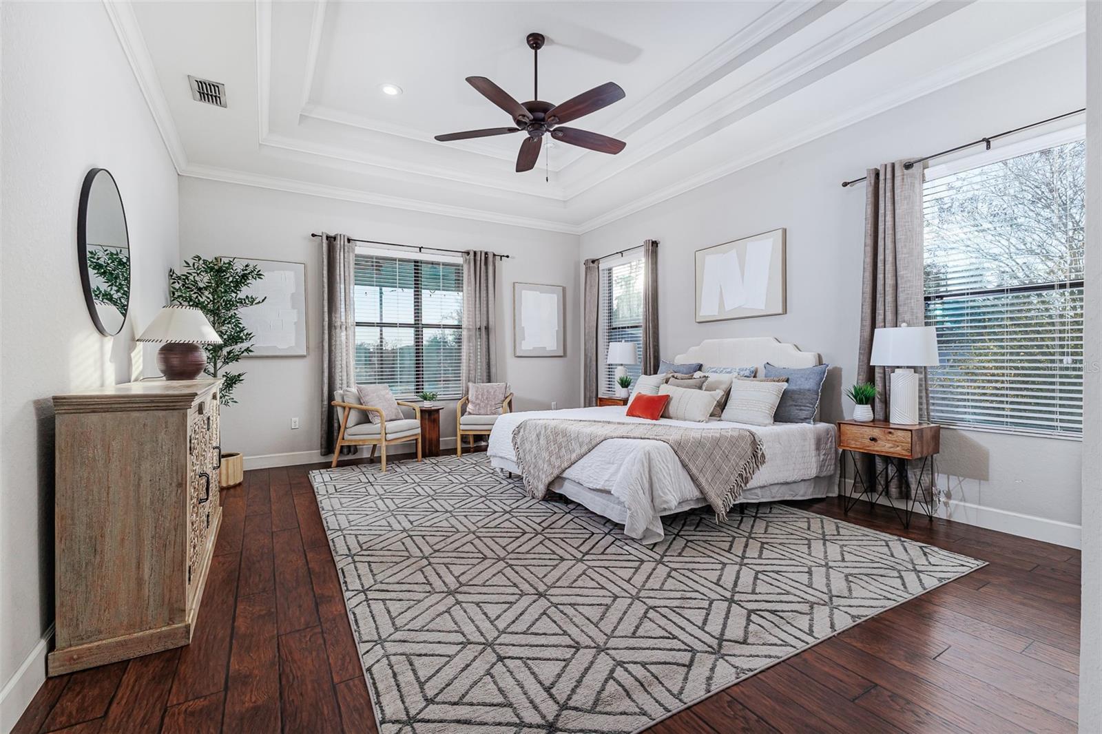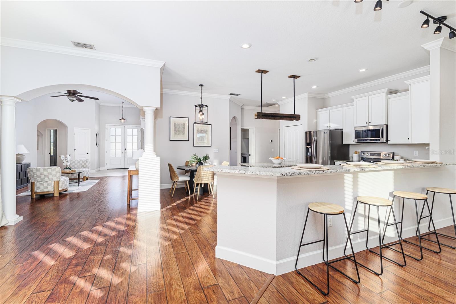 - Ceiling Fans(s), Crown Molding, Eat-in Kitchen, High Ceilings, Kitchen/Family Room Combo, Solid Wood Cabinets, Split Bedroom, Stone Counters, Tray Ceiling(s), Wet Bar, Window Treatments