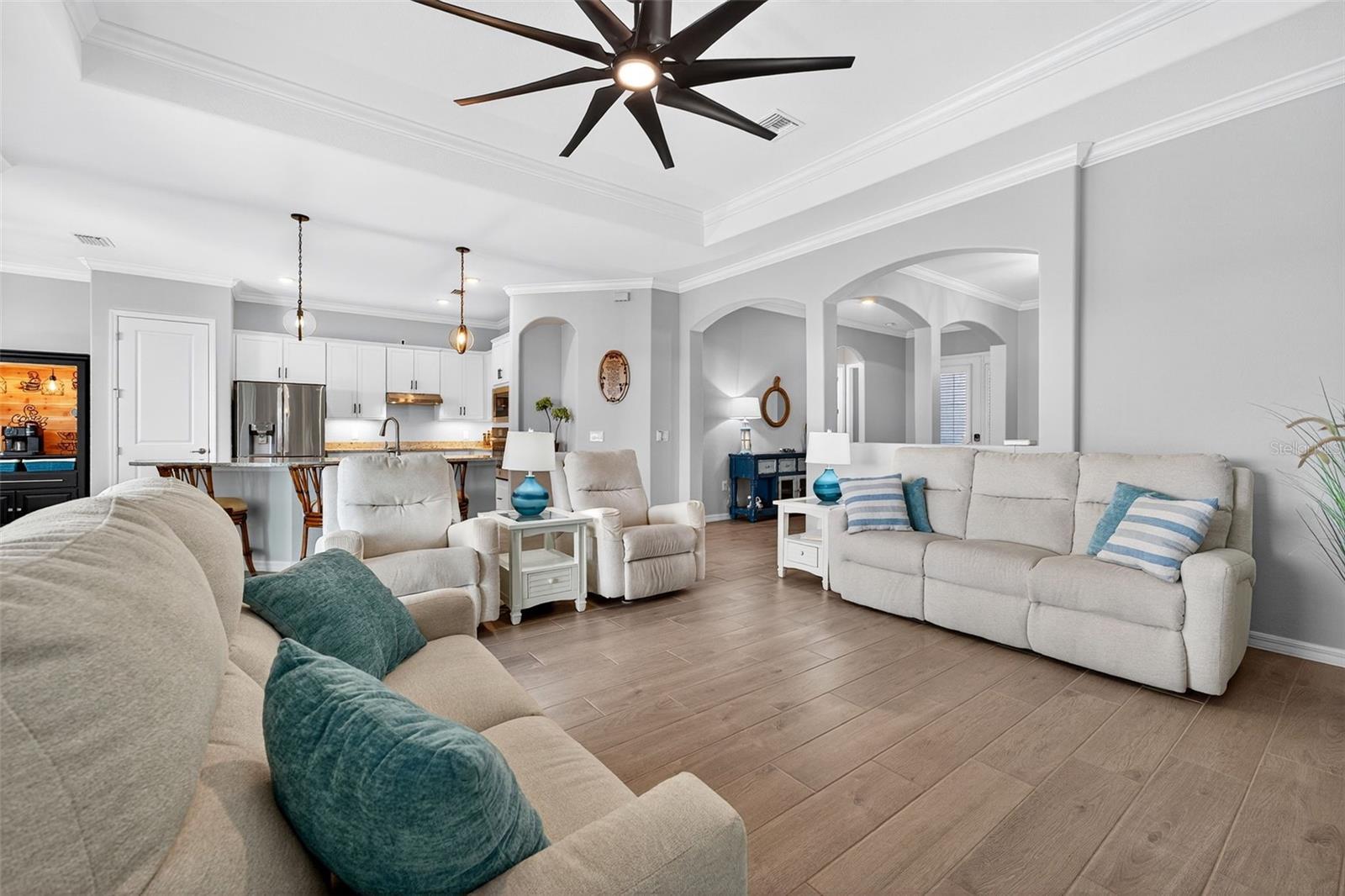 - Ceiling Fans(s), Crown Molding, Eat-in Kitchen, High Ceilings, Kitchen/Family Room Combo, Open Floorplan, Primary Bedroom Main Floor, Smart Home, Solid Surface Counters, Split Bedroom, Thermostat, Walk-In Closet(s), Window Treatments