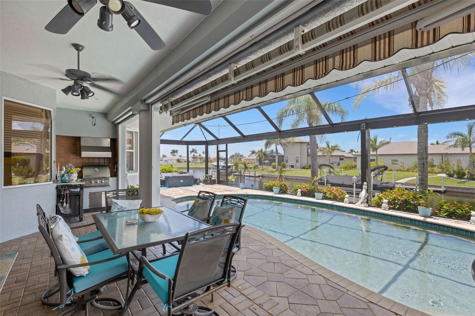 Welcome to this custom-built masterpiece, perfectly situated on a sailboat-access saltwater canal in the highly sought-after Punta Gorda Isles. Only 15 minutes to Charlotte Harbor through Buckley Pass. Boasting 3 spacious bedrooms, 2.5 baths, and 2,302 square feet of thoughtfully designed living space, and a large heated pool, this home offers the ideal blend of comfort, elegance, and coastal living. NEW metal roof in 2023. NEW A/C in 2021, including fully air conditioned garage. NEWLY painted inside and out. NEW 10,000 lb boat lift motor. NEW pool heater and pump in 2023. NEW lanai with panoramic screens in 2023. Hurricane shutters are fully automatic. Whole house vacuum. Inside, you'll be captivated by the bright and airy open floor plan, highlighted by soaring ceilings, expansive windows, and abundant natural light. The great room design seamlessly connects to a formal dining area and a chef’s dream kitchen—complete with granite countertops, a breakfast bar, recipe desk, closet pantry, and ample counter space to satisfy even the most discerning culinary enthusiast. The split-bedroom layout provides privacy and convenience. Retreat to the luxurious primary suite, featuring tray ceilings, private access to the lanai, dual walk-in closets, and an elegant ensuite bath with dual vanities, a water closet, soaking tub, and a separate walk-in shower. The generously sized guest bedrooms also have walk-in closets, high ceilings, and ceiling fans for added comfort. Step outside to your private waterfront oasis. The expansive screened lanai, newly built in 2023 with panoramic screens, features over 1,120 square feet of outdoor living space adorned with brick pavers. Enjoy year-round entertaining with a 335-square-foot covered area that includes an outdoor kitchen, built-in grill, outdoor shower, pool storage, and convenient access to the pool bath. The heated pool is the perfect spot to relax and unwind while taking in the tranquil canal views. Boaters will love the extended 45-foot concrete dock equipped with a brand-new 10,000 lb boat lift—just steps from your back door. Additional highlights include a two-car garage, energy-efficient AC with a heat recovery system, a state-of-the-art security system, and electric roll-down hurricane shutters for peace of mind. This exceptional property is a true Florida dream—offering luxury, lifestyle, and direct access to Charlotte Harbor and beyond. Don't miss your opportunity to own this waterfront gem!