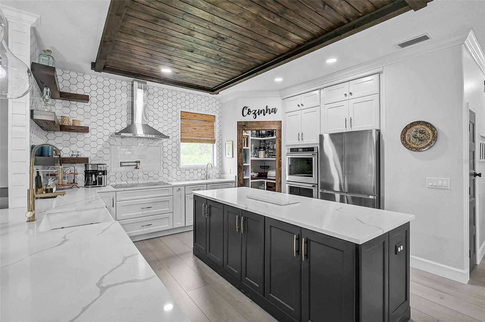 - Cathedral Ceiling(s), Ceiling Fans(s), Coffered Ceiling(s), Crown Molding, Eat-in Kitchen, High Ceilings, Open Floorplan, Solid Surface Counters, Solid Wood Cabinets, Split Bedroom, Stone Counters