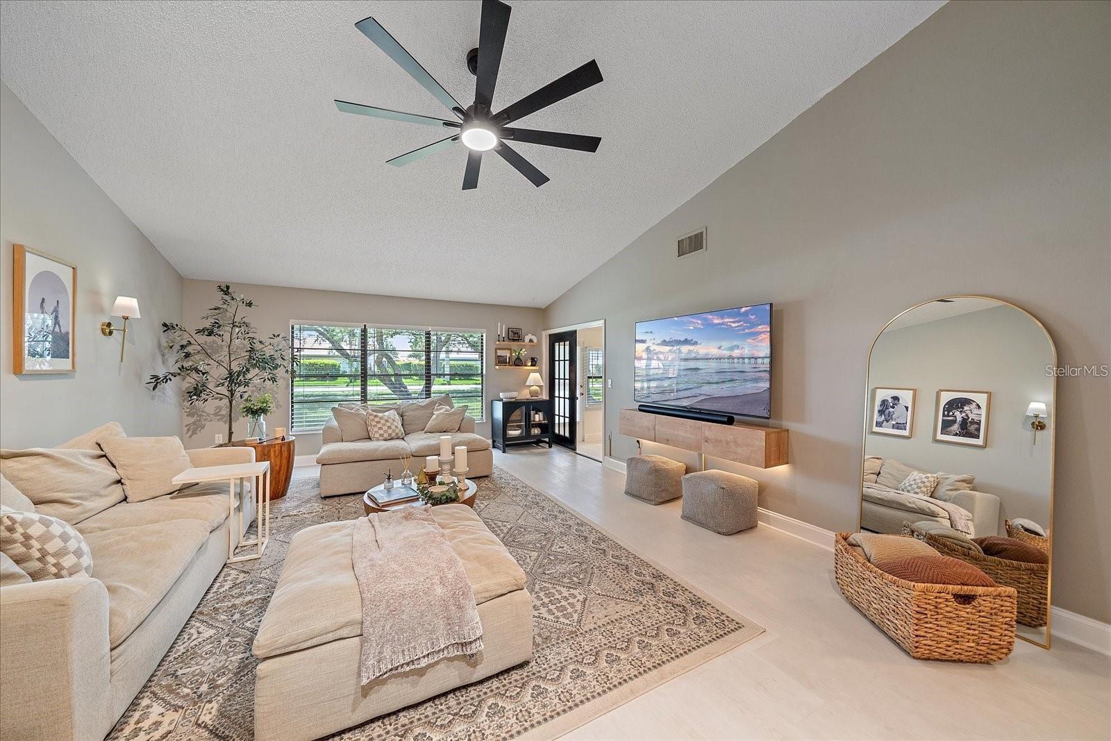 - Ceiling Fans(s), High Ceilings, Living Room/Dining Room Combo, Open Floorplan, Vaulted Ceiling(s), Window Treatments