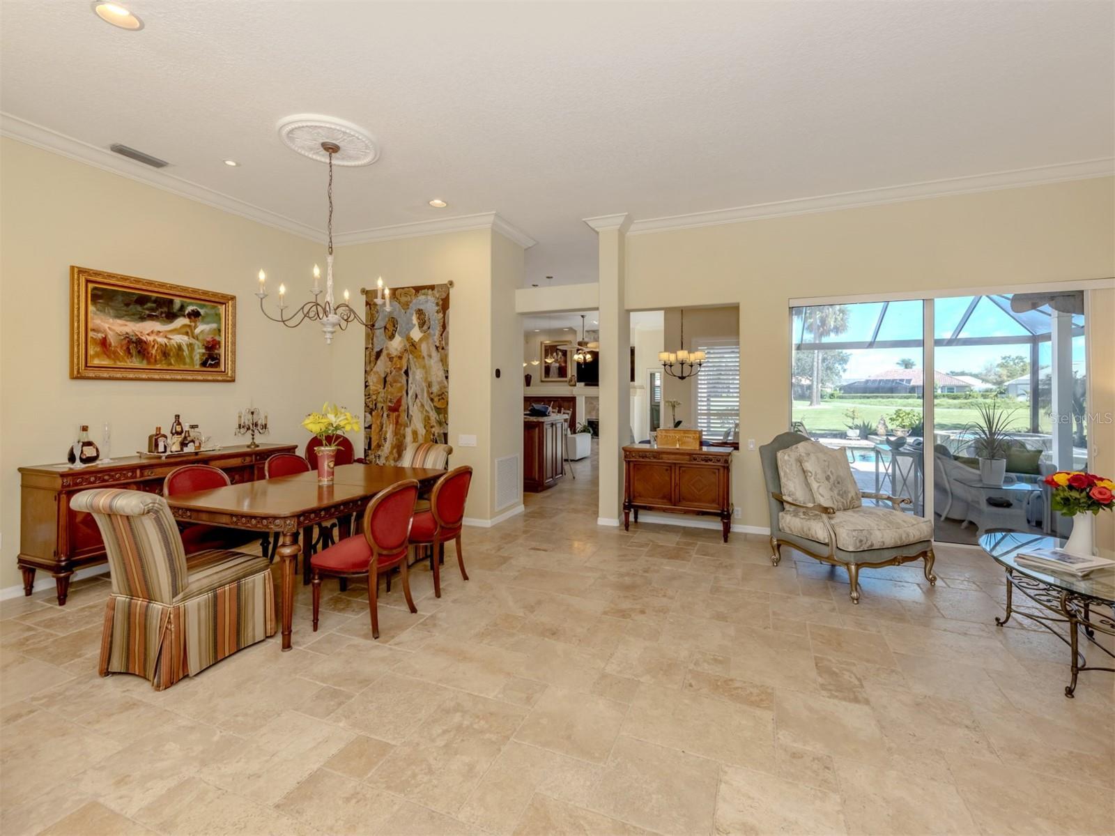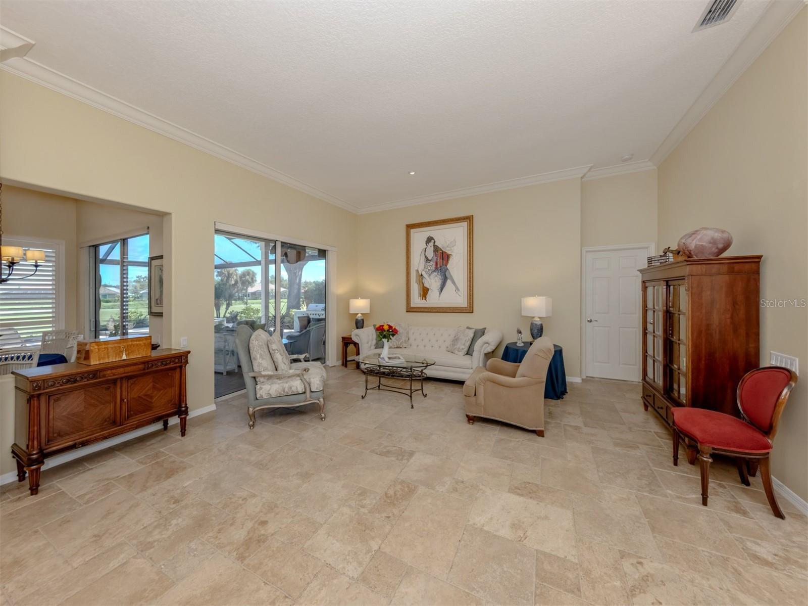 Under contract-accepting backup offers. One of the best of the best in the private, member-owned Venice Golf and Country Club with a golf membership available. Nestled in this prestigious golf course community, the impeccably maintained residence offers the perfect blend of comfort, style and refined living on a quiet street. With a thoughtfully designed layout, beautiful finishes and tranquil outdoor spaces, this home provides a serene escape without sacrificing convenience. Highlights of the lanai include travertine floors, a refinished saltwater heated pool and spa, clear-view screening for unobstructed golf course and water views, and a summer prep kitchen, plus the covered area is enhanced with a cedar wood ceiling creating an inviting ambience for relaxation and entertaining family and friends. The open kitchen and family room are sure to please with its propane gas fireplace, built-ins and a feature wall. Custom cherry cabinetry complimented by exotic onyx countertops set the stage for this chef’s kitchen with Sub-Zero and Wolf appliances. Adjacent to the kitchen is the laundry room with a new wine refrigerator and coffee bar. Unwind in the serene primary suite featuring a spacious walk-in closet with custom espresso wood built-ins designed for effortless organization. The spa-inspired ensuite bath offers double vanities, a Jacuzzi slipper tub perfect for relaxing soaks, a separate shower and a dedicated linen closet. For family and guests, there are three more bedrooms with shared bath plus a pool bath. Plantation shutters and crown molding add timeless elegance and privacy throughout the home. The three-car garage features a new epoxy floor and garage door openers. Additional recent updates include new landscaping, a pool and well pumps, driveway pavers power-washed and resealed, water softener that is two years old, AC system one year old and a new water heater in 2025. Discover the unparalleled lifestyle of The Venice Golf and Country Club where extraordinary living begins. Recently reimagined, the expanded clubhouse features a spacious gathering bar, gourmet and commercial kitchens and a cozy fire pit. The new state-of-the-art wellness center offers massage therapy, fitness classes, yoga, physical therapy and personal training, providing a holistic approach to health and well-being. Beautifully renovated Ted McAnlis-designed 18-hole championship golf course. Residents also enjoy Har-Tru tennis courts, pickleball, bocce ball, and a Junior Olympic-sized pool and spa, balancing active living with relaxation. As a Geo-Certified Audubon Cooperative Sanctuary, VGCC embraces environmental stewardship and sustainability. With an A+ financial rating, the community is as solid as it is serene. Ideally just minutes from airports, shopping, dining, Interstate 75, cultural venues and Wellen Park. It's also a short drive to the charming Venice Island, where 14 miles of pristine beaches meet the sparkling Gulf Coast.