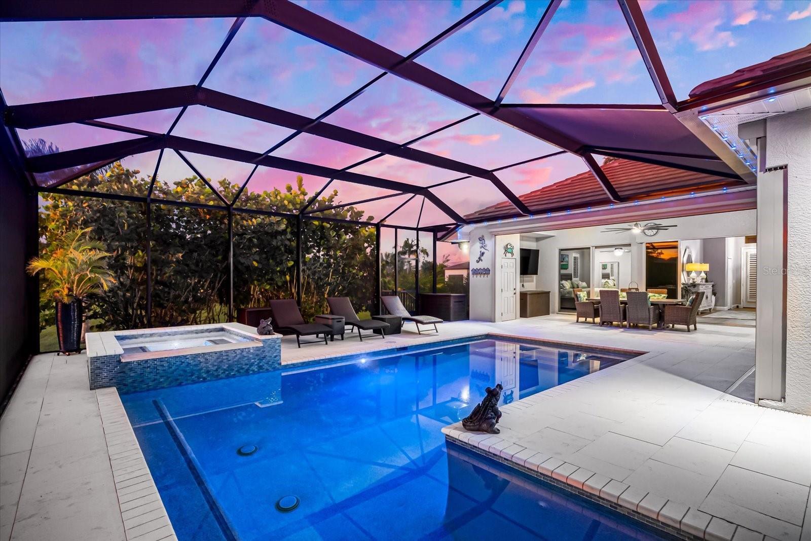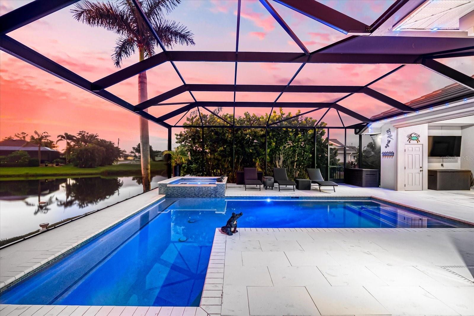 Better than new waterfront pool home in Burnt Store Lakes! This updated 3BR/3BA home offers 2,225 sq ft, a 3-car garage, and stunning sunset lake views. Features include 12’ ceilings, coffer lighting, new porcelain tile flooring, quartz kitchen with 2023 stainless appliances, and 90-degree pocket sliders opening to the expansive lanai. Enjoy a new saltwater pool & spa (2024), picture-window cage, and 1,500 sq ft of limestone pavers. Recent upgrades: roof 2023, HVAC 2022, interior/exterior paint, 5” baseboards, plantation shutters, remodeled baths (2023), Storm Smart shades, accordion shutters, new hot water heater (2025), pool pump (2025), irrigation pump (2025), landscape lighting, and hurricane-rated garage doors. Move-in ready and minutes from Burnt Store Marina. Adjacent lot available separately.