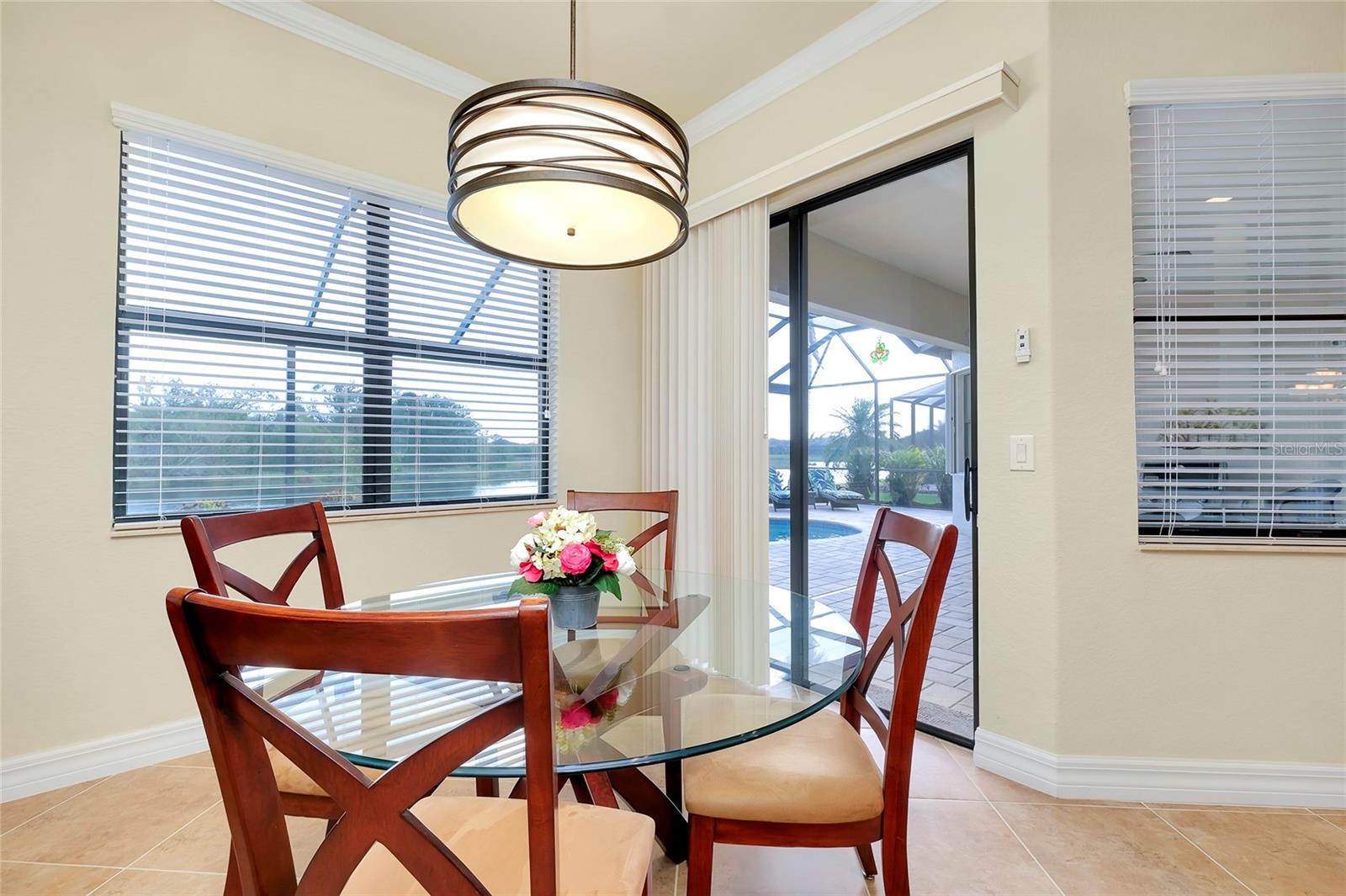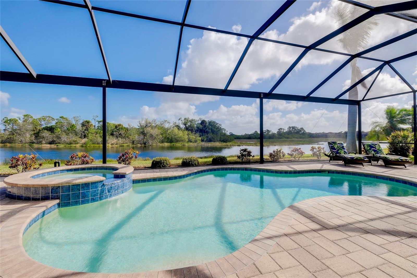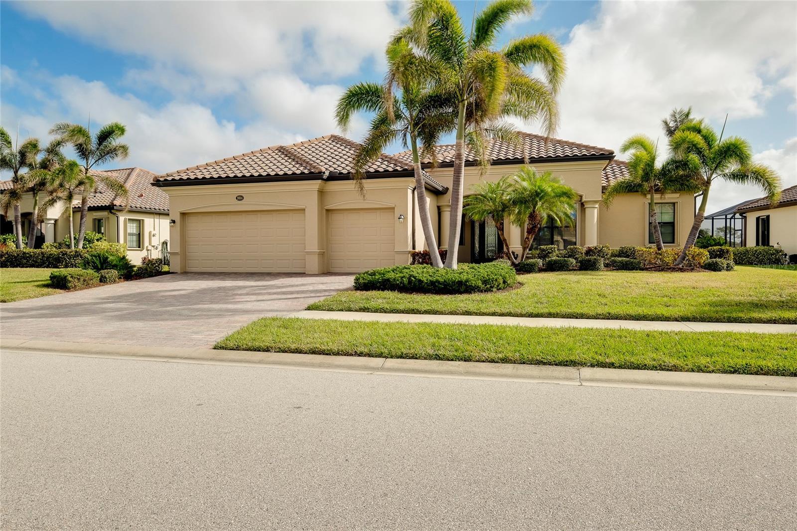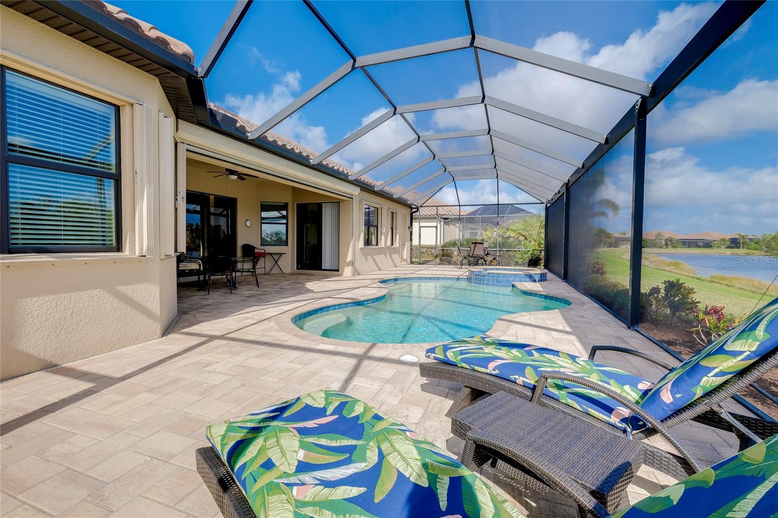 Under contract-accepting backup offers. Built on a premium full lake view lot, this immaculate luxury home includes a custom designed pool and spa, study or 4th bedroom and the 3 car garage. Beautiful finishes, cabinetry and attention to detail makes this meticulously maintained estate home an exceptional property. Leaded glass entry doors open into the great room to an amazing lake and lush vegetation view through the triple sliders. The pool cage has the scenic-view screening and the large lanai with sealed pavers allows for entertaining. Great privacy and so relaxing! The heated salt-water pool includes auto fill to maintain the proper level year round, pop up cleaning jets, lighting and attached heated spa. The pool pump, filter, housing and cage screening is all new. The lanai has access to the pool bath. The Oakmont model offers a split floor plan with an open concept living area, tray ceilings, crown moldings, and ceramic tile floors in main areas. The beautiful kitchen has granite countertops, stainless steel appliances, cooktop, detailed wood cabinetry, a raised bar plus a dinette area looking out to the lake. Safety features include hurricane locking accordion shutters for the windows, Kevlar automated screens on front entry and covered lanai area and a security system. The primary bedroom has access to the pool area, large walk in closet, en-suite bath with 2 separate vanities, a Roman walk in shower and a soaking tub. The front bedroom is currently used as an office. The remaining 2 bedrooms are on the other side of the home with a full bathroom plus the 1/2 bath for the pool area. The laundry room has built in cabinetry and a sink and leads to the 3 car garage. The garage has been upgraded with an epoxy finished floor, a workshop and pull down stairs to storage attic area. New AC unit and air purification system installed in April 2025. The gated community of Gran Paradiso has a low HOA fee that includes lawn care, irrigation, cable, internet and use of the community amenities: a resort-style swimming pool, clubhouse, gym, tennis/pickleball courts, playground and full time activity director. Conveniently located to Venice beaches, airports, hospitals and schools, Wellen Park and the Atlanta Braves Spring Training facility. Furniture is available under separate contract. Move-in ready, perfect for snowbirds as well.