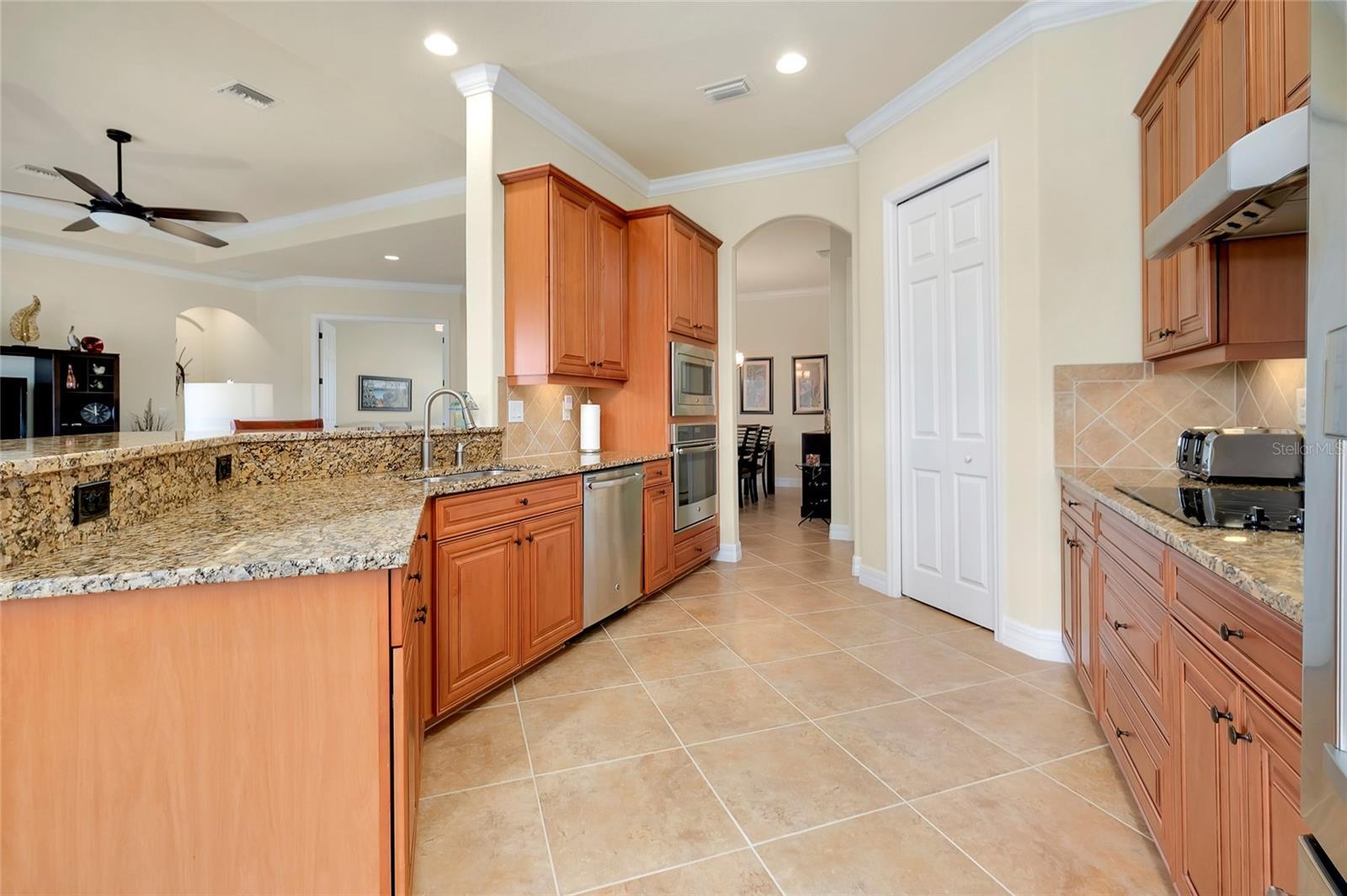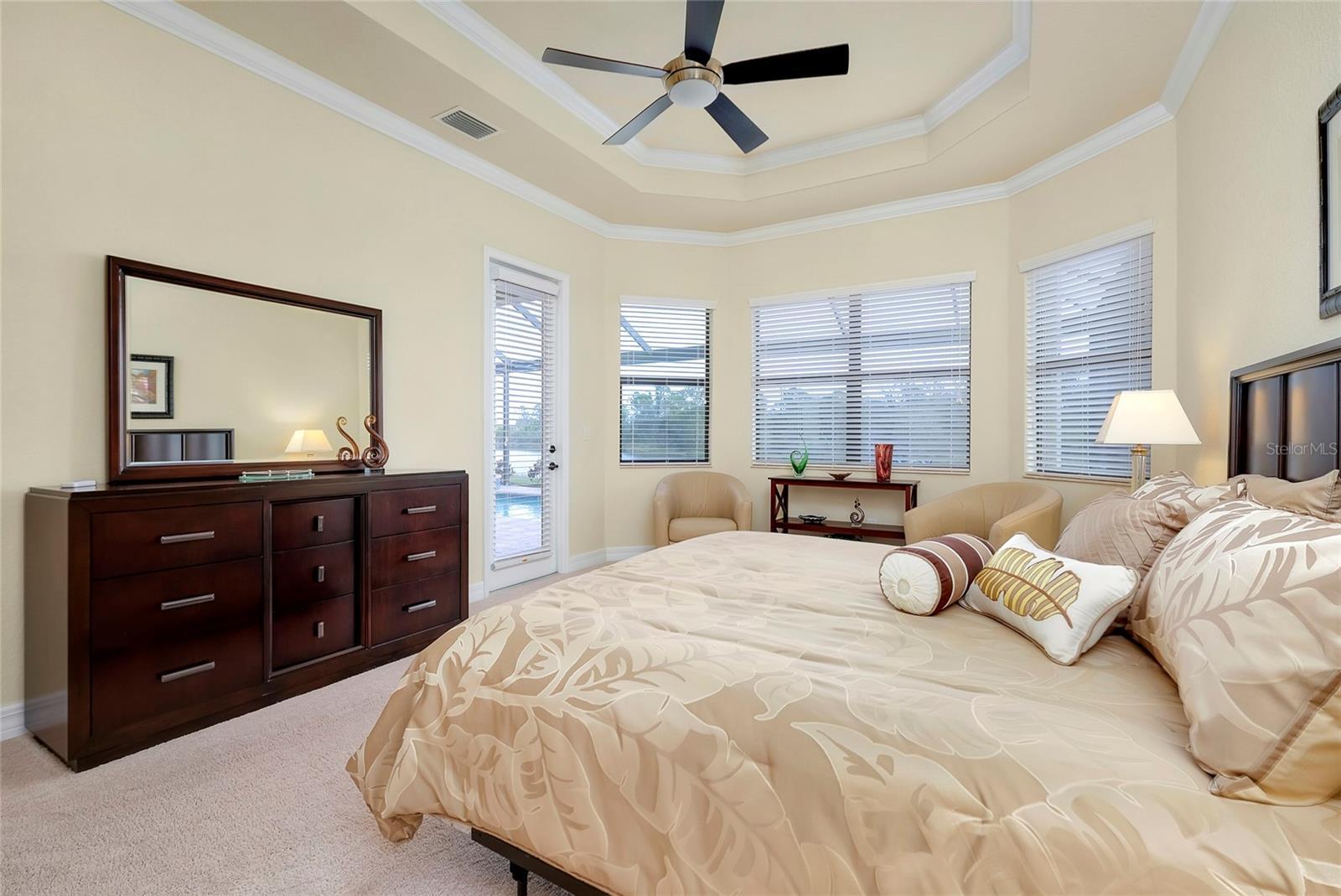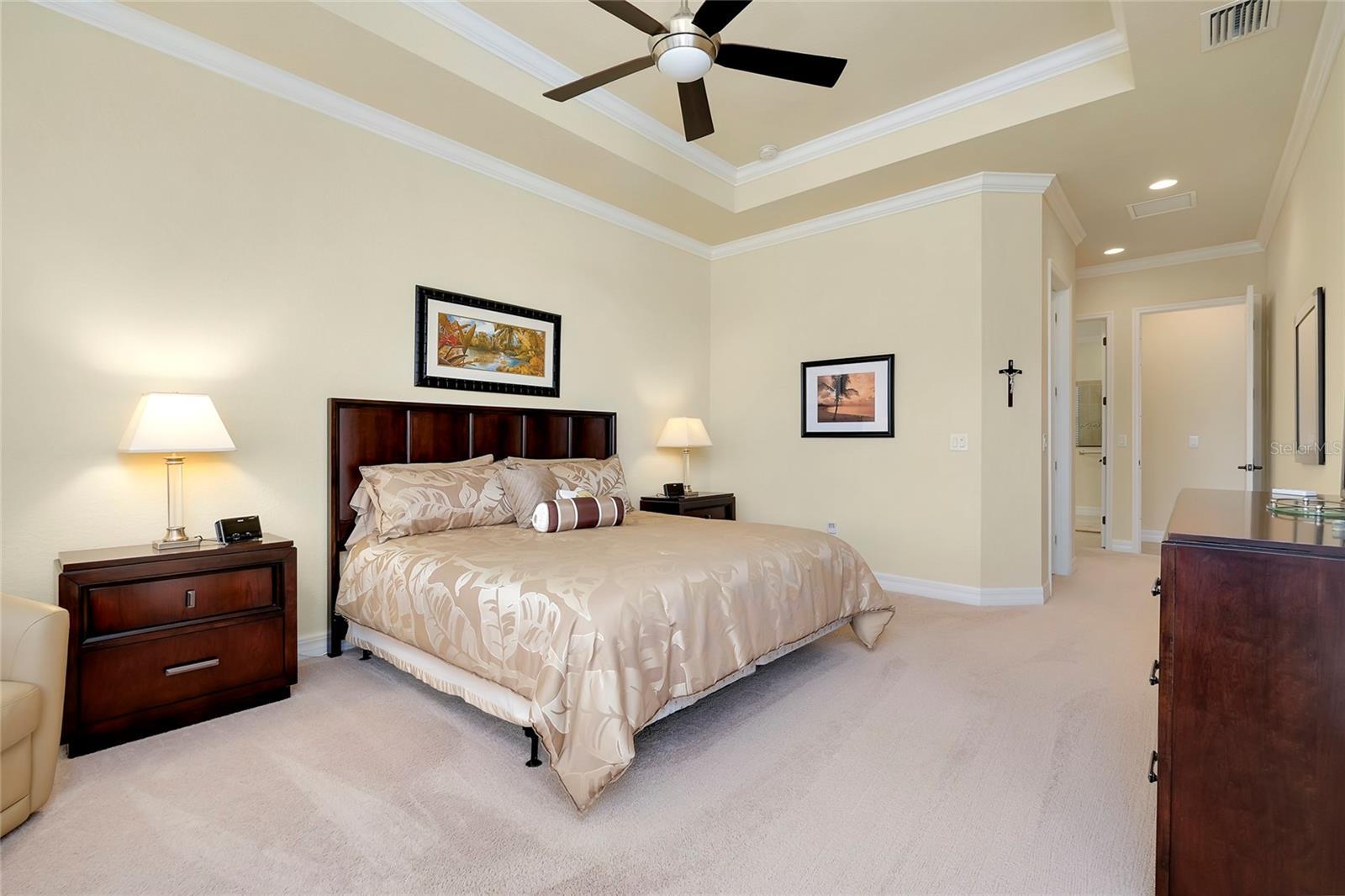 - Ceiling Fans(s), Crown Molding, Eat-in Kitchen, High Ceilings, Open Floorplan, Primary Bedroom Main Floor, Solid Wood Cabinets, Split Bedroom, Stone Counters, Thermostat, Tray Ceiling(s), Walk-In Closet(s), Window Treatments