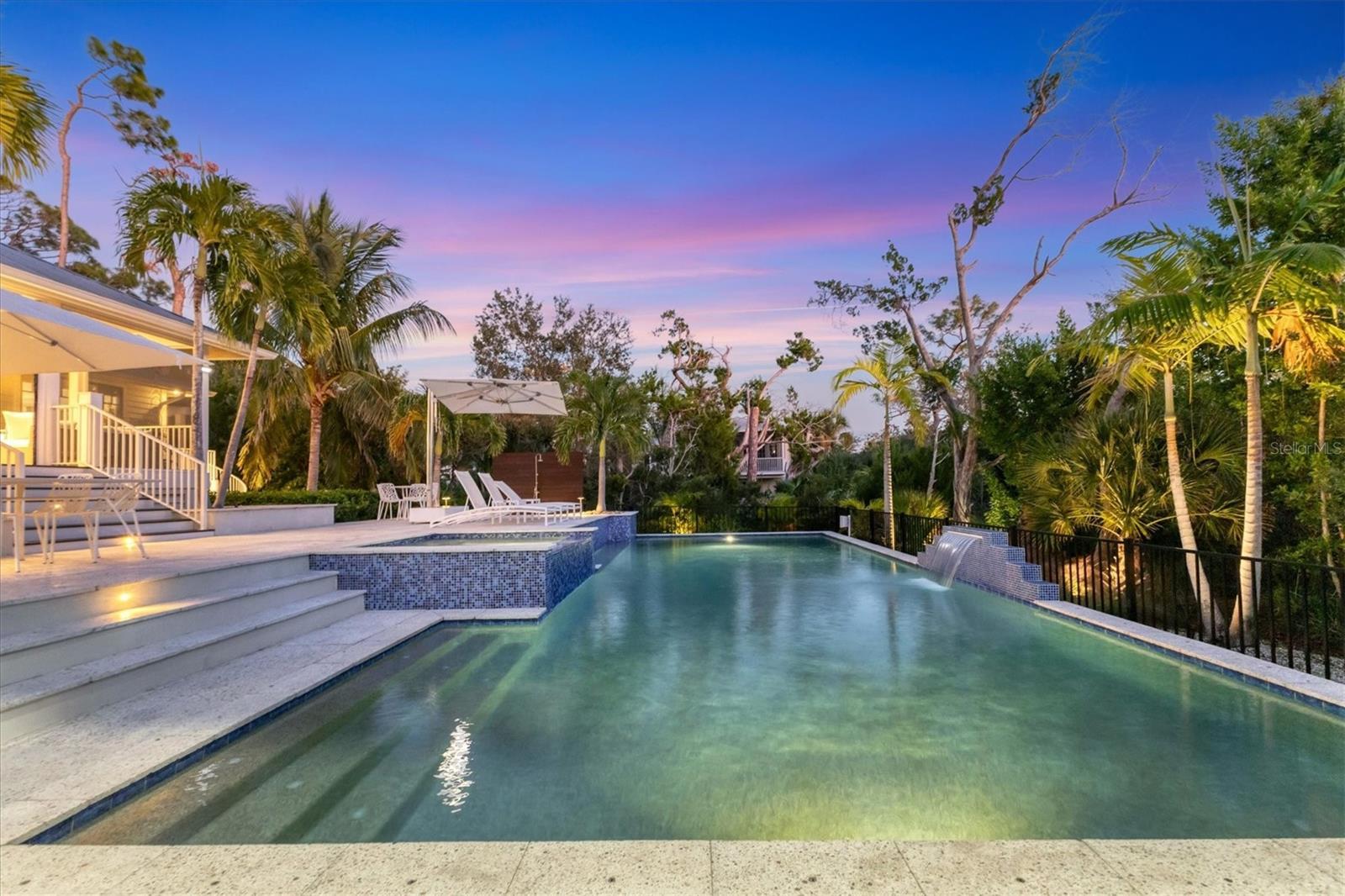 Welcome to Eagle Point Club! This is a community embedded in the rich history of Venice dating from the 1920's. This home is held as the pinnacle of luxury and holder of the well-earned title: 2019 SRQ Home of the Year Platinum Winner. The home is nestled on just under half an acre of property embraced by lush landscaping on all sides with detail in mind down to the coconut trees exemplifying the tropical motif. The circular driveway allows ease of access into and out of the property with private parking spaces to add to the convenience for your guests. This home was fastidiously renovated by Edgewater Contractors in 2017. One's gaze can't help but remark at the expansive open floor plan that emphasizes the soaring ceilings, inviting kitchen, opulent DeChateau wood flooring which guides your attention to the impact resistant sliding glass doors that encapsulate the pool and deck scenery which promise an oasis amidst the Floridian outdoors. The living room makes up the heart of the home and warmly exudes its welcome by the lofty cupola and designer gas linear fireplace embraced by an artistic concrete surround. The kitchen had entertainment in mind when it was designed and thus features a large multi-use island, updated cabinetry, quartz countertops, a paneled Subzero refrigerator, Wolf cooktop, Miele wall oven that features a coffee maker and a built-in buffet for additional storage. The primary bedroom exudes privacy with its own suite mere steps from the living room. It provides a breathtaking view of the exotic backyard with seamless access to a luxurious bathroom featuring dual sinks, glass shower, soaking tub and a sought-after Tahitian inspired outdoor shower. The guest bedrooms also enjoy access to ensuite bathrooms. The second floor is truly remarkable in that it is a full suite complete with a separate family room, built-in bar with refrigerator, bedroom with private balcony and a large bathroom. Truly its own living space for guests and extended family. The screened lanai leading seamlessly, via a fully stacking sliding door, from the living room allows a fully shaded outdoor experience. The lanai includes tongue and groove wood ceiling, Ipe decking, a full outdoor kitchen, and a large pool ready to entertain you and your guests with volume to spare. The saltwater pool showcases a heated spa and at one end of the pool features an artistic wall with a pool shower. The other presents a covered cabana for guests to look on under the shade. The waterfall in the center highlights the overall exotic paradise experience. W Venice Ave shopping and restaurants are merely a golf cart ride away with this home being .6 miles away. Boaters will delight with the assigned boat slip #10. Renovations for such to be completed by an estimated end of December 2025. From the dock, you have a clear path from Roberts Bay, to the ICW and to the Gulf with no bridges to traverse under. Easy access is available from the back of the property via kayak as well. Eagle Point Club amenities include a community dock on Roberts Bay which is a 5-minute boat ride to the Gulf, tennis courts, and well-cared-for grounds. Residents' overflow guests are allowed to rent the 3-bedroom lodging or 4-bedroom clubhouse which is conveniently positioned across the street. Eagle Point Club homes embrace the old Florida charm and are rarely on the market. With no 2 homes alike, this is a wonderful opportunity to own your own slice of Venice history today!